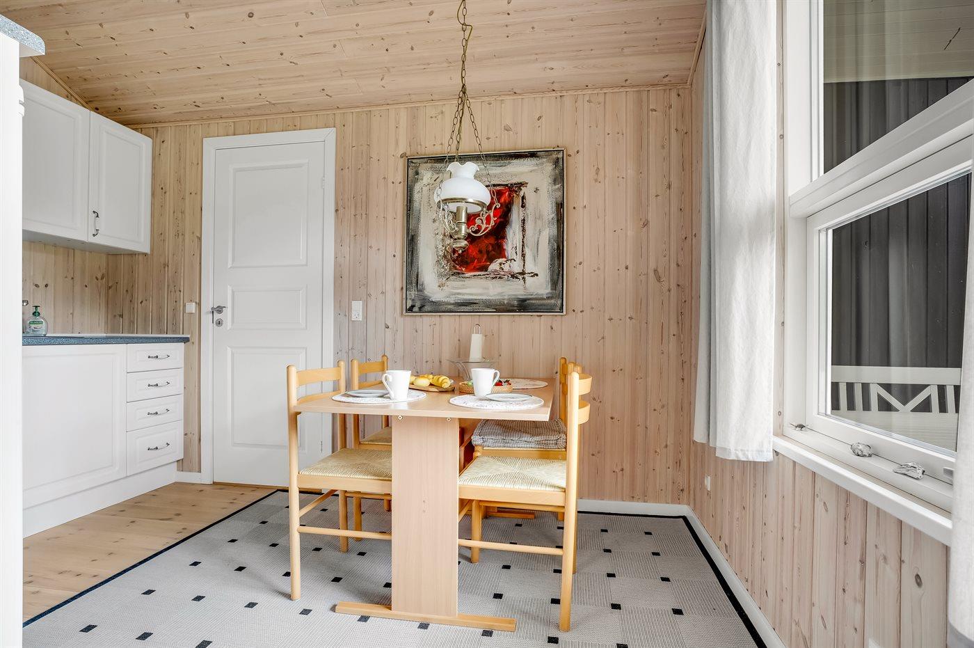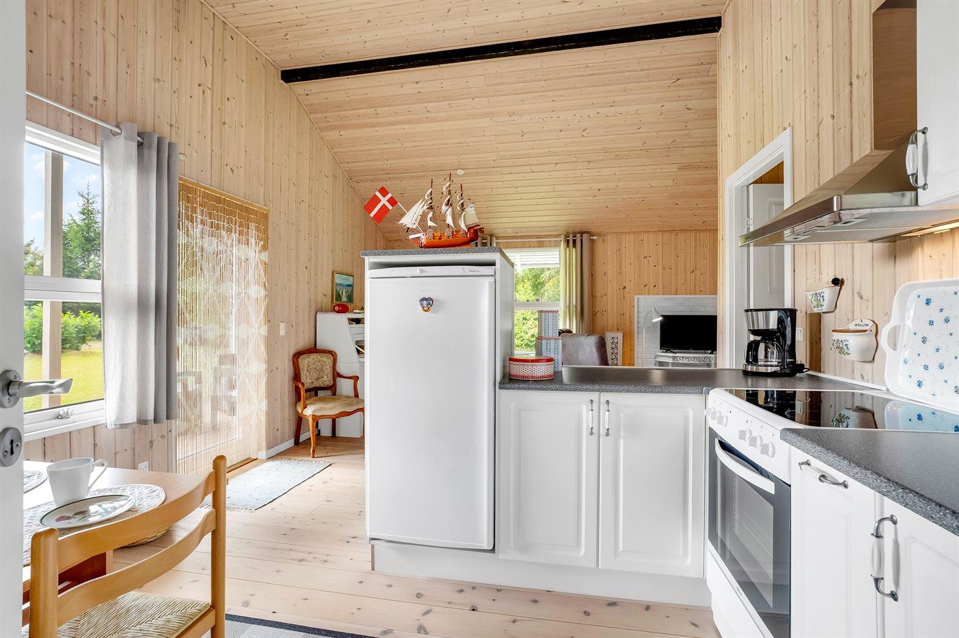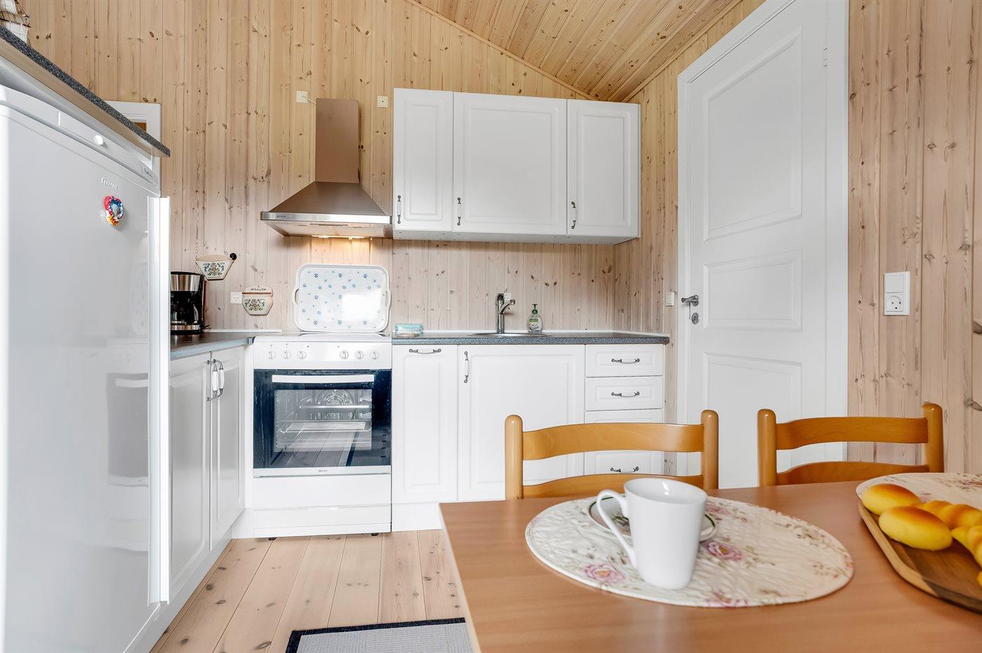 Køkkenet er udstyret med 1 køleskab. Der er 4 keramiske kogeplader, varmluftovn, mikrobølgeovn.