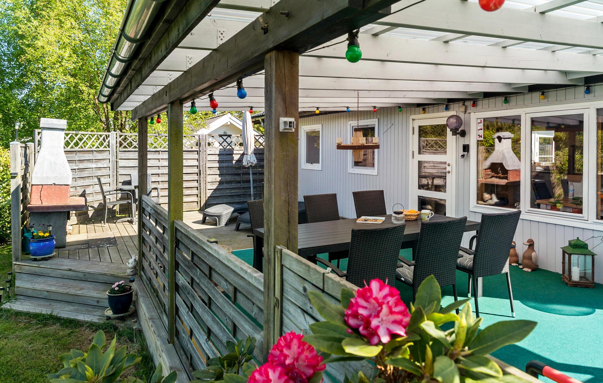 På den delvist overdækkede terrasse kan I se frem til behagelige timer udendørs, for her er der både havemøbler og en grill.