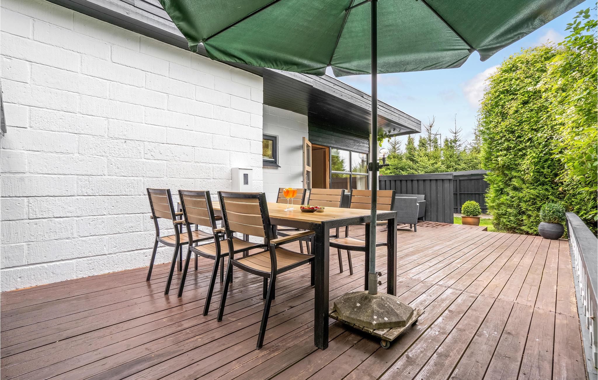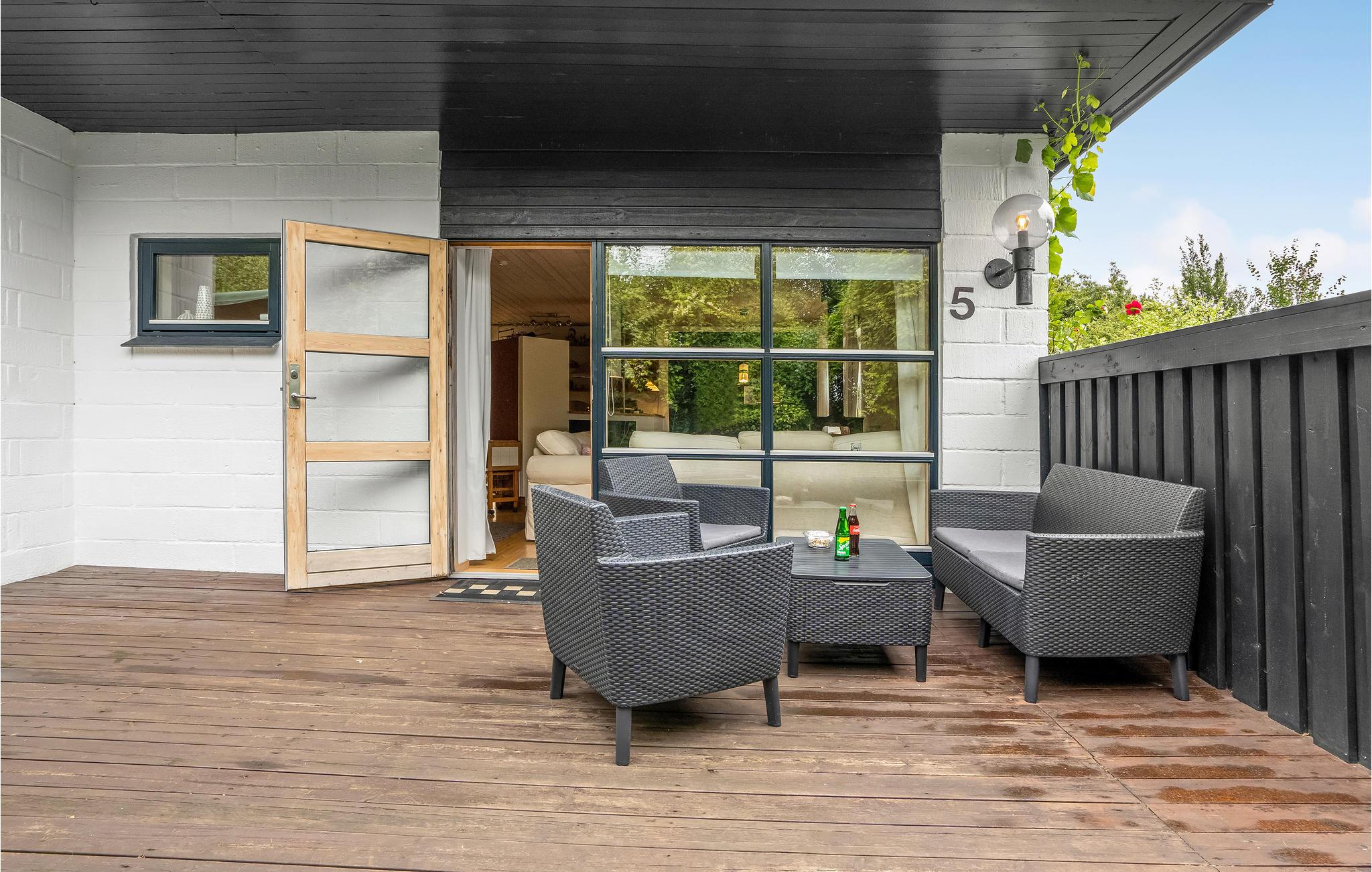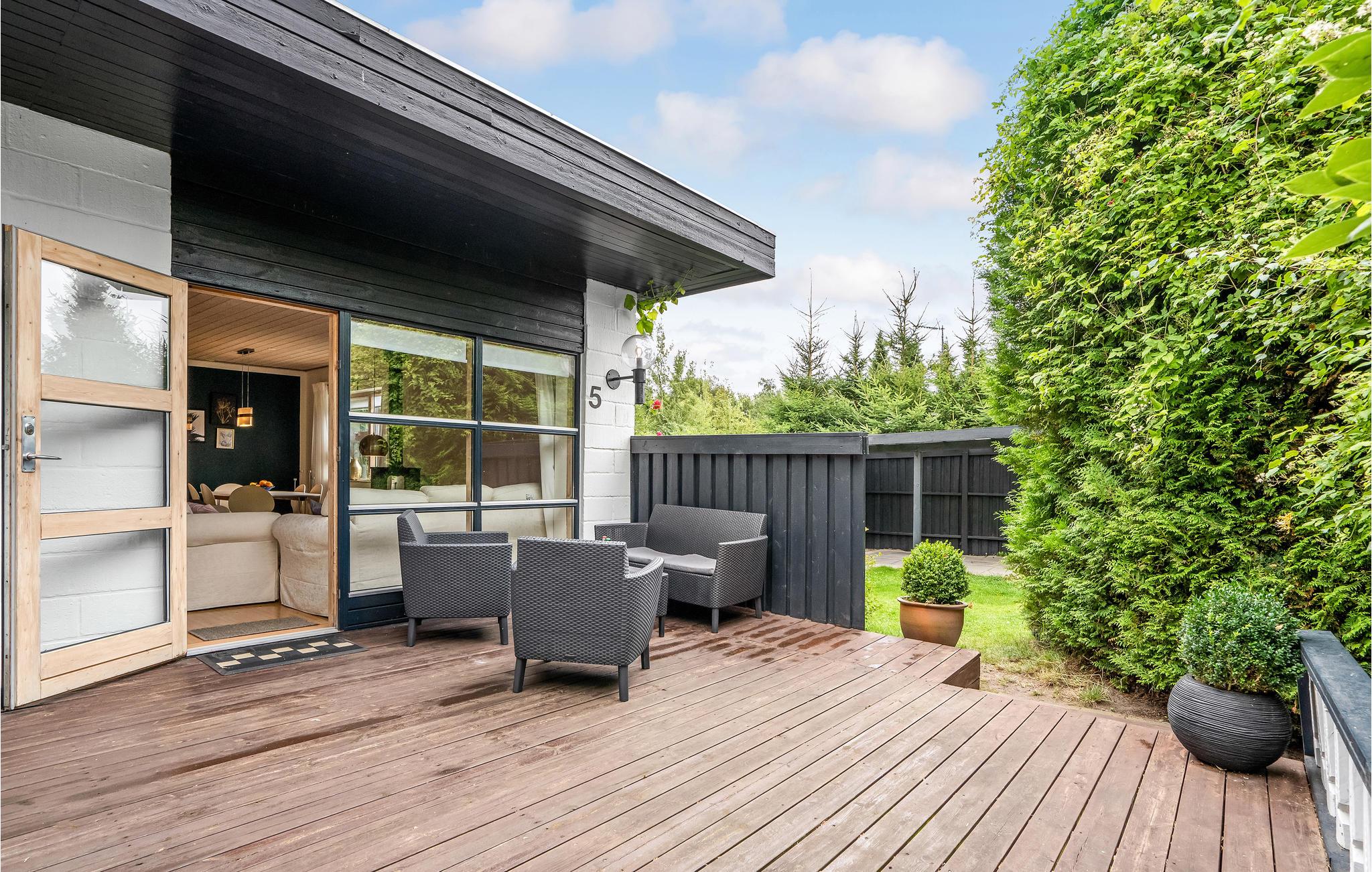 Smagfuldt indrettet stue og åbent køkken. Feriehuset har en stor udestue med terassevarmer. Derudover har det flere terrasser, hvor I altid kan finde en plads med solskin eller skygge og nyde alle jeres måltider. Der er også et lækkert vildmarksbad og en solbruser udenfor. Her er virkelig tale om ro, hygge og afslapning. Huset har Wi-Fi.