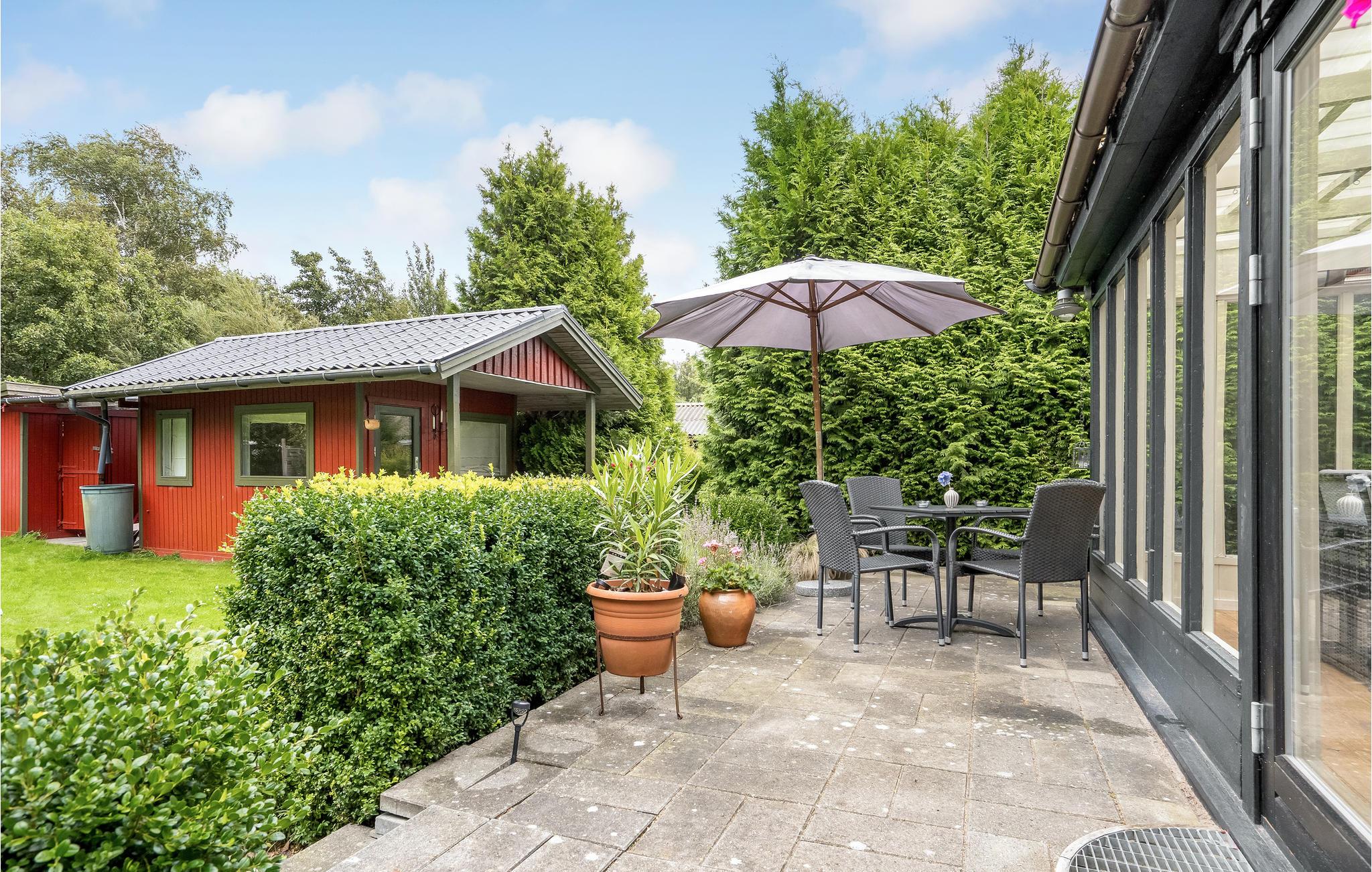 Hyggeligt feriehus i Gedesby med vildmarksbad, stor udestue og flere terrasser nær badestrand og havn.