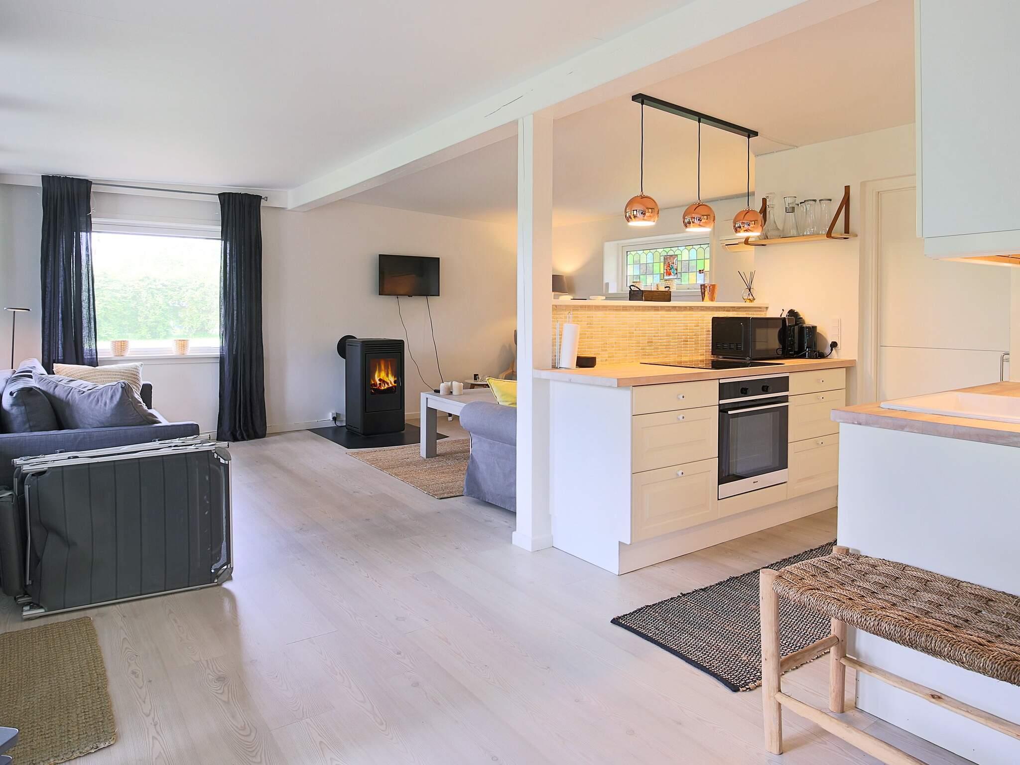 Stuen har en dobbelt sovesofa, Chromecast-tv, internetadgang, brændeovn og luft-til-luft-varmepumpe samt store vinduer med udsigt til terrassen og den anlagte have. Huset har et rummeligt soveværelse med dobbeltseng og adgang til forhaven. Badeværelset er udstyret med gulvvarme, brusekabine, toilet, håndvask og vaskemaskine.
