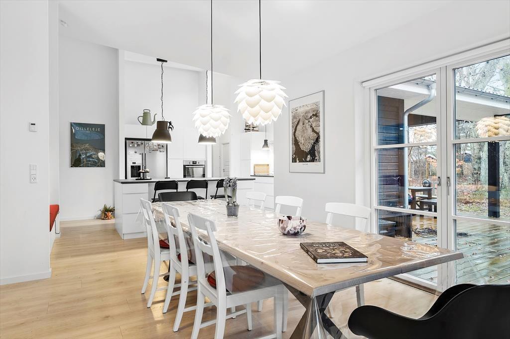 Så snart du træder ind i sommerhuset, mærker du den rummelige og indbydende stemning. De store vinduer lader dagslyset strømme ind, og den åbne planløsning skaber en harmonisk forbindelse mellem køkken, spiseområde og stue.