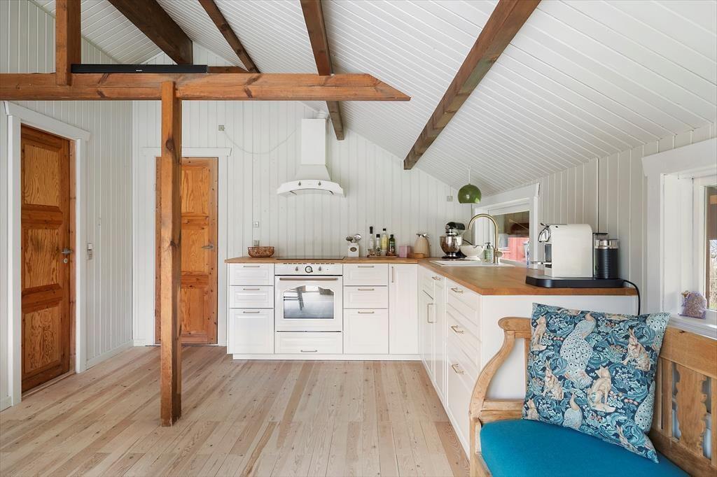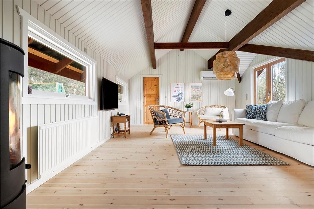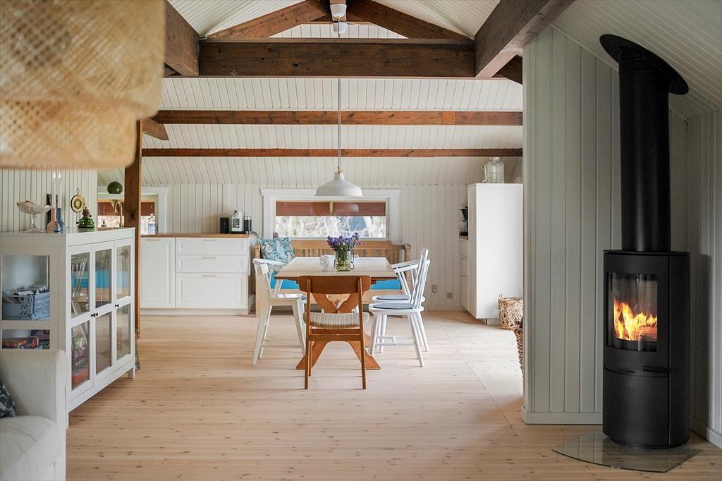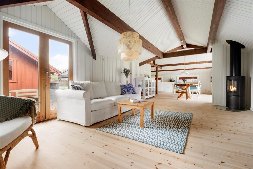 Når du træder ind i dette smukt renoverede sommerhus, mødes du af en lys og indbydende atmosfære. Den rummelige stue er indrettet med komfortable møbler og store vinduer, der trækker naturen indenfor. Her kan du synke ned med en god bog eller nyde hyggelige aftener med familien. Køkkenet er moderne og veludstyret, så det er let at kokkerere lækre måltider, mens resten af familien hygger sig i stuen. Huset er indrettet med fokus på både æstetik og funktionalitet, så du straks føler dig hjemme. Soveværelserne byder på ro og komfort, hvor du kan lade op efter dagens oplevelser.