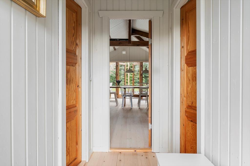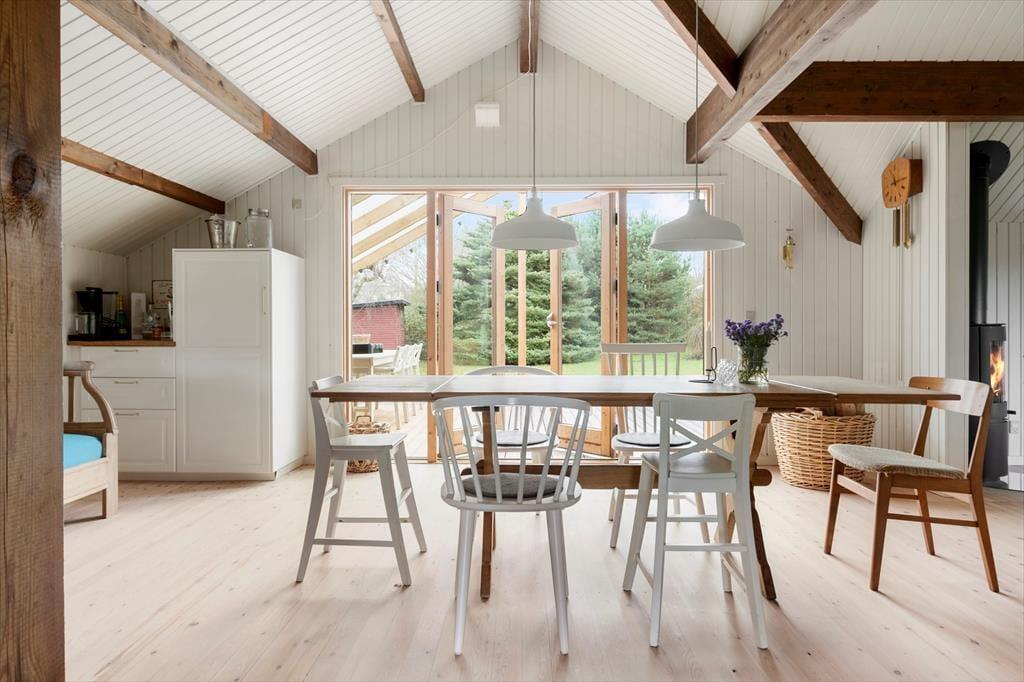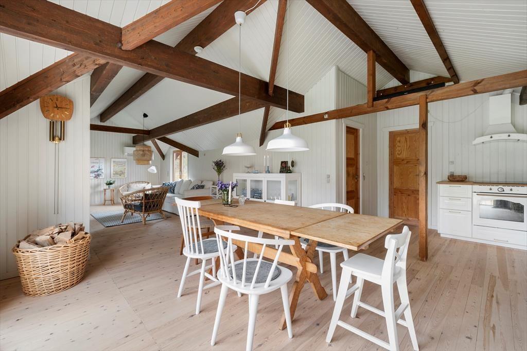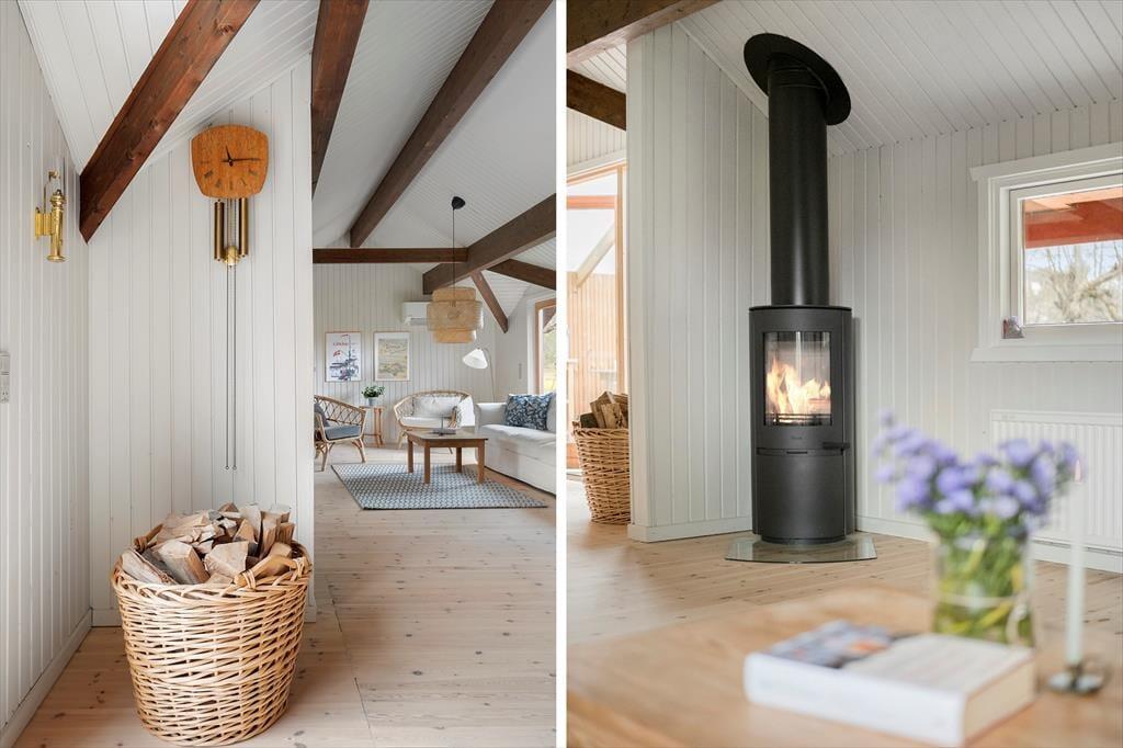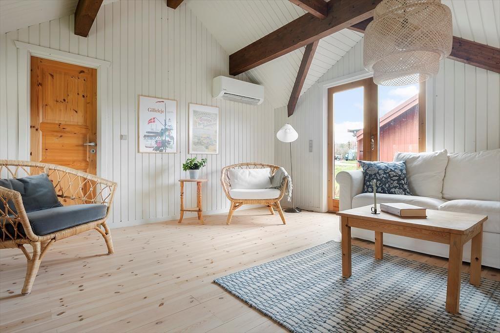 Når du træder ind i dette smukt renoverede sommerhus, mødes du af en lys og indbydende atmosfære. Den rummelige stue er indrettet med komfortable møbler og store vinduer, der trækker naturen indenfor. Her kan du synke ned med en god bog eller nyde hyggelige aftener med familien. Køkkenet er moderne og veludstyret, så det er let at kokkerere lækre måltider, mens resten af familien hygger sig i stuen. Huset er indrettet med fokus på både æstetik og funktionalitet, så du straks føler dig hjemme. Soveværelserne byder på ro og komfort, hvor du kan lade op efter dagens oplevelser.