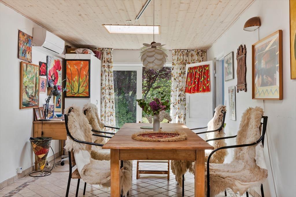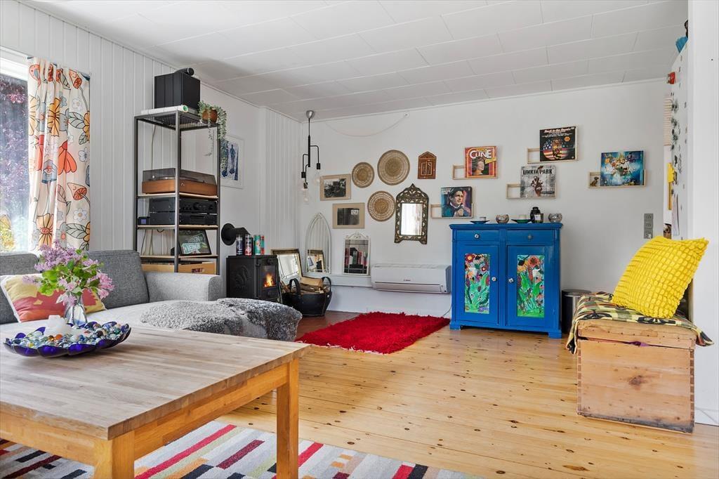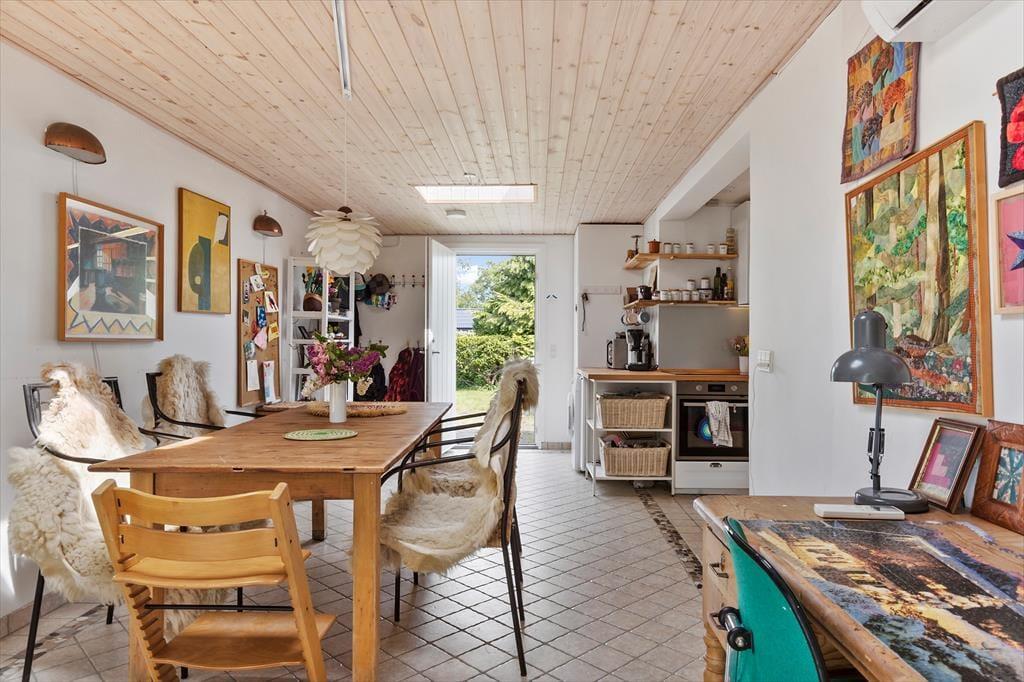 Allerede når I træder indenfor, mærker I den legende og varme atmosfære. Husets hjerte er det åbne alrum, hvor køkken og spisestue smelter sammen. Her er der god plads til at være sammen – til madlavning, tegnerier ved bordet eller brætspil, mens maden simrer. Rundt om hjørnet ligger opholdsstuen med en stor sofa, hvor hele familien kan slappe af og nyde freden. I det farverige børneværelse er der både en køjeseng og en sovesofa samt et udvalg af legetøj, der gør det let at finde på nye lege. Fra overkøjen kan man ligge og kigge op på stjernerne gennem ovenlysvinduet – en magisk detalje, der gør sengetid til noget helt særligt. Derudover byder huset på et lyst soveværelse med dobbeltseng.