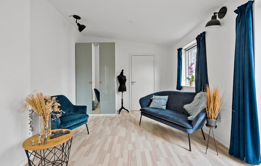 Tilbring jeres næste ferie i dette stilfuldt designede feriehus, der imponerer med sin lyse og åbne arkitektur. Den rummelige opholdsstue, som med sine høje lofter og store vinduer giver en særlig luftig atmosfære, indbyder til afslapning. Nyd komforten i den hyggelige siddegruppe efter en dag på stranden, eller tilbered lækre måltider i det veludstyrede køkken. Den åbne spisestue, som er adskilt fra opholdsrummet med elegante glasdøre, er perfekt til hyggelige aftener med familie eller venner.