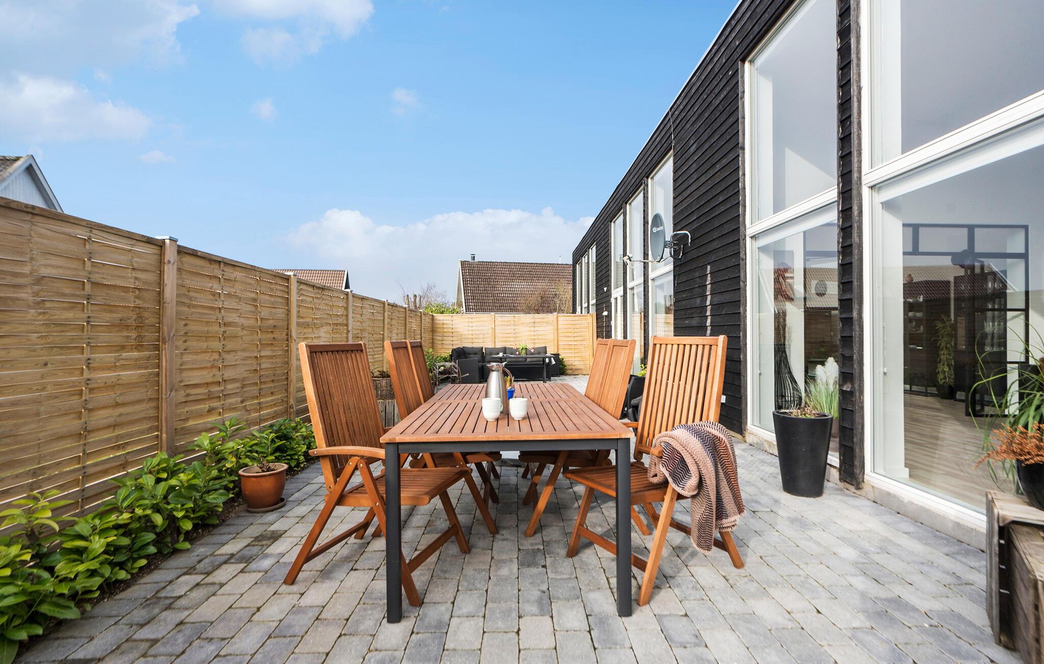 På solrige dage tilbyder den afskærmede terrasse det ideelle fristed udendørs. Her finder I komfortable havemøbler og en grill, så intet står i vejen for afslappede aftener under åben himmel. Børnene vil elske den lille legeplads i haven og kan more sig der.