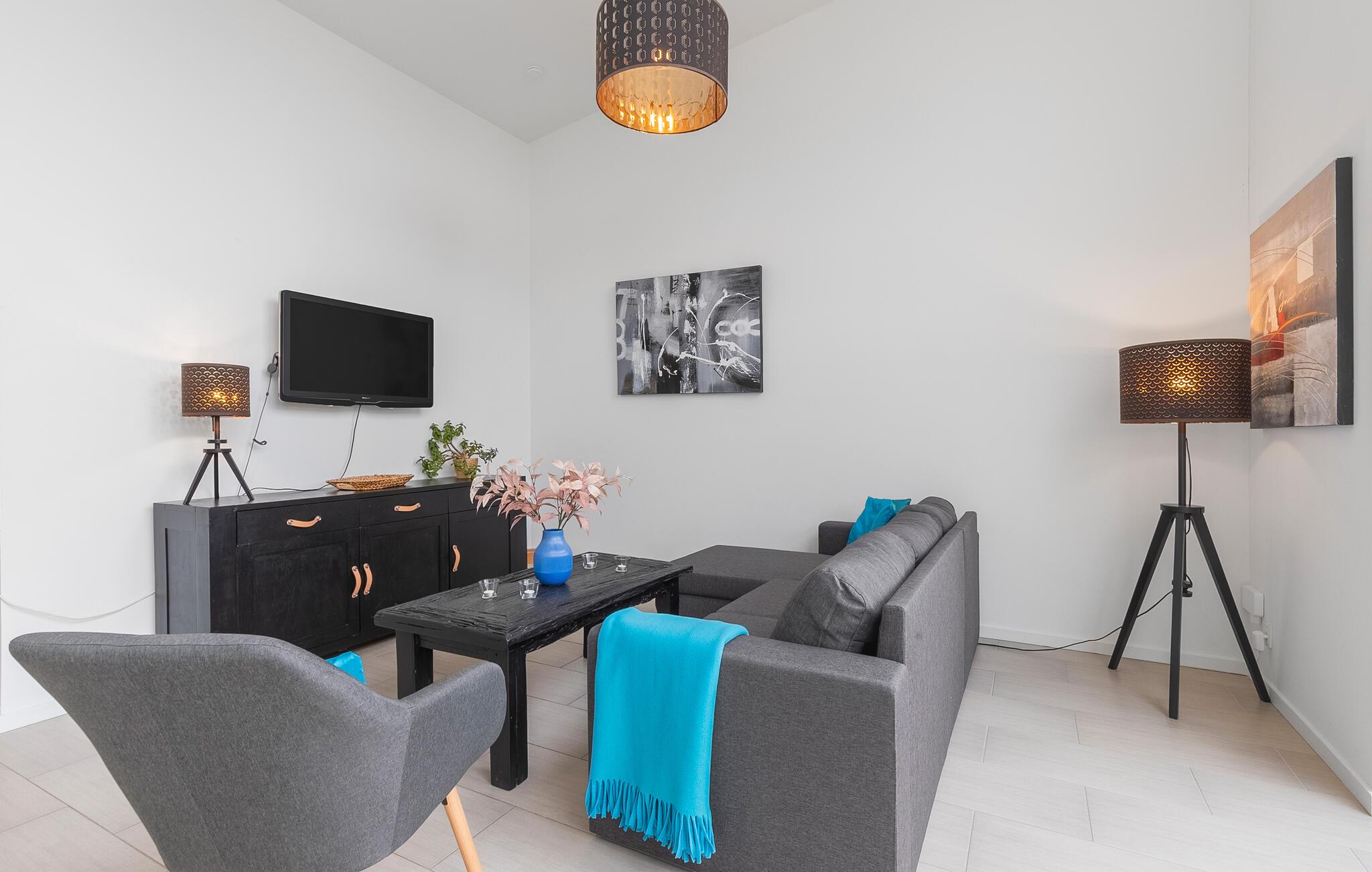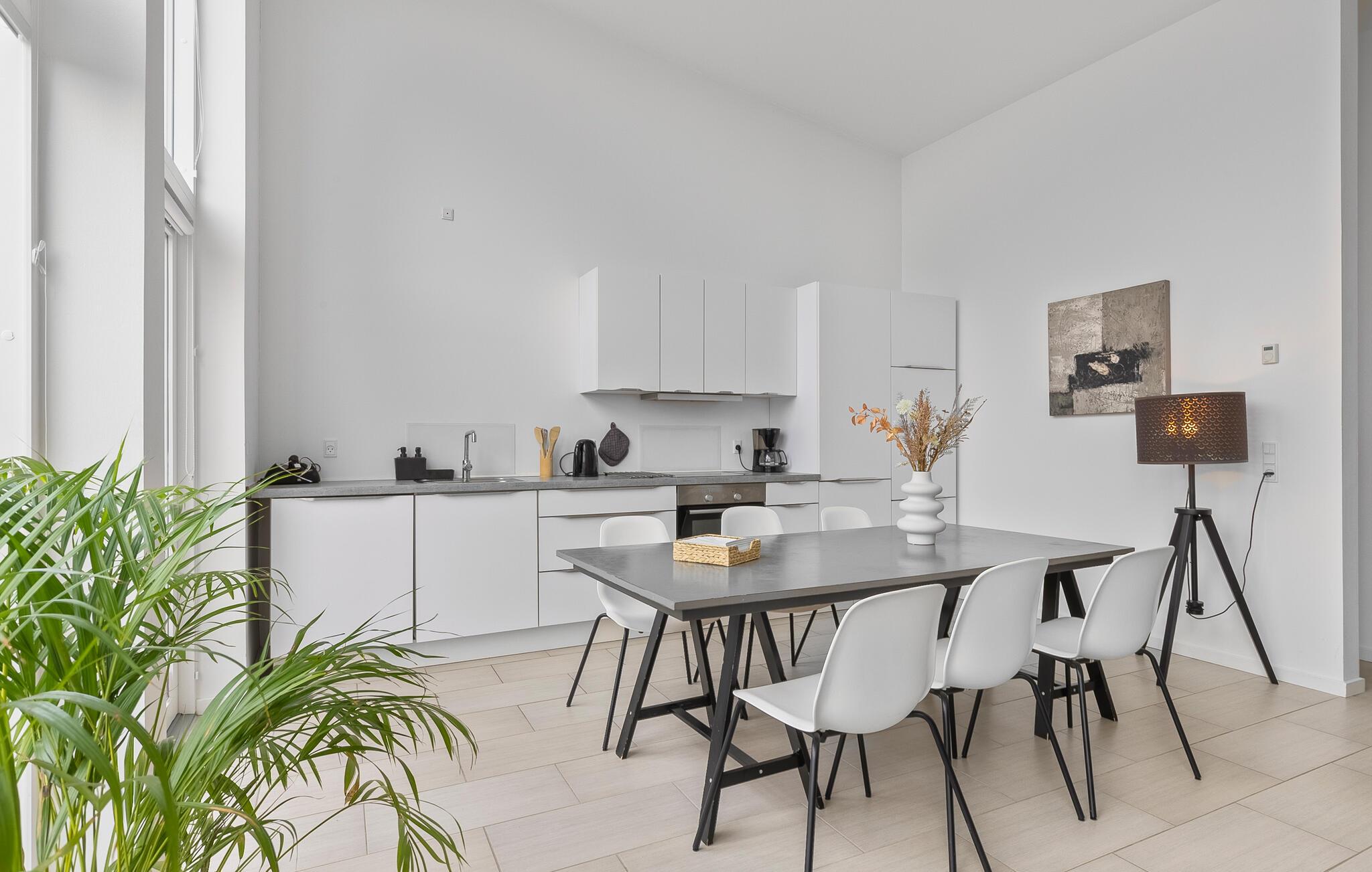Nyd feriedagene i jeres helt eget tempo, i stilfulde omgivelser og i bedste beliggenhed. Træd ind i den elegante opholdsstue med loft til kip og gulv-til-loft-vinduer. Oplev den lyse atmosfære, tag plads i den komfortable sofa, og fordyb jer i ferielæsning, eller planlæg jeres kommende aktiviteter sammen. Brug det stilfuldt integrerede spiseområde til fælles måltider. Det åbne køkken passer harmonisk ind i rummets tydelige designkoncept.