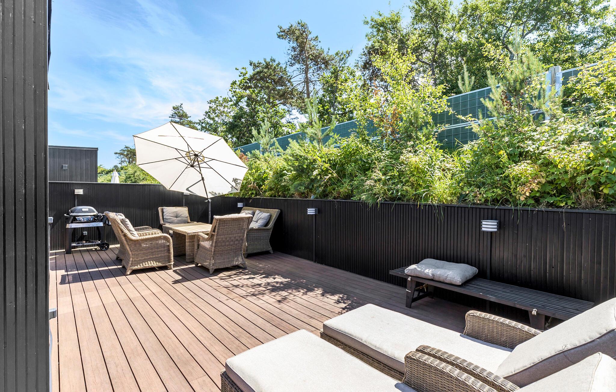 Haven er helt indhegnet, så her kanr I trygt kan børnene og hunden lege og boltre sig. Tilbered sommermåltider på terrassen, som har en gasgrill, og afslut dagen her med udsigt til havet og et glas vin.