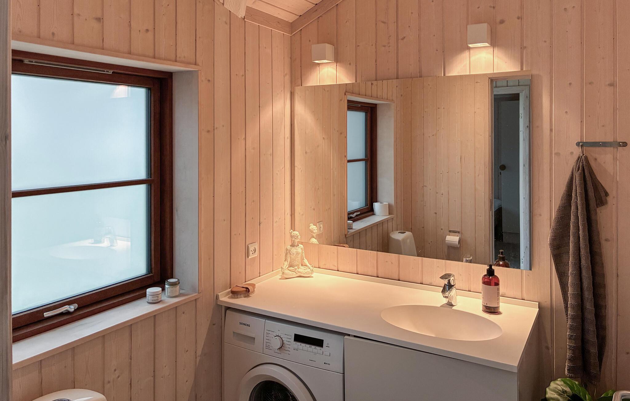 Oplev en fredelig og komfortabel ferie i dette stilfulde feriehus, det perfekte tilflugtssted for en afslappende ferie. Nyd den åbne stue med lyse træpaneler, store vinduer og moderne skandinavisk design. Læn jer tilbage i den komfortable sofa, læs en bog i den hyggelige siddegruppe eller lav måltider sammen i det smukke, åbne køkken. Brug det store spisebord til hyggelige aftener og lad blikket Tag på vandretur gennem panoramavinduerne ind i den velholdte have.
