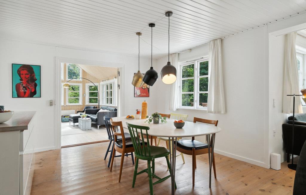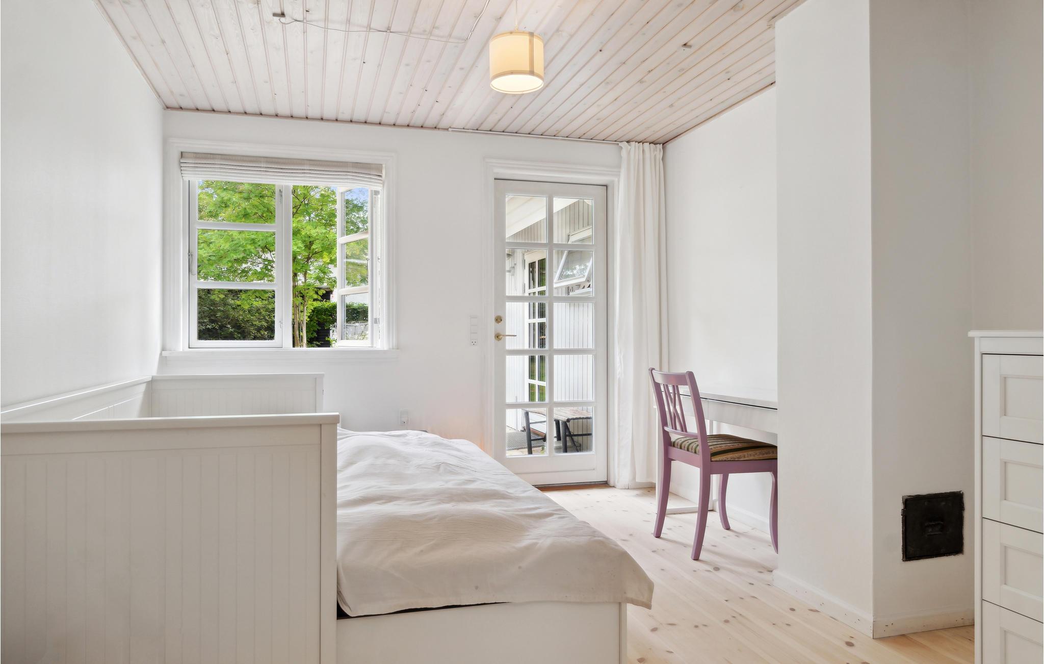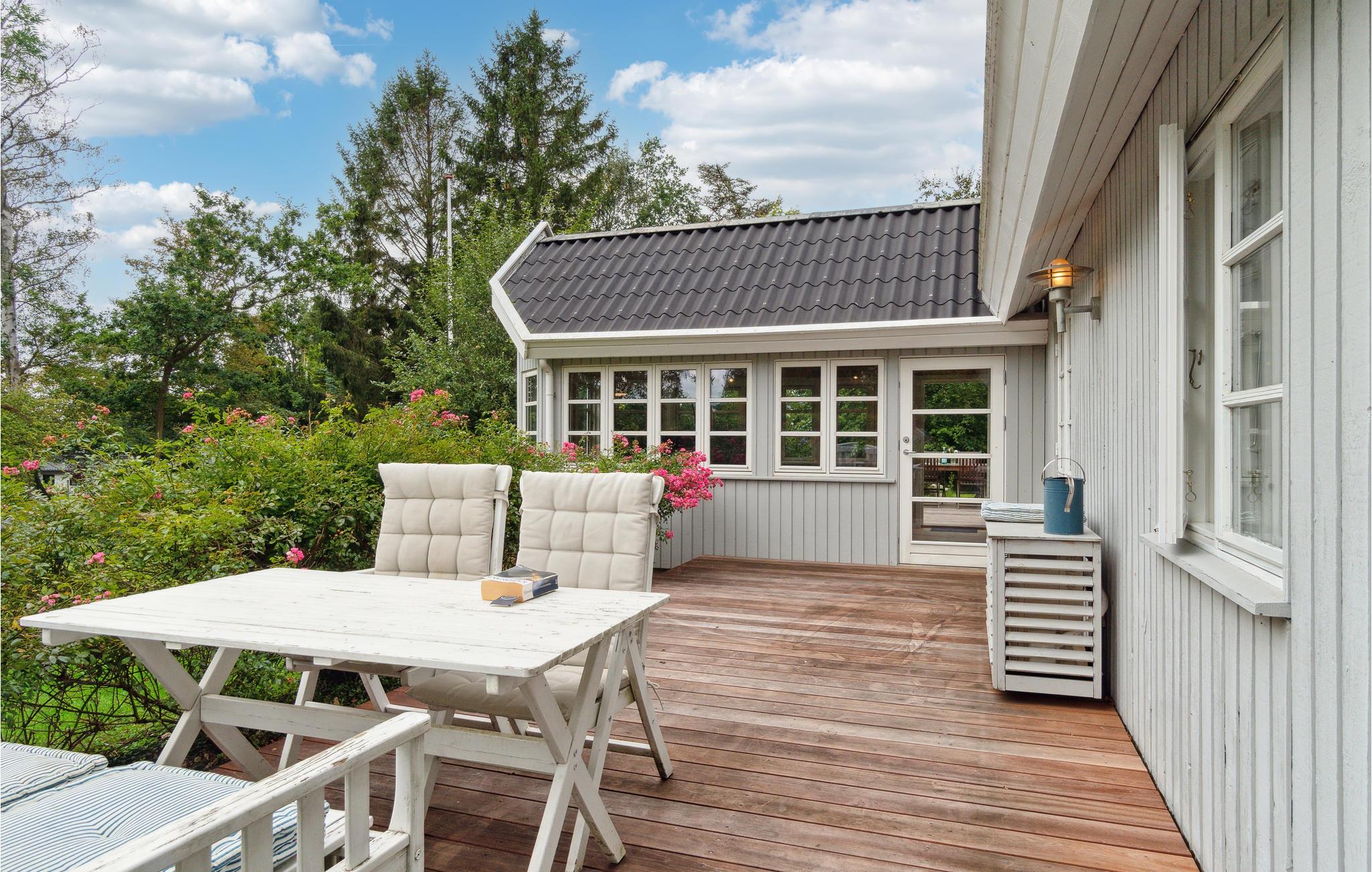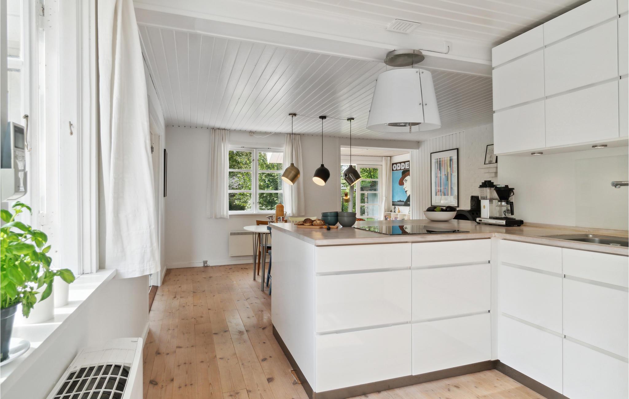 Velkommen til dette feriehus, frodigt omgivet af store træer og blomstrende buske på en skøn naturgrund. Et dejligt sted for naturelskeren! Indenfor byder huset på en lys og moderne atmosfære, hvor hele familien vil føle sig godt tilpas. Kombinationen af hvid og træ sørger for en følelse af varme. Nyd udsigten over det grønne, så snart I vågner og planlæg dagens aktiviteter over morgenkaffen ved spisebordet. Senere udfordrer I måske hinanden i matador? Efter en begivenhedsrig dag kan I trylle lidt lækkert frem i det store køkken, hvor der også er plads til de små kokke. Huset har et dejligt udendørs areal. Haven og terrasserne danner den ideelle ramme om hyggelige lange sommerdage med ren afslapning, leg og boldspil. Der er ikke langt til den skønne strand, hvor I også kan gå dejlige aftenture.
