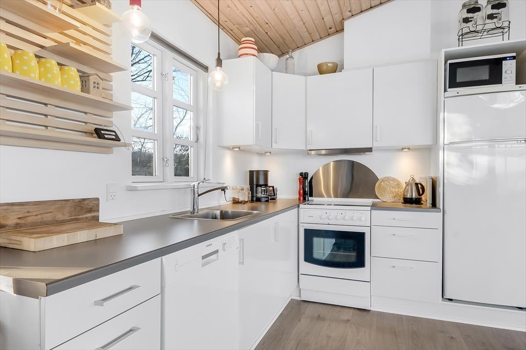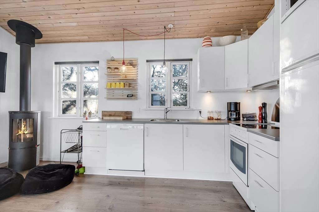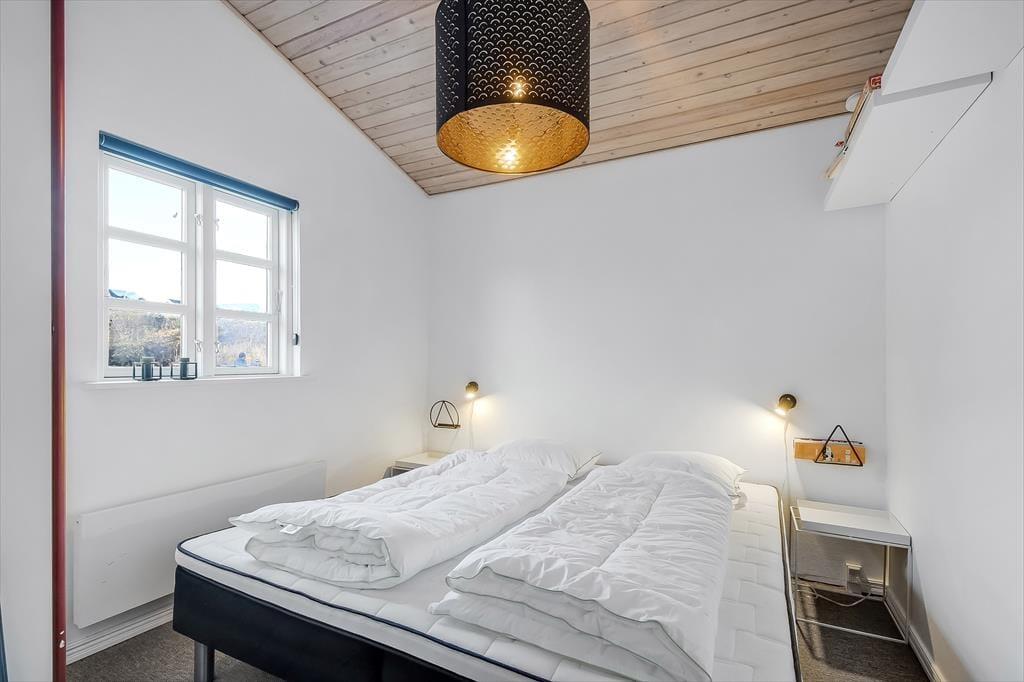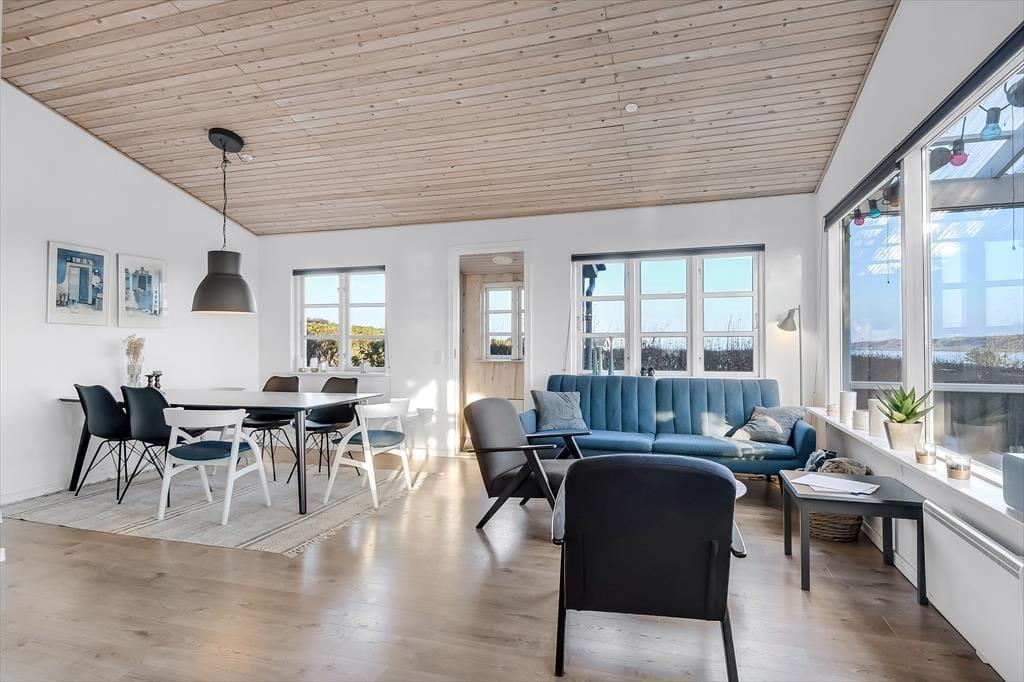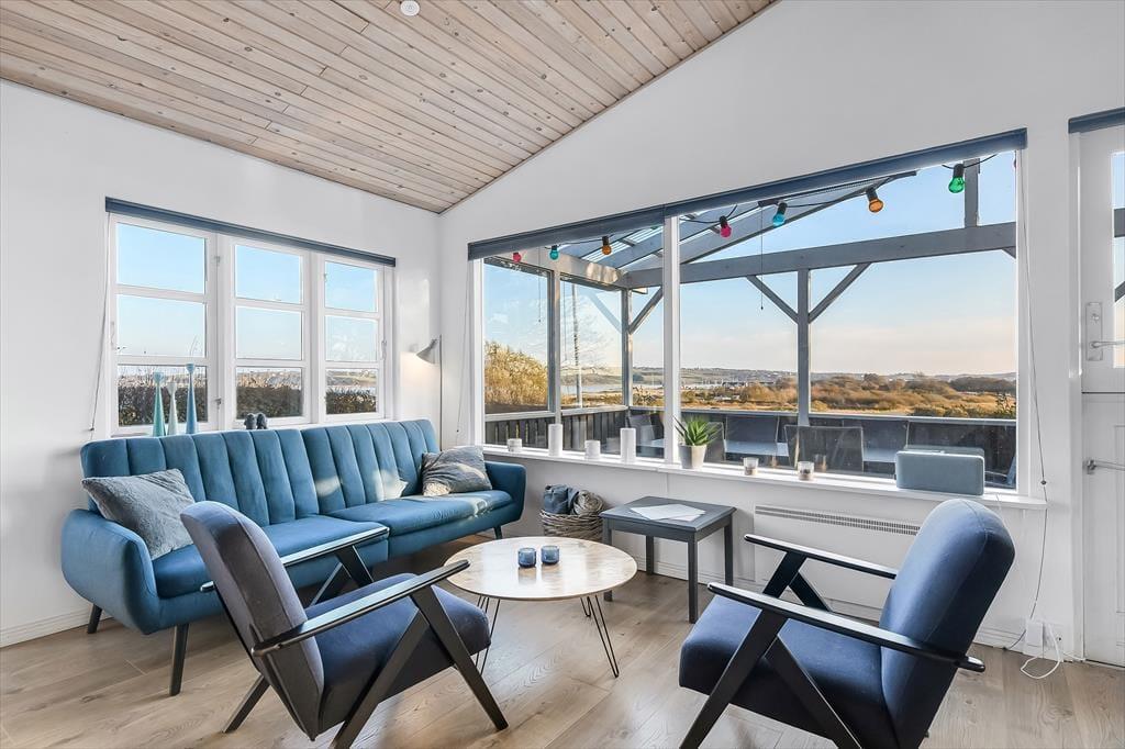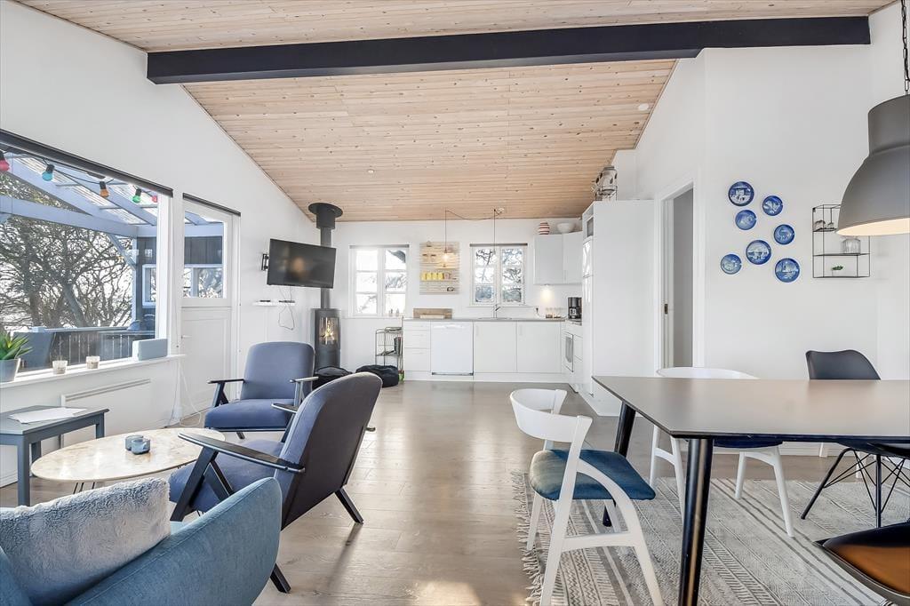 Træder du ind i sommerhuset, mærker du med det samme den varme og hjemlige atmosfære, der gør det nemt at finde sig til rette. Indretningen er hyggelig og velafstemt med et lyst udtryk, som får rummet til at føles let og indbydende. Her er lagt vægt på, at opholdet skal være både afslappende og uformelt – lige præcis som en ferie skal være. Stuen er husets hjerte, og det er ikke kun de store vinduespartier, der gør den til noget særligt – det er udsigten gennem dem. Herfra kan du nemlig følge livet i marinaen og se lyset danse hen over fjordens overflade. I den åbne forbindelse mellem køkken, spiseplads og stue kan du nemt være sammen med dine nærmeste – hvad end I kokkererer, spiller spil eller nyder en stille stund i sofaen. Huset passer perfekt til både par og mindre familier – og selvfølgelig er hunden også velkommen.