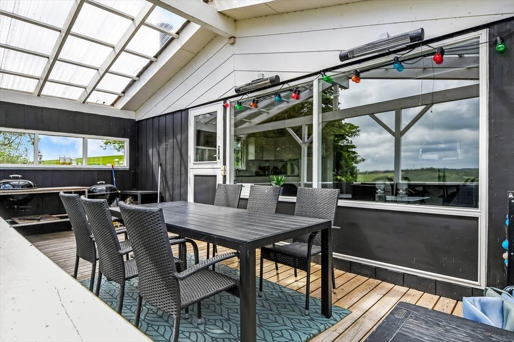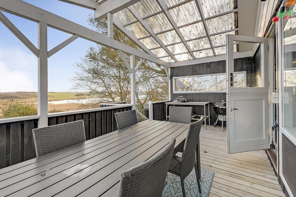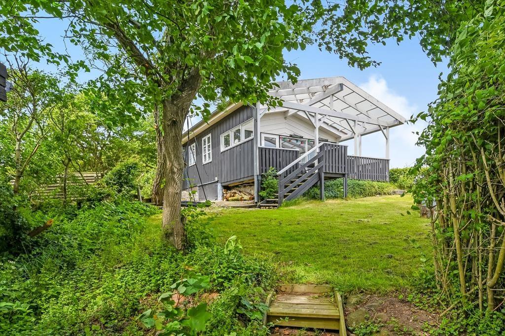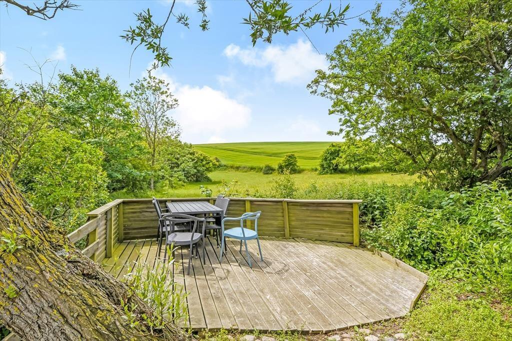 Når solen skinner over Gjellerodde, er det oplagt at tage ophold på sommerhusets store terrasse. Den vender mod fjorden og giver dig en sjældent smuk kulisse til morgenkaffen, frokosten under åben himmel eller et glas vin i solnedgangen. Terrassen er godt møbleret og har både læ og solkroge, så du kan finde det helt rigtige hjørne – uanset om du vil slappe af med en bog, tage en lur eller bare sidde i stilhed og nyde udsigten. Haven omkring huset er grøn og åben, og børn og hunde kan trygt bevæge sig rundt i det fredelige sommerhusområde. Udelivet bliver en naturlig del af ferien, når det leves i så skønne omgivelser – og lyden af fuglesang og fjordens stille bølger bliver det rolige bagtæppe for dine dage her.