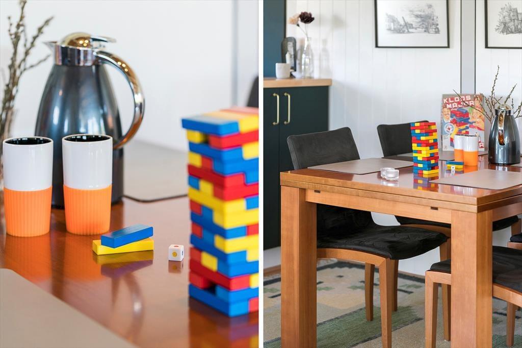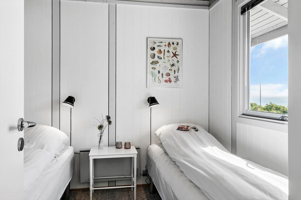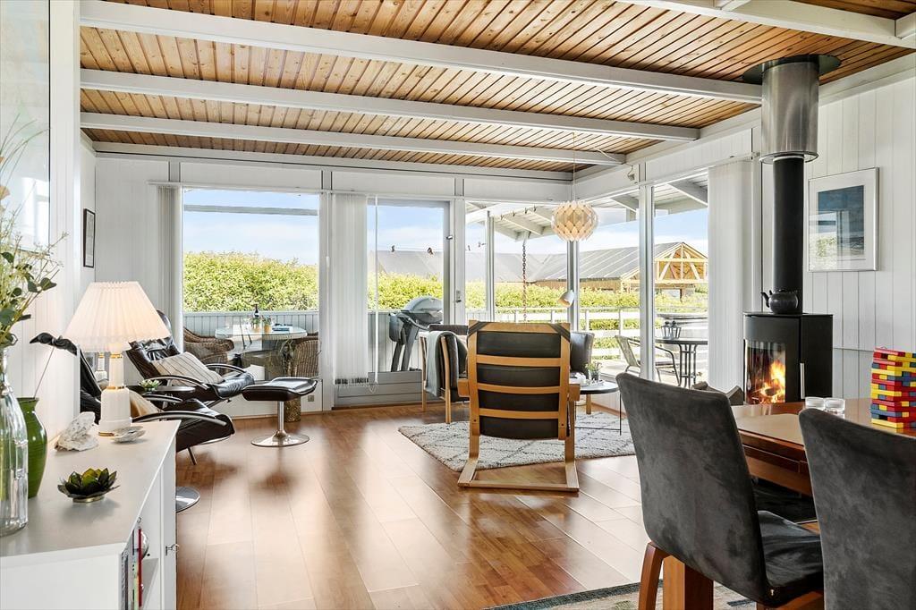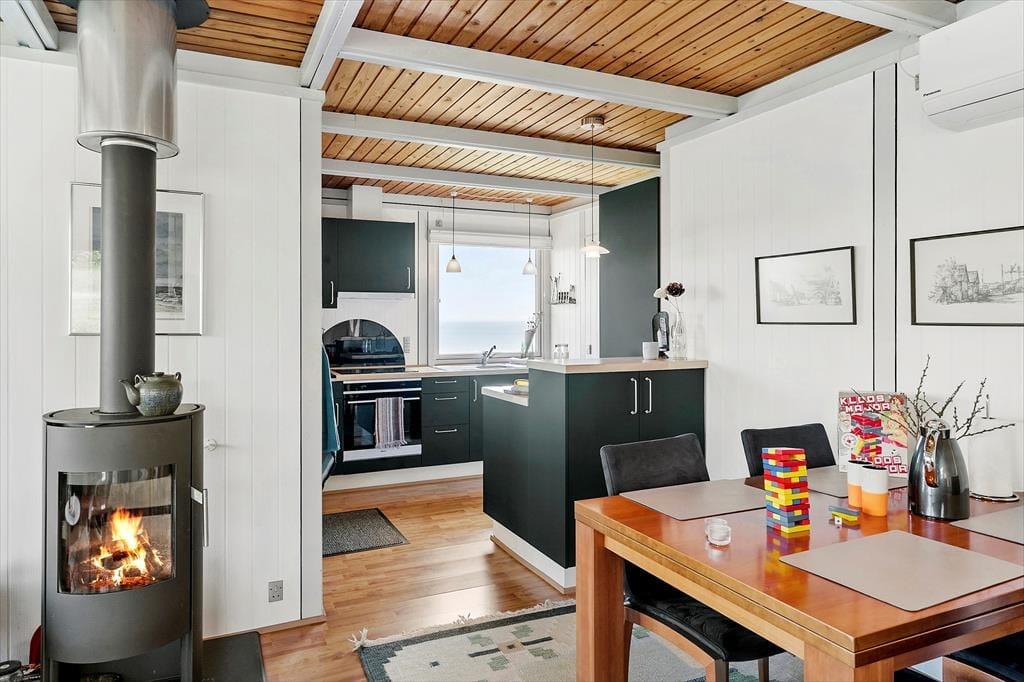 Indretningen i sommerhuset på Gyvelvej 20 er enkel, lys og behagelig – og med en hyggelig atmosfære, der straks får dig til at føle dig hjemme. Brændeovnen i stuen er med til at gøre huset oplagt til ferie hele året, for der er ikke noget som at slappe af i varmen med udsigt til flammerne, mens vinden suser udenfor. Køkken og stue ligger i åben forbindelse, hvilket gør det let at være sammen om måltider, kortspil og snakke, der trækker ud til langt ud på aftenen. Ferie er, når tiden ikke betyder så meget – og det mærkes tydeligt her. Sommerhuset har plads til hele familien eller gode venner, og uanset om du er til afslapning eller aktiviteter, giver huset de perfekte rammer.
