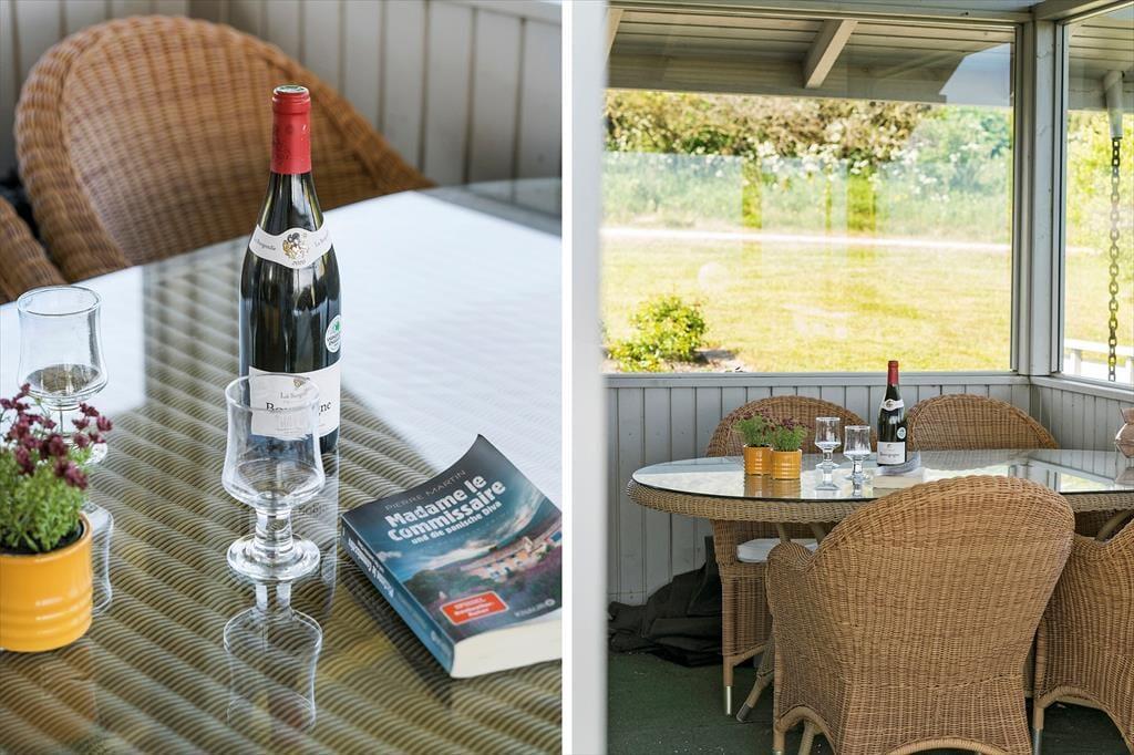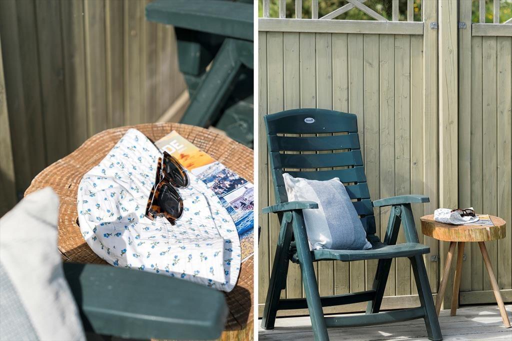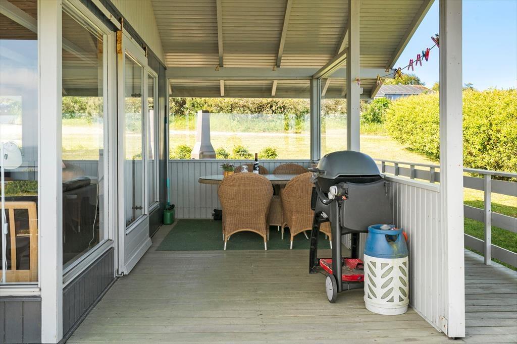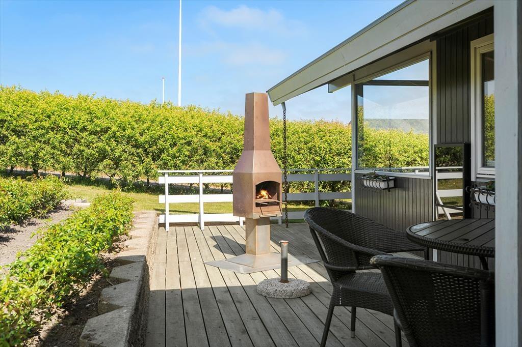 Terrassen er uden tvivl et af sommerhusets højdepunkter. Den er rummelig og godt placeret i forhold til solen, og her kan du let finde læ, mens du nyder den friske luft og den flotte udsigt over det kuperede landskab, som Gjellerodde er kendt for. Det er oplagt at tilbringe mange timer herude – med grill, et godt glas vin eller måske en stille stund med en bog og fuglekvidder i baggrunden. Kun 200 meter herfra ligger stranden, hvor børnene kan soppe og lege i det lave vand, og hvor du kan tage en frisk dukkert i fjorden eller nyde solnedgangen med tæerne i sandet. Når vejret er til det, indbyder haven til leg og boldspil – og resten af tiden er her masser af plads til bare at være.