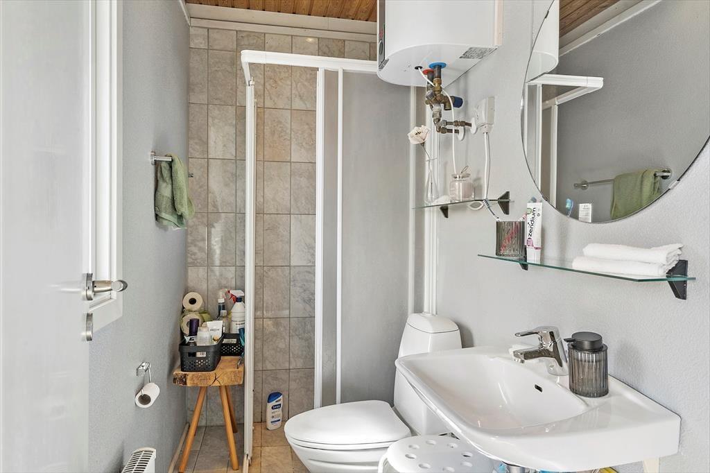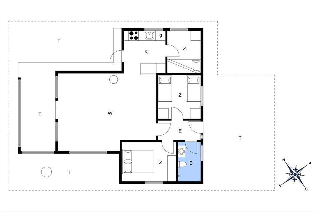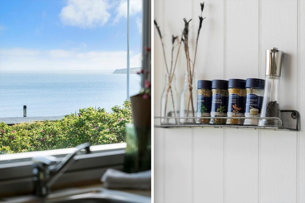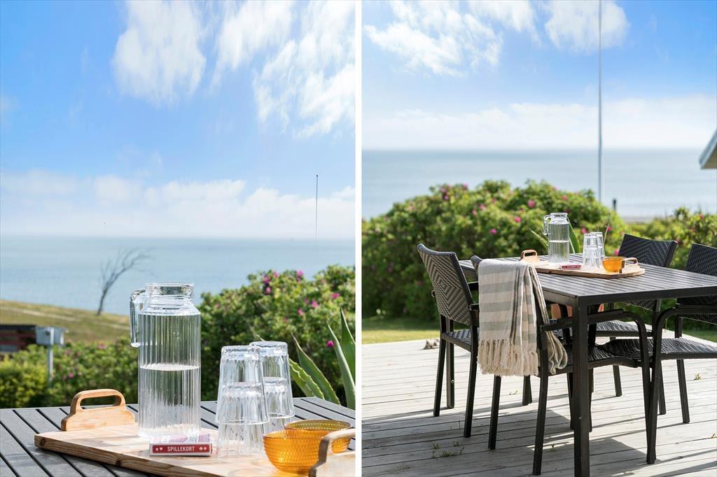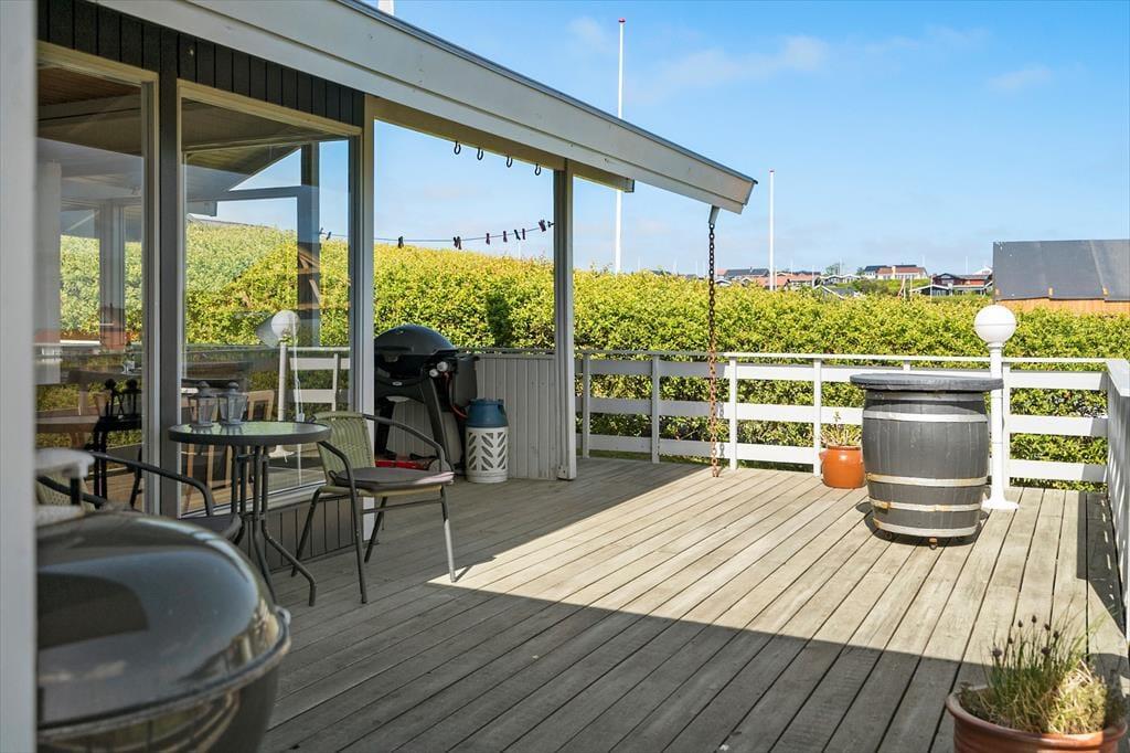Terrassen er uden tvivl et af sommerhusets højdepunkter. Den er rummelig og godt placeret i forhold til solen, og her kan du let finde læ, mens du nyder den friske luft og den flotte udsigt over det kuperede landskab, som Gjellerodde er kendt for. Det er oplagt at tilbringe mange timer herude – med grill, et godt glas vin eller måske en stille stund med en bog og fuglekvidder i baggrunden. Kun 200 meter herfra ligger stranden, hvor børnene kan soppe og lege i det lave vand, og hvor du kan tage en frisk dukkert i fjorden eller nyde solnedgangen med tæerne i sandet. Når vejret er til det, indbyder haven til leg og boldspil – og resten af tiden er her masser af plads til bare at være.