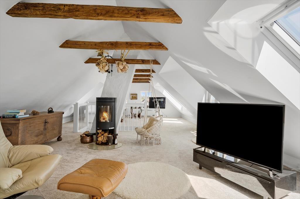 Allerede når du træder ind i sommerhuset på Gjelleroddevej 56, fornemmer du en særlig ro og velvære. Indretningen er både indbydende og gennemført, og husets to plan er forbundet på en måde, der skaber masser af rum til samvær – men også til de stille stunder. Stue og køkken ligger i åben forbindelse og danner det naturlige samlingspunkt for alt fra hyggelige madlavningsprojekter til lange middage og filmaftener i sofahjørnet. De store vinduespartier trækker lyset ind og skaber et smukt samspil med naturens farver udenfor, så du hele tiden har fornemmelsen af at være tæt på fjorden – også når du er indendørs. Huset byder på hjemlig komfort og plads til hele familien, så både store og små føler sig velkomne og godt tilpas.