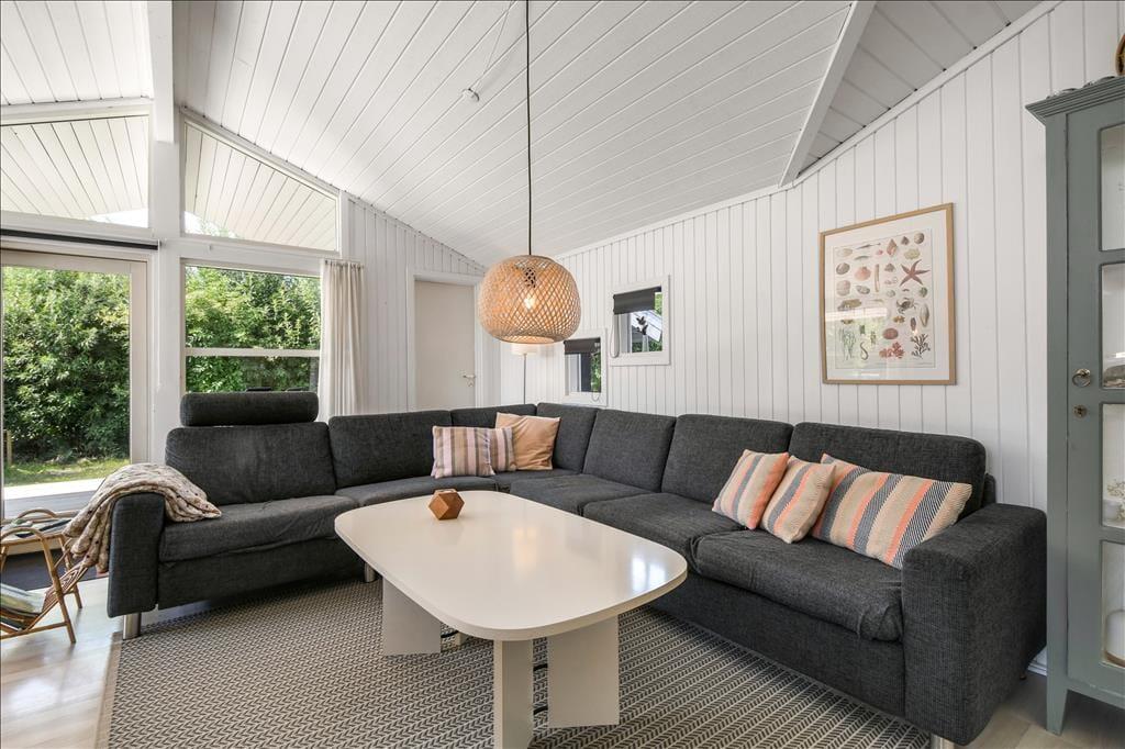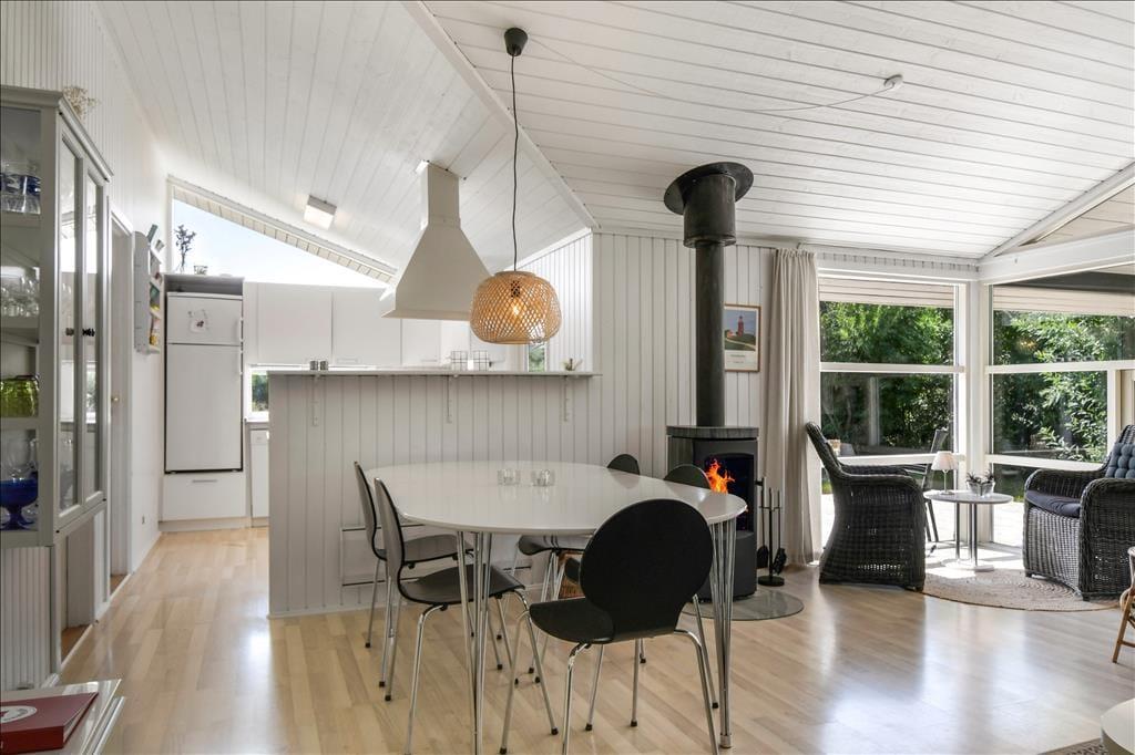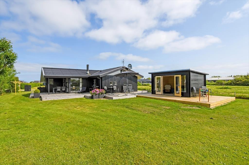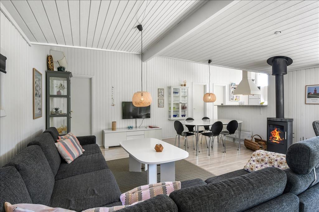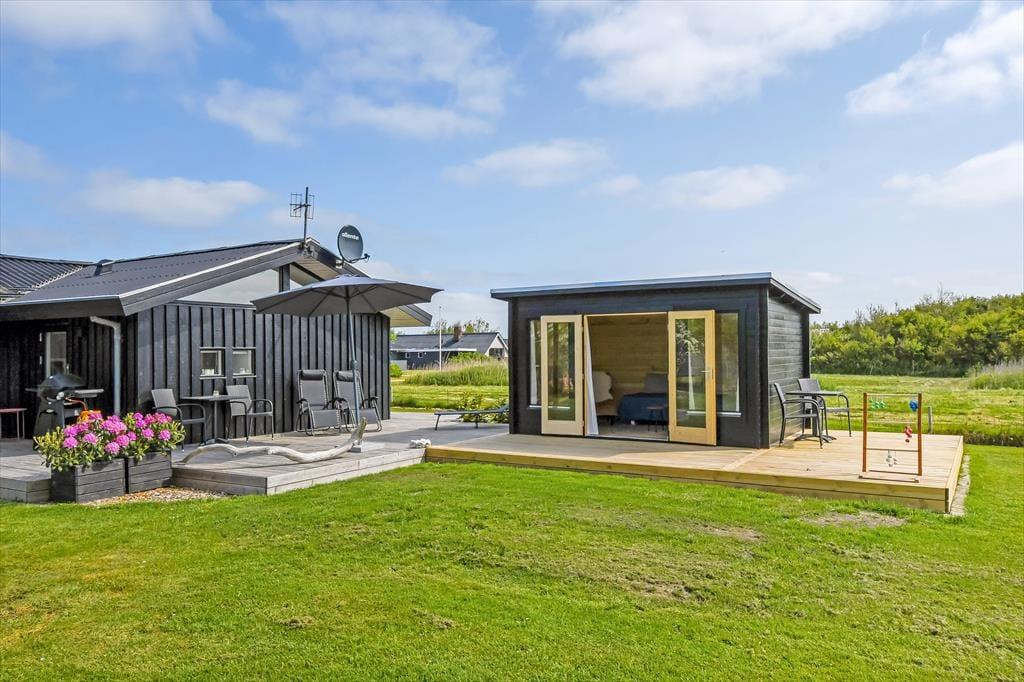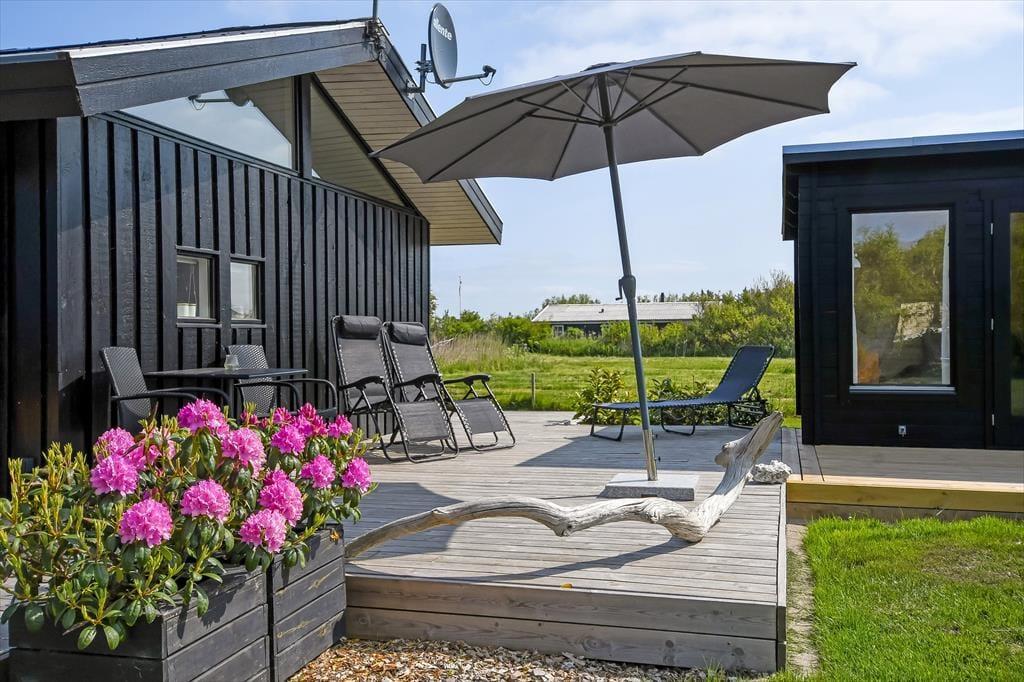 Det er ikke svært at komme i feriestemning, når du træder ind i dette velindrettede sommerhus. Her er en lys og afslappet atmosfære, hvor det er nemt at finde ro. Opholdsrummet er samlingspunktet med åbent køkken og stue, så du kan lave mad og samtidig være en del af snakken, der foregår omkring spisebordet eller i sofahjørnet. Efter en lang dag med oplevelser i det vestjyske landskab kan du forkæle dig selv i husets indendørs spa, mens børnene leger eller slapper af. Og trænger du til ekstra velvære, kan du træde ind i saunaen og lade varmen omslutte dig – perfekt til de køligere dage. Huset har plads til op til otte personer, så her er god mulighed for, at både familie og venner kan nyde ferien sammen. Og har du hund, er den naturligvis også velkommen – den vil helt sikkert føle sig hjemme i det rummelige hus og den store have.