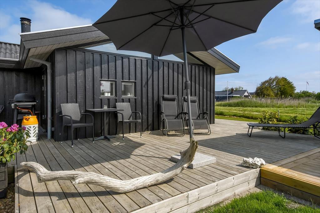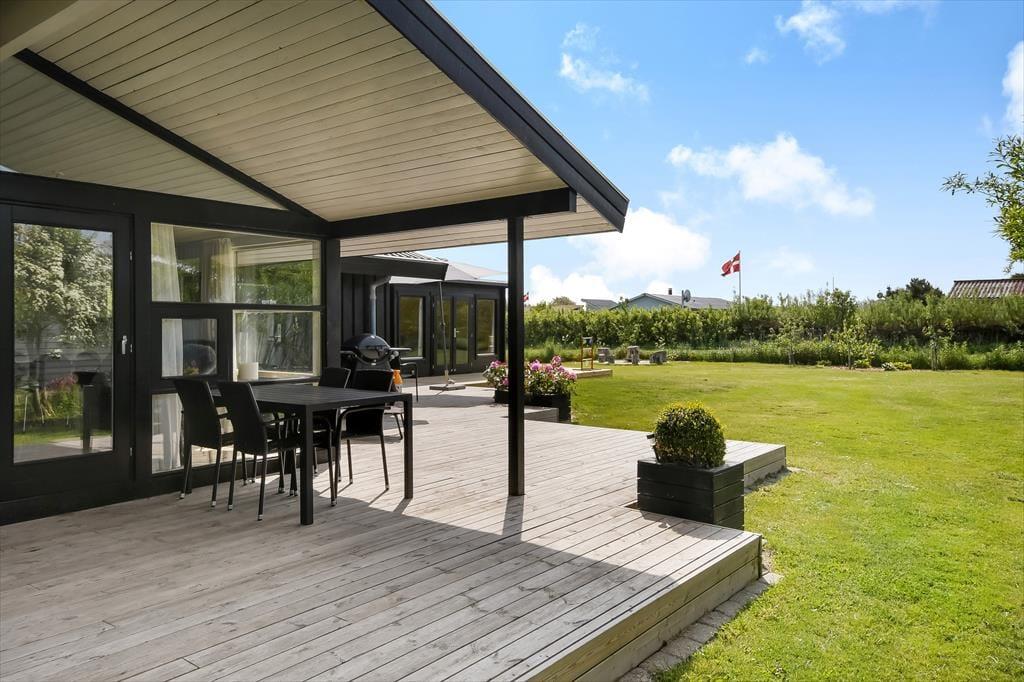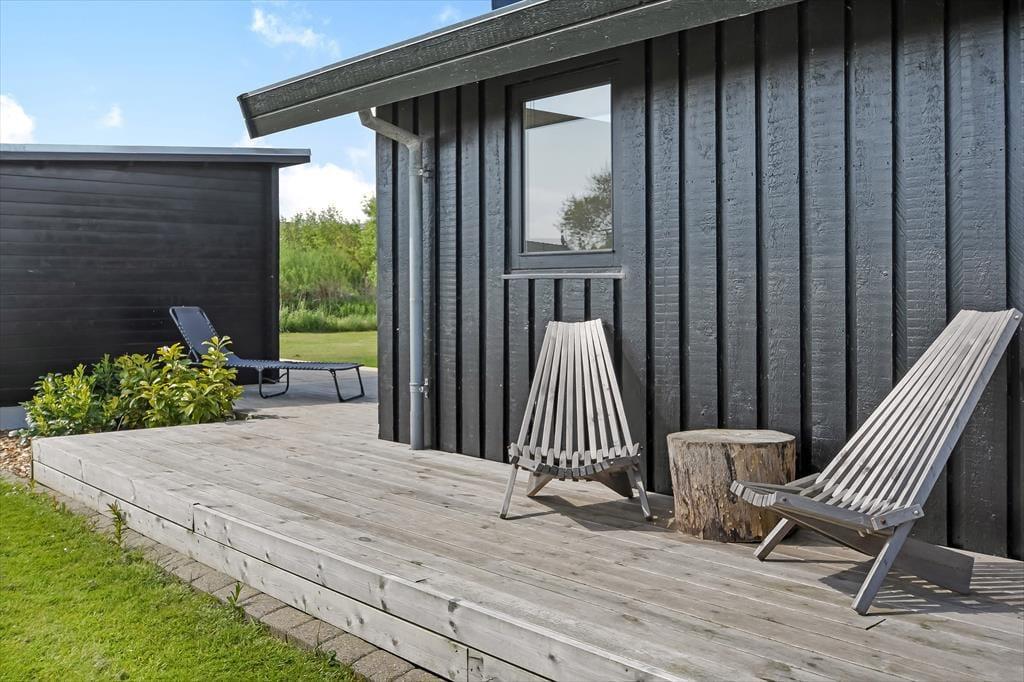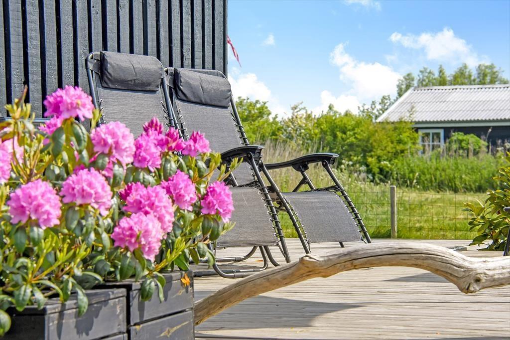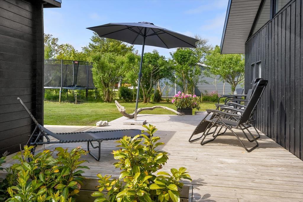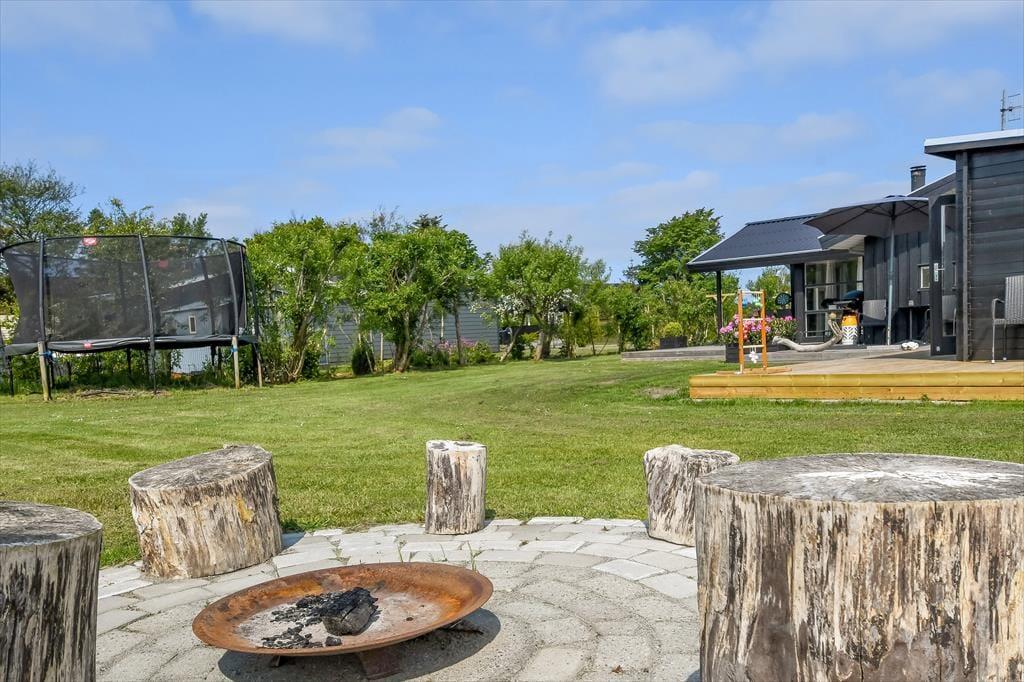 Udenfor venter et skønt terrassemiljø, hvor du kan nyde både sol og læ – og måske en god bog i liggestolen, mens fuglene synger i baggrunden. På grunden er der god plads til leg og boldspil, og den store græsplæne og trampolinen vil med garanti være et hit blandt familiens yngste. Et charmerende lille havehus skaber ekstra atmosfære og kan blive jeres yndlingssted til en eftermiddagskaffe eller et spil kort i skyggen. Om aftenen kan I tænde grillen og samles til et godt måltid under åben himmel – mens solen går ned bag fjorden og sender sit varme skær ind over haven. Der er både plads og ro til de stille stunder og rig mulighed for aktivitet og leg, så her kan alle finde deres egen feriefavorit.