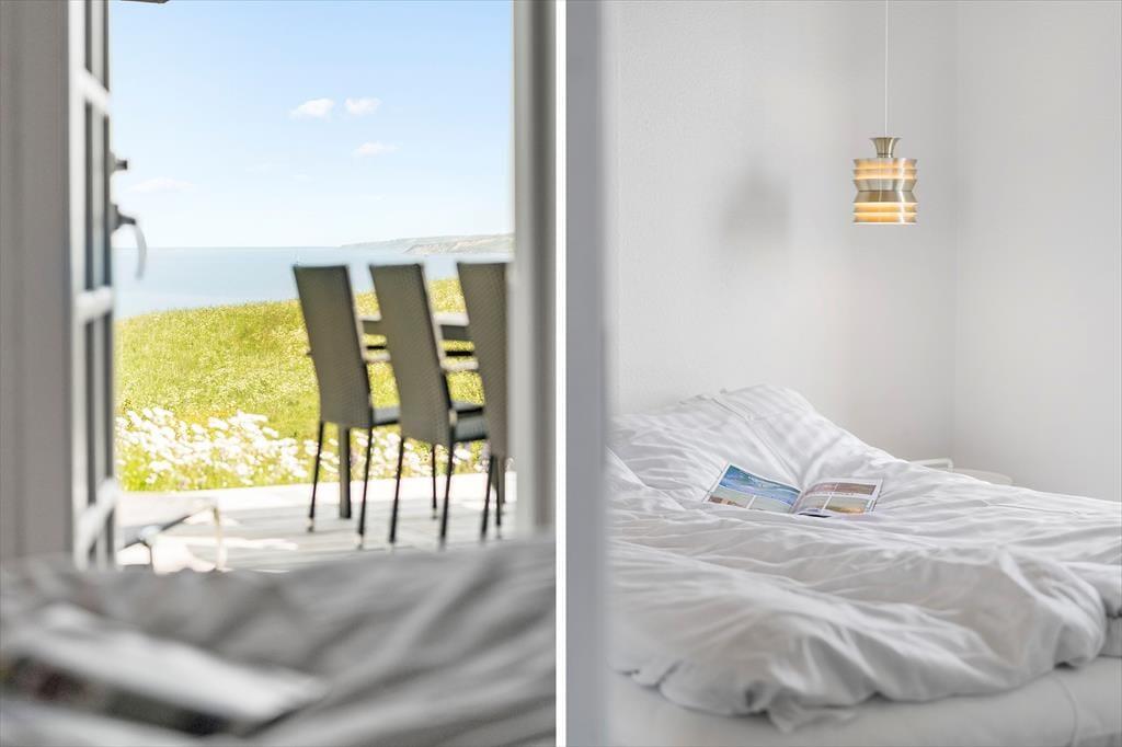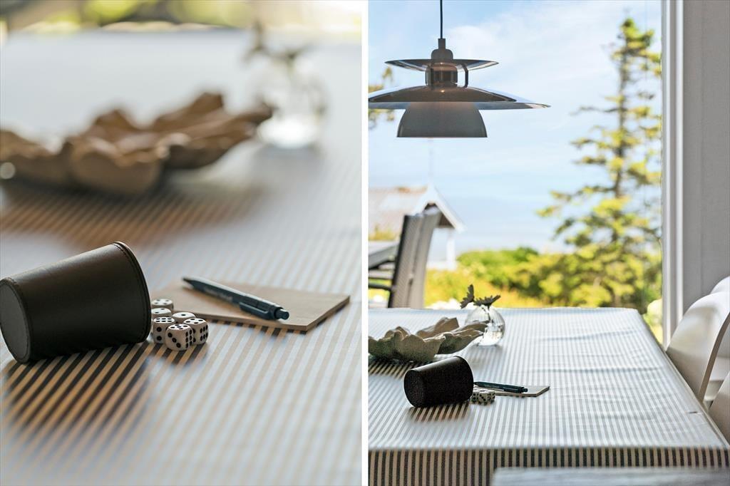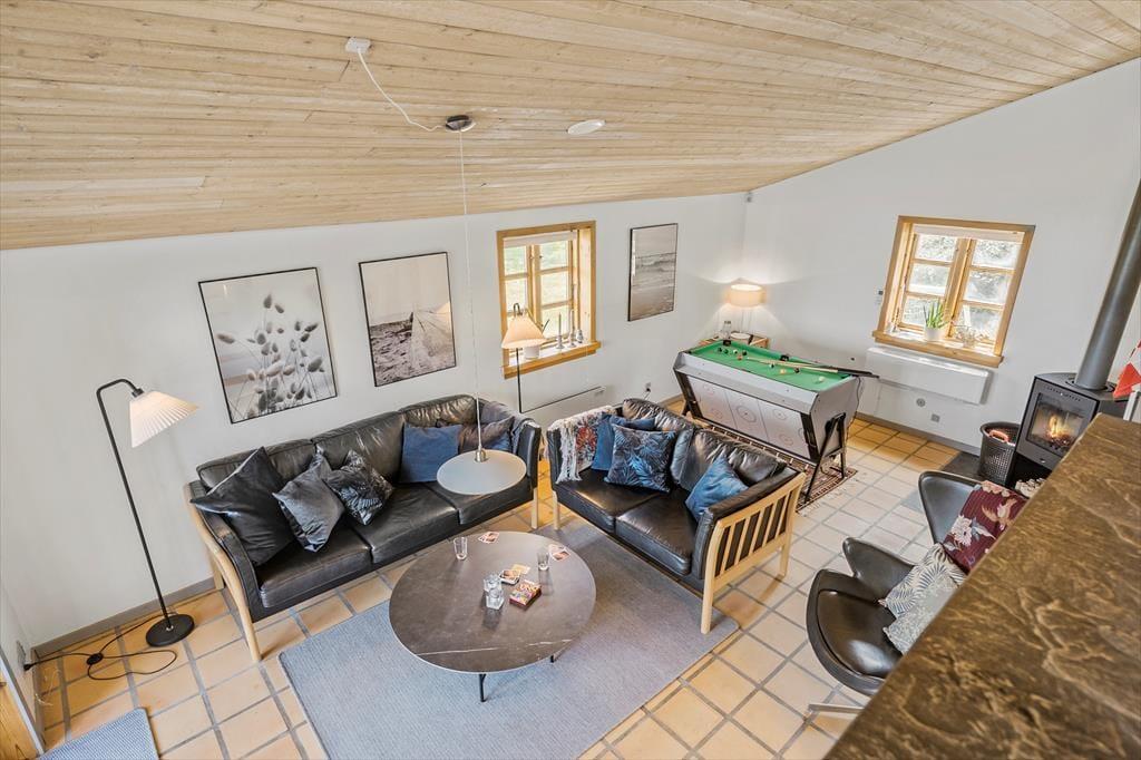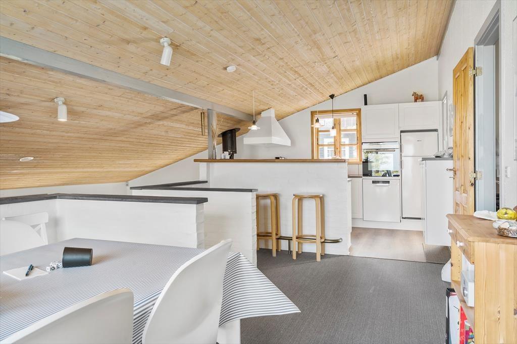 Indenfor i sommerhuset mødes du af en behagelig atmosfære, hvor arkitektur og indretning spiller smukt sammen. Store vinduespartier inviterer fjordlandskabet med helt ind i stuen og fylder rummet med lys og udsigt, uanset om du står i køkkenet eller slapper af i sofaen. Brændeovnen knitrer hyggeligt i hjørnet og bliver hurtigt familiens naturlige samlingspunkt – særligt på de aftener, hvor I slår jer ned med et brætspil eller bare nyder varmen og roen. Den rummelige stue indbyder til samvær og afslapning, og her er god plads til både børn og voksne. Ferie skal kunne mærkes – og det kan den her, hvor rammerne er skabt til hygge, nærvær og hverdagsflugt.
