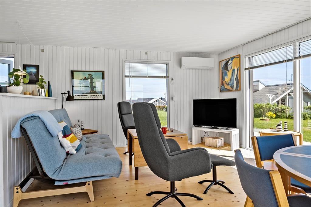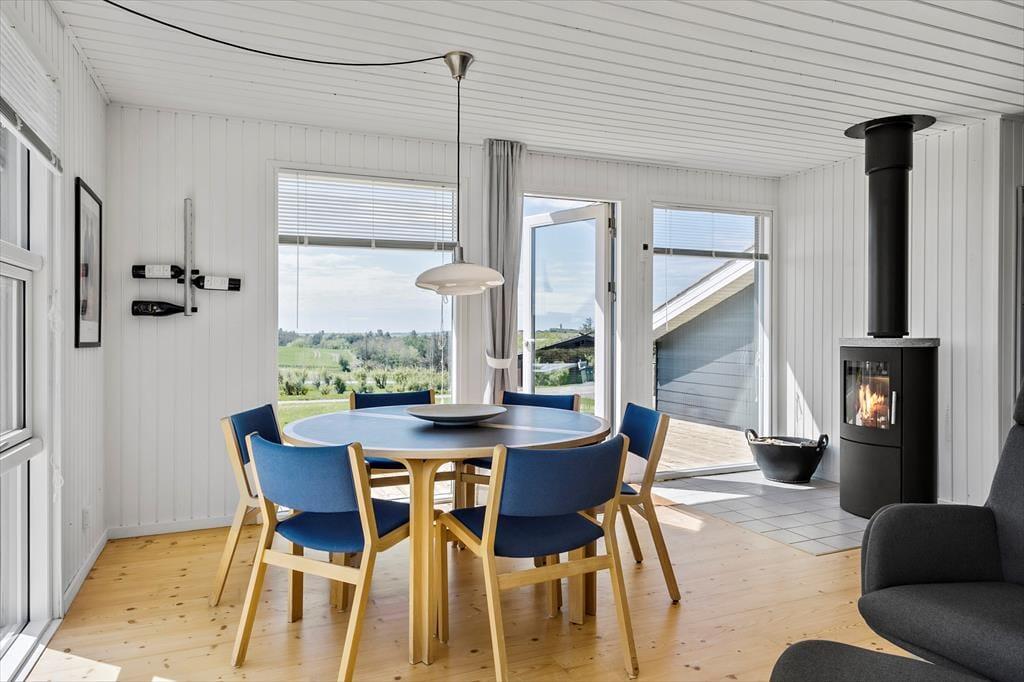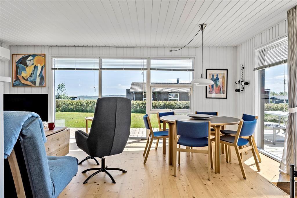 Når du træder ind i sommerhuset på Skovstjernevej 19, bliver du mødt af en venlig og afslappet stemning, hvor lyset strømmer ind gennem vinduerne og inviterer fjorden helt ind i stuen. Her er det nemt at finde sig til rette – måske i den gode stol med en kop kaffe og en bog, eller samlet om spisebordet med udsigt til landskabet. Den lyse og funktionelle indretning skaber rammen om en ferie, hvor I kan være sammen og samtidig finde plads til at trække jer lidt tilbage. Sommerhuset har en særlig evne til at få tiden til at gå langsommere – som om hverdagen bliver efterladt på grusvejen, når du først træder indenfor.