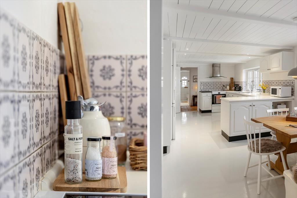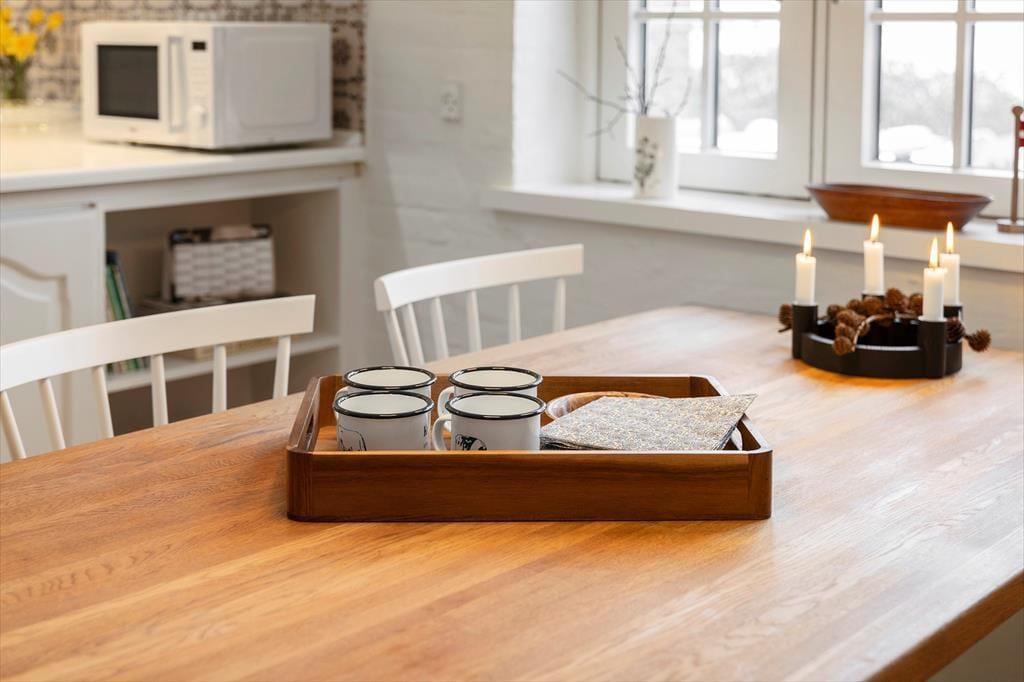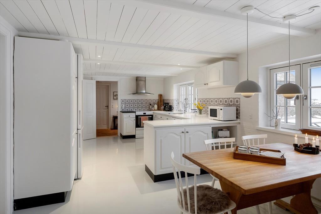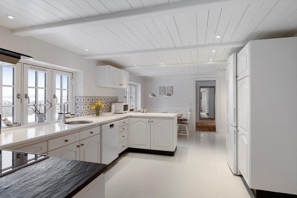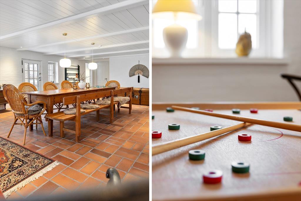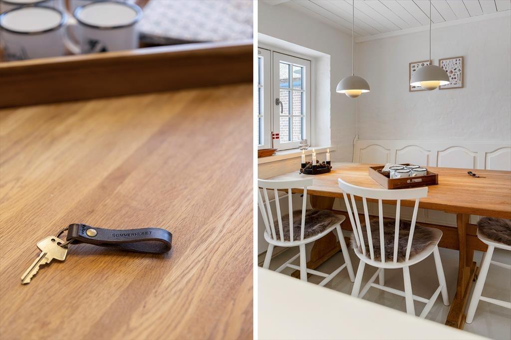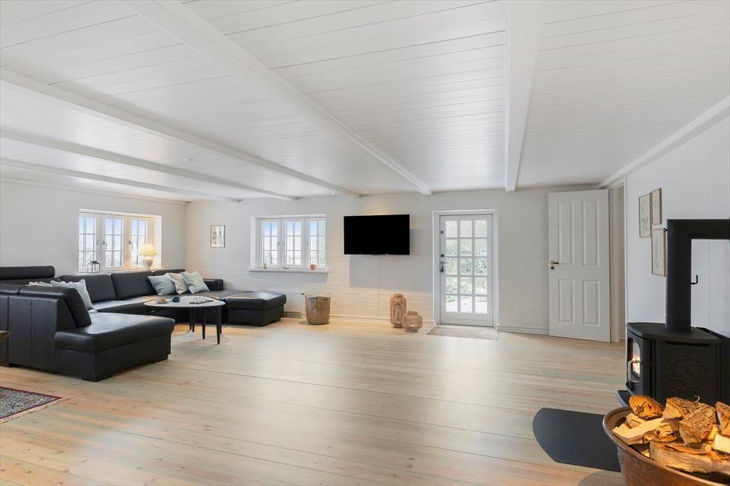 Indenfor mødes du af en lys og indbydende atmosfære, hvor det hyggelige sommerhusliv straks får lov at folde sig ud. De skrå vægge og det klassiske stråtag skaber en varm og autentisk stemning, mens de store vinduer inviterer fjordens smukke landskab helt ind i stuen. Her kan du slå dig ned i sofaen med en god bog, tænde op i brændeovnen og lade flammernes sagte knitren danne baggrund for rolige feriestunder. Opholdsstuen er indrettet til både afslapning og fælles hygge med tv og god plads til samvær. I forlængelse heraf finder du spisestuen med et langt spisebord, hvor familien kan samles til måltider, brætspil og lange samtaler, der varer til langt ud på aftenen. Køkken og opholdsrum hænger naturligt sammen og gør det nemt at være fælles om madlavning og feriens små ritualer. Husets indretning giver plads til både privatliv og fællesskab, så alle kan finde deres egen favoritplads – hvad enten det er med udsigt til fjorden eller tæt på brændeovnens varme.