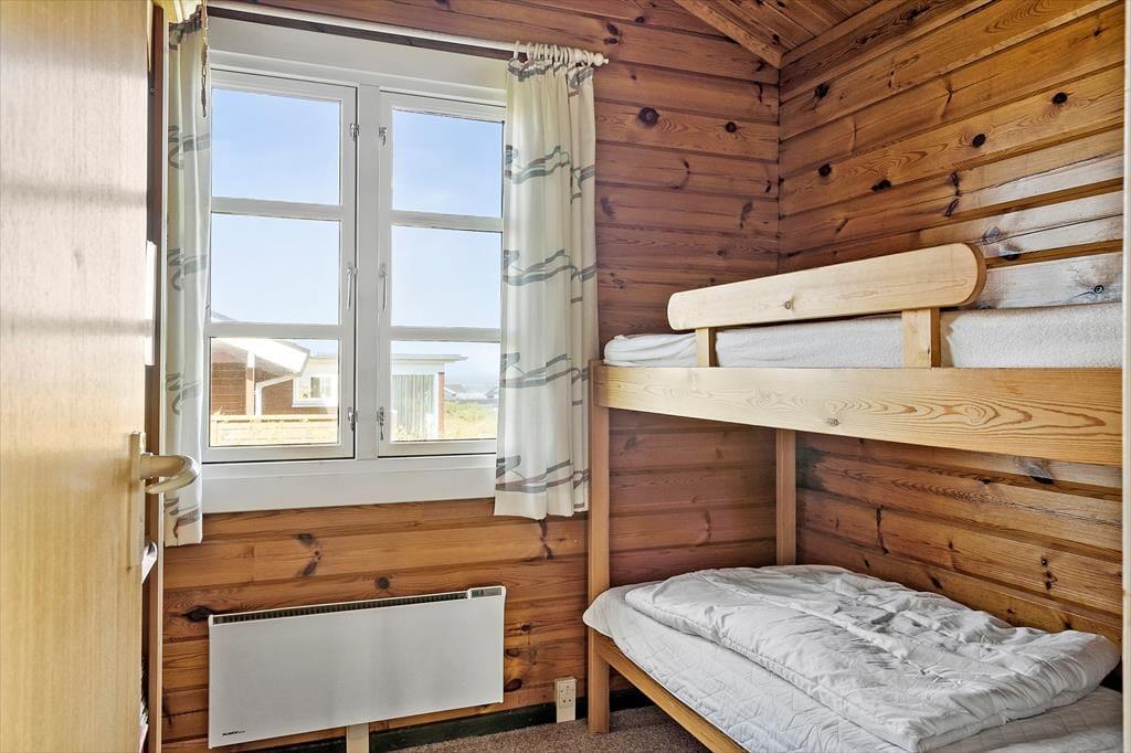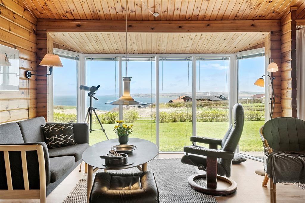 Det første, du lægger mærke til, når du træder indenfor i dette bjælkehus, er den særlige stemning, som kun træhuse kan give. Stuen er husets hjerte – og herfra strækker store vinduespartier sig mod fjorden og trækker landskabet helt ind i rummet. Når solen står lavt over vandet, og flammerne knitrer i brændeovnen, er det svært at forestille sig et bedre sted at samles. Det åbne køkken gør det nemt at holde snakken i gang, mens der kokkereres, og de rolige omgivelser skaber en helt særlig ro i hver en ferieformiddag og aften. Her kan I tage jer god tid – til brætspil, til gode bøger, og til at nyde hinandens selskab.