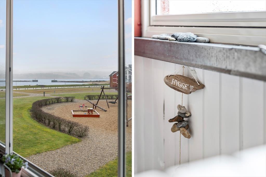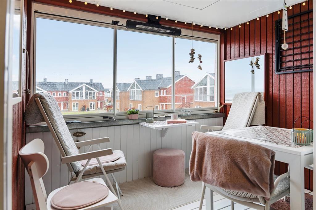 Fra ferielejligheden kan du træde ud på balkonen og nyde den smukke udsigt over fjorden og Lemvig Marina. Her er det oplagt at starte dagen med en kop kaffe, mens du ser ud over vandet og mærker den friske luft fra fjorden. Balkonen er udstyret med skydevinduer, så du kan sidde godt i læ og stadig nyde udsigten – uanset om solen skinner, eller vinden rusker lidt i marinaens master.