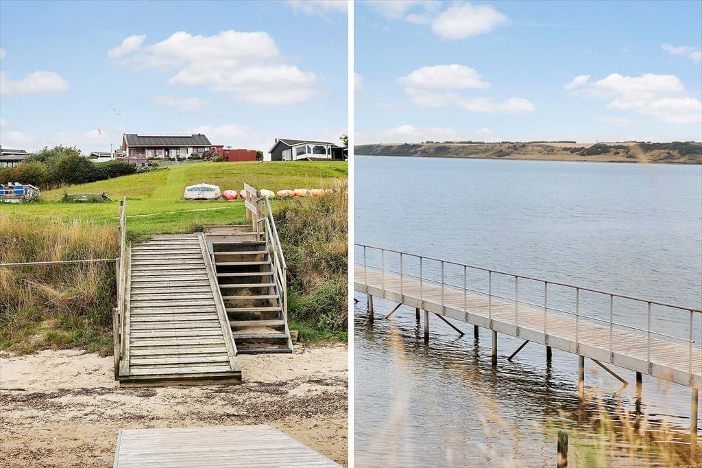 Sommerhuset ligger fredeligt placeret i det naturskønne Gjellerodde-område, hvor Limfjordens rolige bølger møder et varieret landskab af grønne bakker og åbne vidder. Her kan du vandre, cykle eller blot nyde udsigten – for eksempel fra de nærliggende stier, der snor sig langs vandet og op gennem klitbakkerne. Har du lyst til lidt mere liv, kan du tage turen til Lemvig, hvor du finder både hyggelige butikker, caféer og det populære Klimatorium. Også Lemvigbanens lille tog kører tæt forbi området og inviterer til en afslappende tur gennem det vestjyske fjordlandskab. I nærområdet finder du desuden både golfbane, naturlegeplads og gode fiskepladser – så uanset om du er til aktivitet eller afslapning, er mulighederne mange.