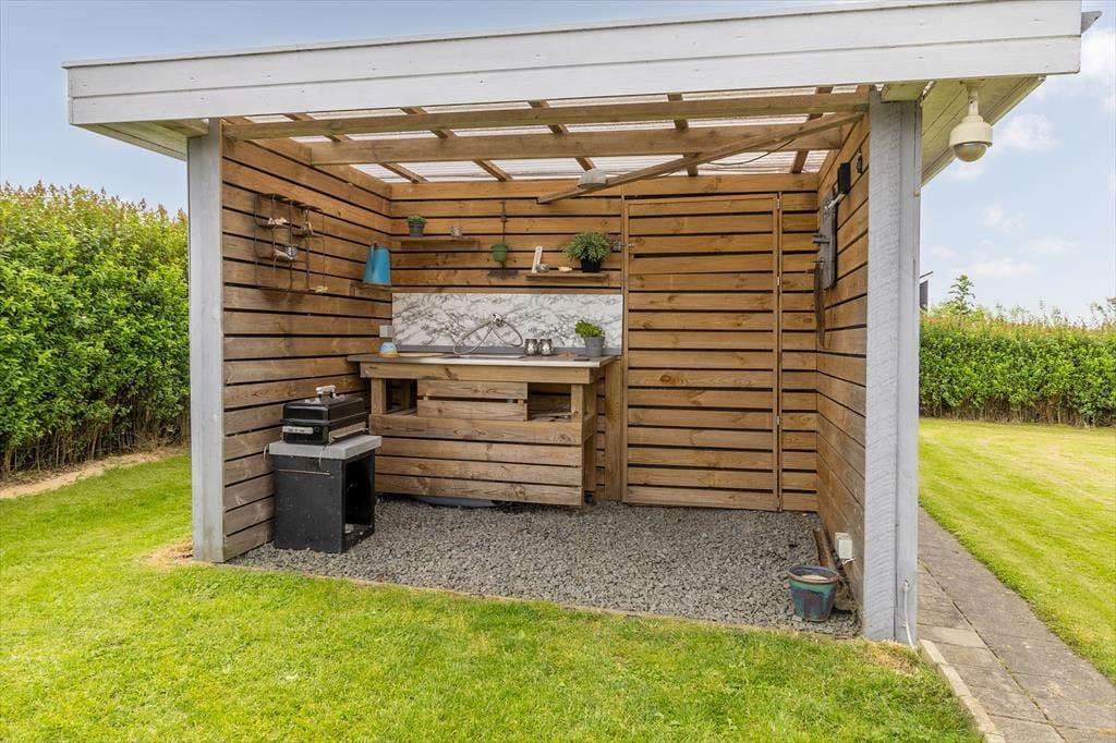 I haven omkring sommerhuset er der masser af plads til leg, latter og lange sommerdage under åben himmel. Børnene kan spille bold eller lege gemmeleg mellem træer og buske, mens de voksne slapper af i solen med en god bog. Den fine have inviterer til udendørs måltider, og her kan I både lave mad i det praktiske udekøkken og samles om bålstedet, når mørket falder på. Der er noget ganske særligt ved at bage snobrød eller riste skumfiduser over gløderne, mens stjernerne tændes på himlen. Hunden er også velkommen og vil uden tvivl elske at snuse rundt i de trygge, grønne omgivelser. Hvad enten I nyder morgensolen med kaffe på terrassen eller afslutter dagen med grillmad og lyden af knitrende ild, så danner Violvej 10 den perfekte kulisse for jeres ferieminder.