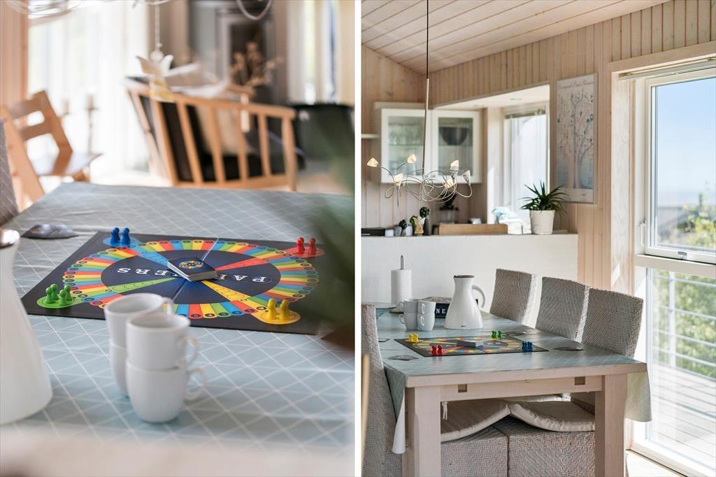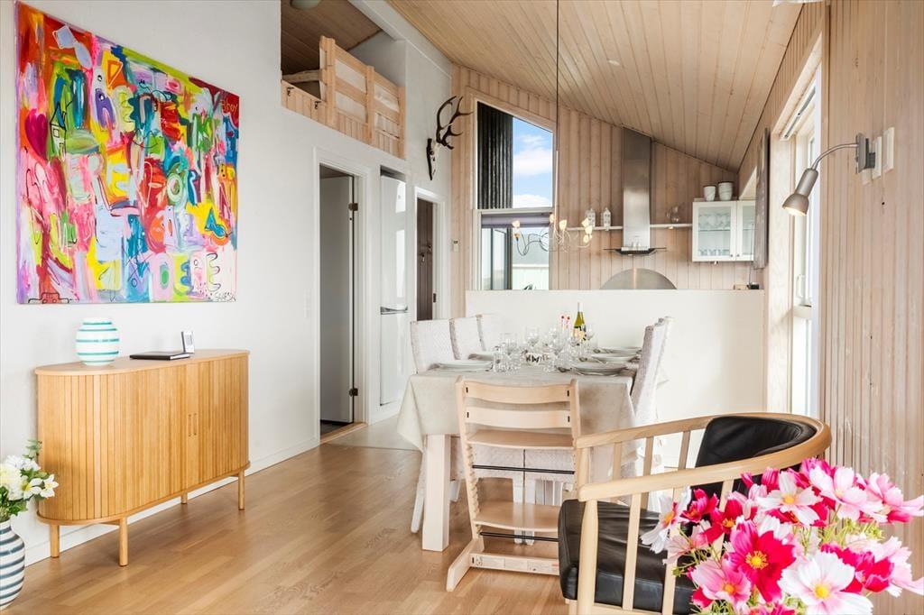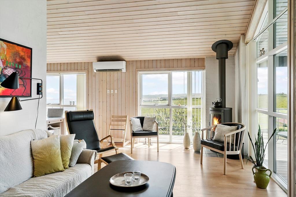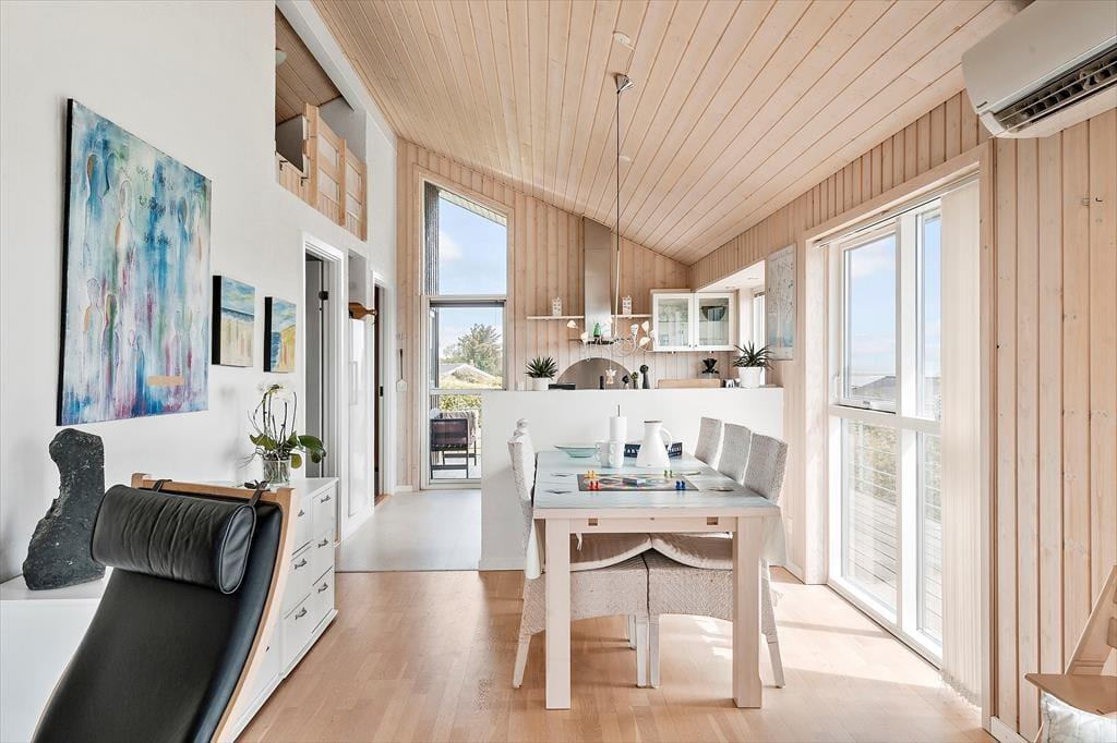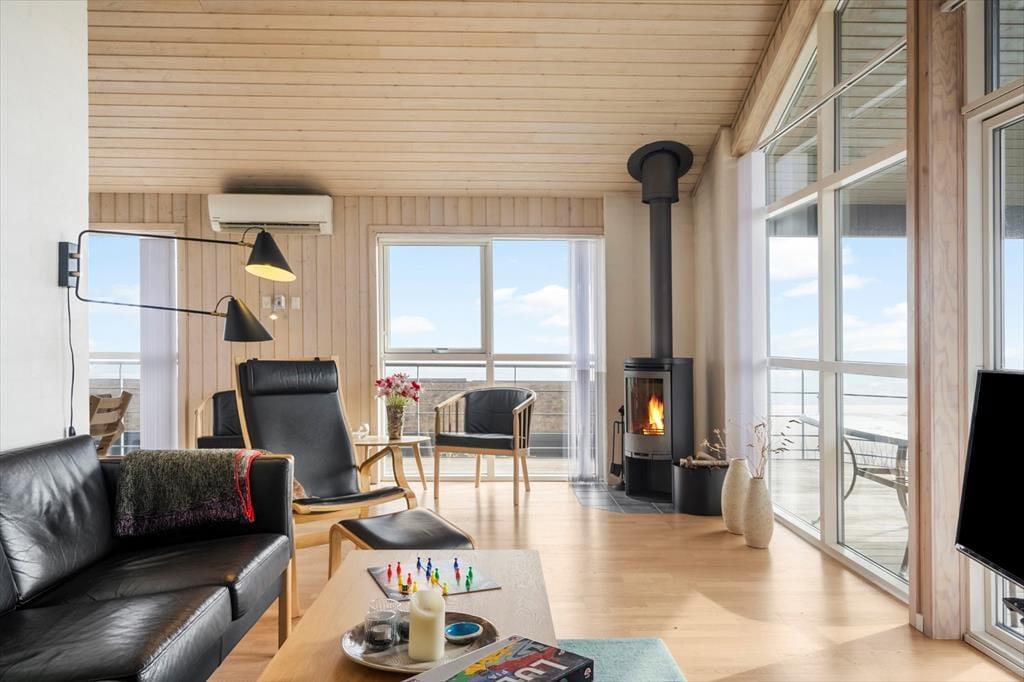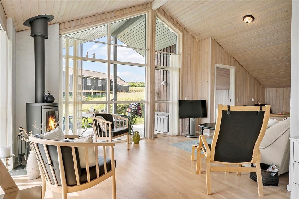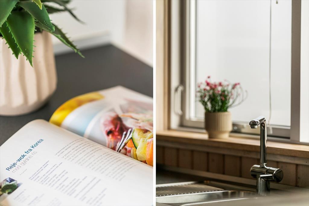 Når du træder indenfor, bliver du mødt af en dejlig, lys atmosfære og en indretning, der får dig til at føle dig hjemme med det samme. Den åbne opholdsafdeling med stue og køkken samler hele huset og indbyder til hyggestunder foran brændeovnen, der spreder varme og ro, når aftenerne bliver kølige. Et af husets mest charmerende elementer er den hyggelige alkove og den lille hems – perfekte gemmesteder for børn eller til en stille stund med en god bog. Store vinduespartier inviterer lyset og naturen indenfor, og uanset om du er i køkkenet eller har sat dig til rette i sofaen, har du fjorden i horisonten. Indretningen er gennemtænkt og komfortabel, så her er alt, hvad du skal bruge for at nyde ferien i dit helt eget tempo.