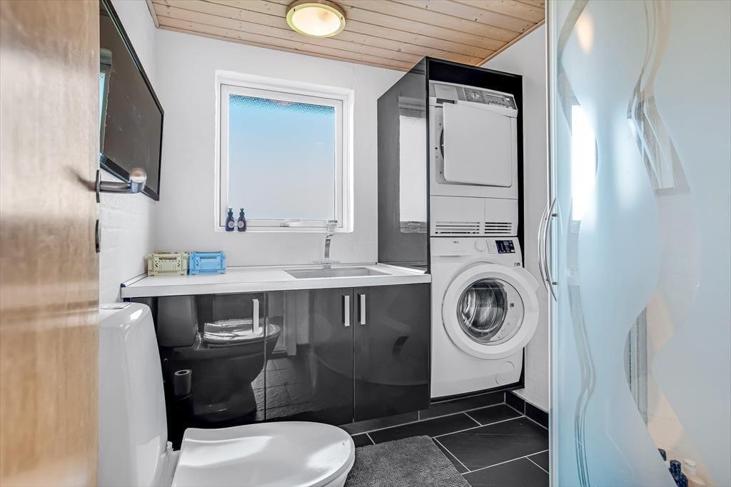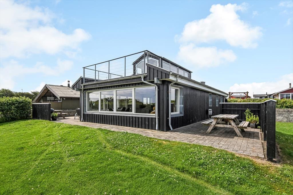 Udenfor fortsætter oplevelsen – og bliver kun bedre. Fra huset kan du gå direkte ud på skønne terrasseområder, hvor du altid kan finde en plads i solen eller skyggen alt efter behov. Højdepunktet er dog den velplacerede tagterrasse, hvor udsigten over fjorden for alvor folder sig ud. Her kan du nyde morgenkaffen i stilhed eller runde dagen af med et glas vin i det sidste sollys. Haven omkring huset er grøn og enkel, og den høje placering giver en helt særlig ro – som skabt til at trække vejret dybt og finde roen. Har du hunden med, er det let at slippe den løs i snor og tage en tur gennem området – måske endda hele vejen ned til stranden for en frisk dukkert eller en stille gåtur langs vandet.
