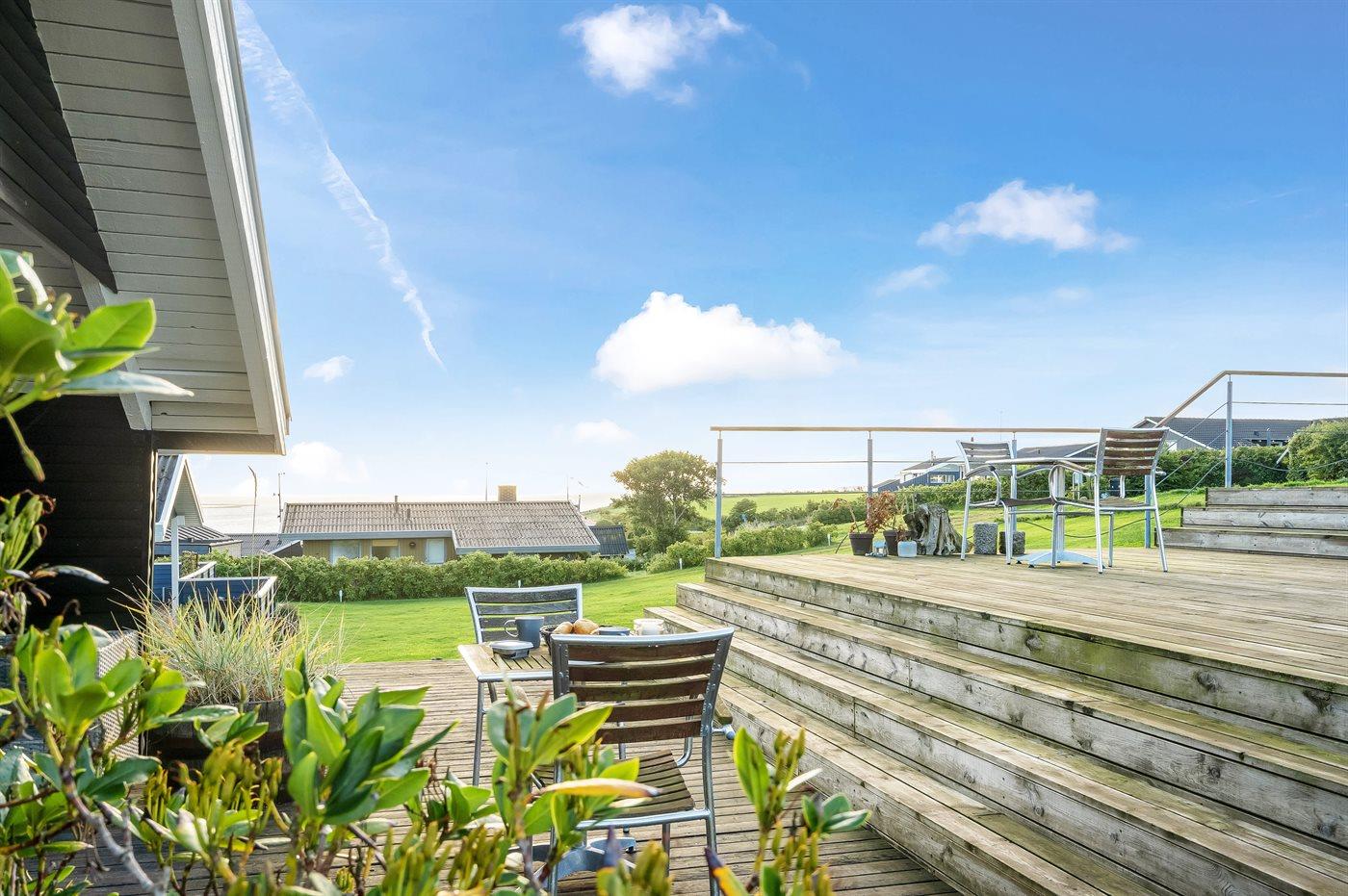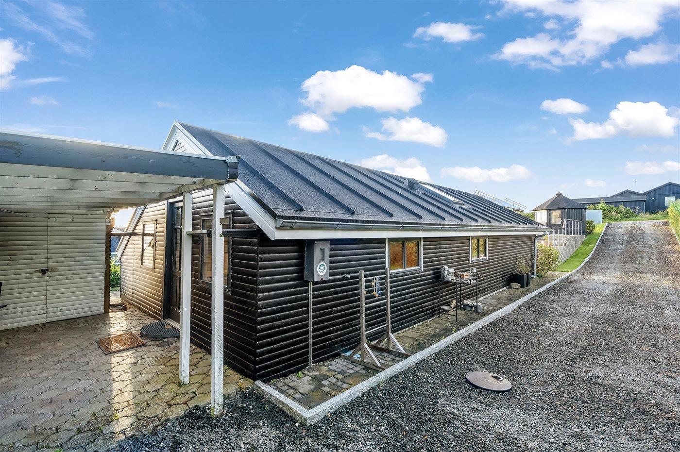 Virkelig skønt sommerhus beliggende på en kuperet grund med græsplæne tæt på fjorden. Til huset hører skønne niveauopdelte terrassearealer
