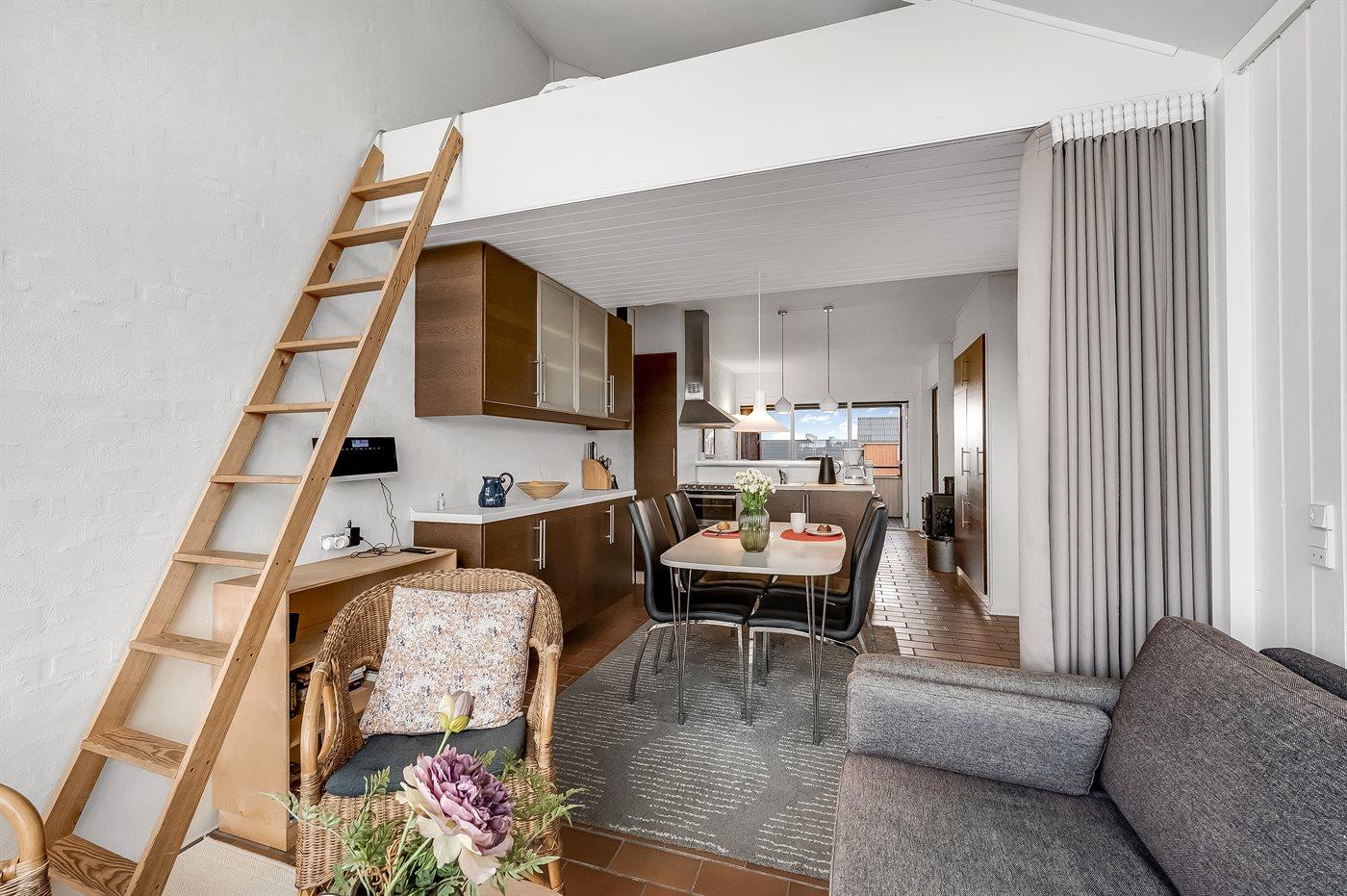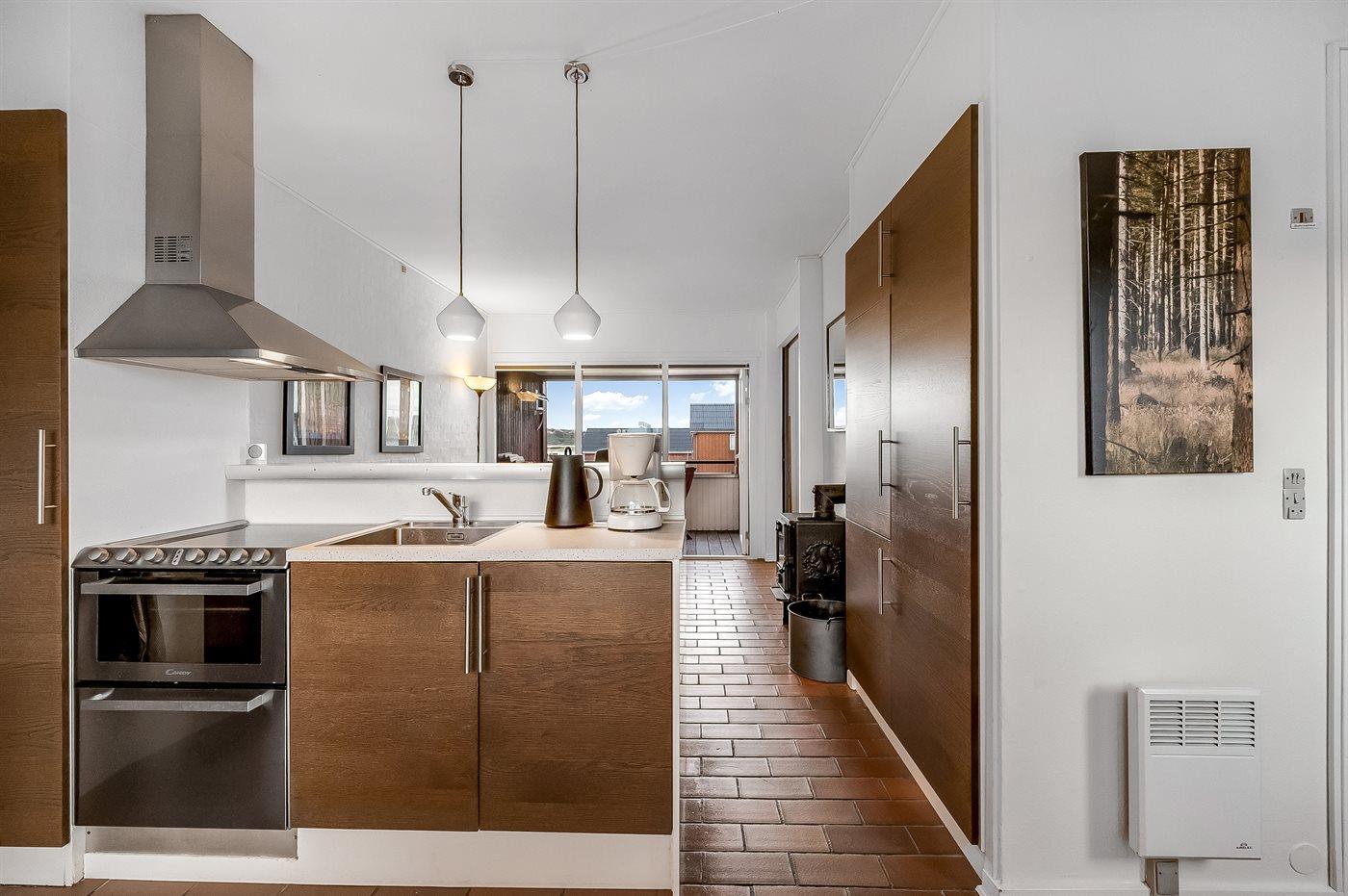 Køkkenet er udstyret med 1 køleskab. Der er 4 keramiske kogeplader, varmluftovn, mikrobølgeovn samt opvaskemaskine.