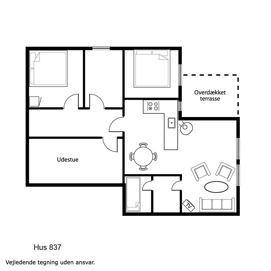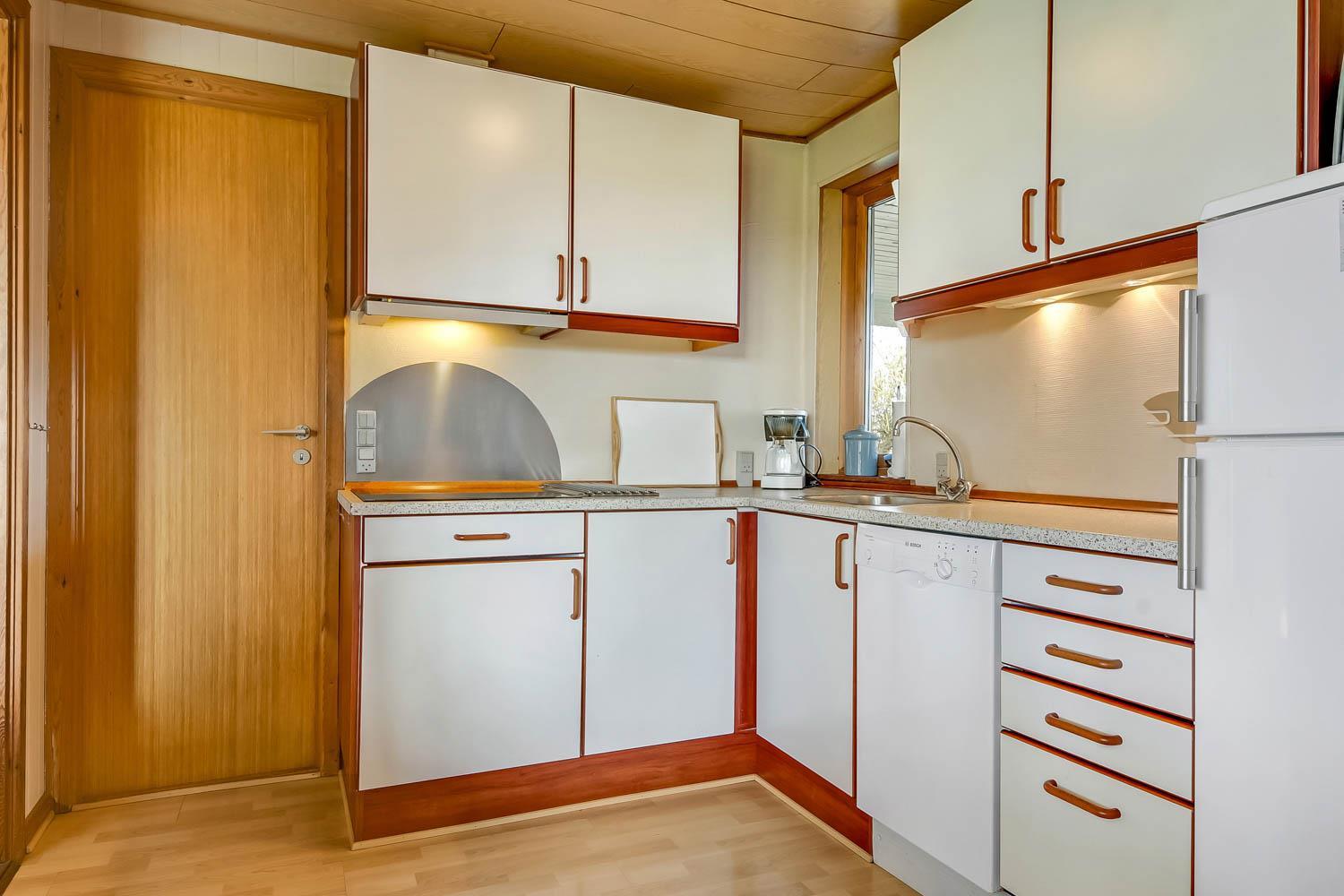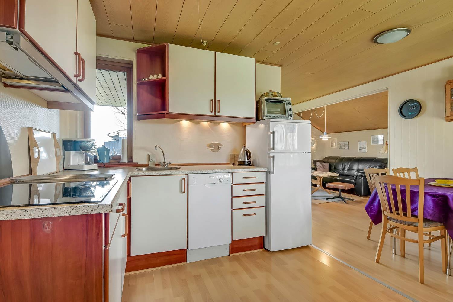 Feriehuset er enkelt og funktionelt indrettet med kombineret køkken og opholdsstue. Køkkenet er udstyret med glaskeramisk komfur, køle-/fryseskab, emhætte, opvaskemaskine og mikroovn. Opholdsstuen har TV med danske og tyske programmer samt parabol (kun tyske kanaler) og brændeovn.