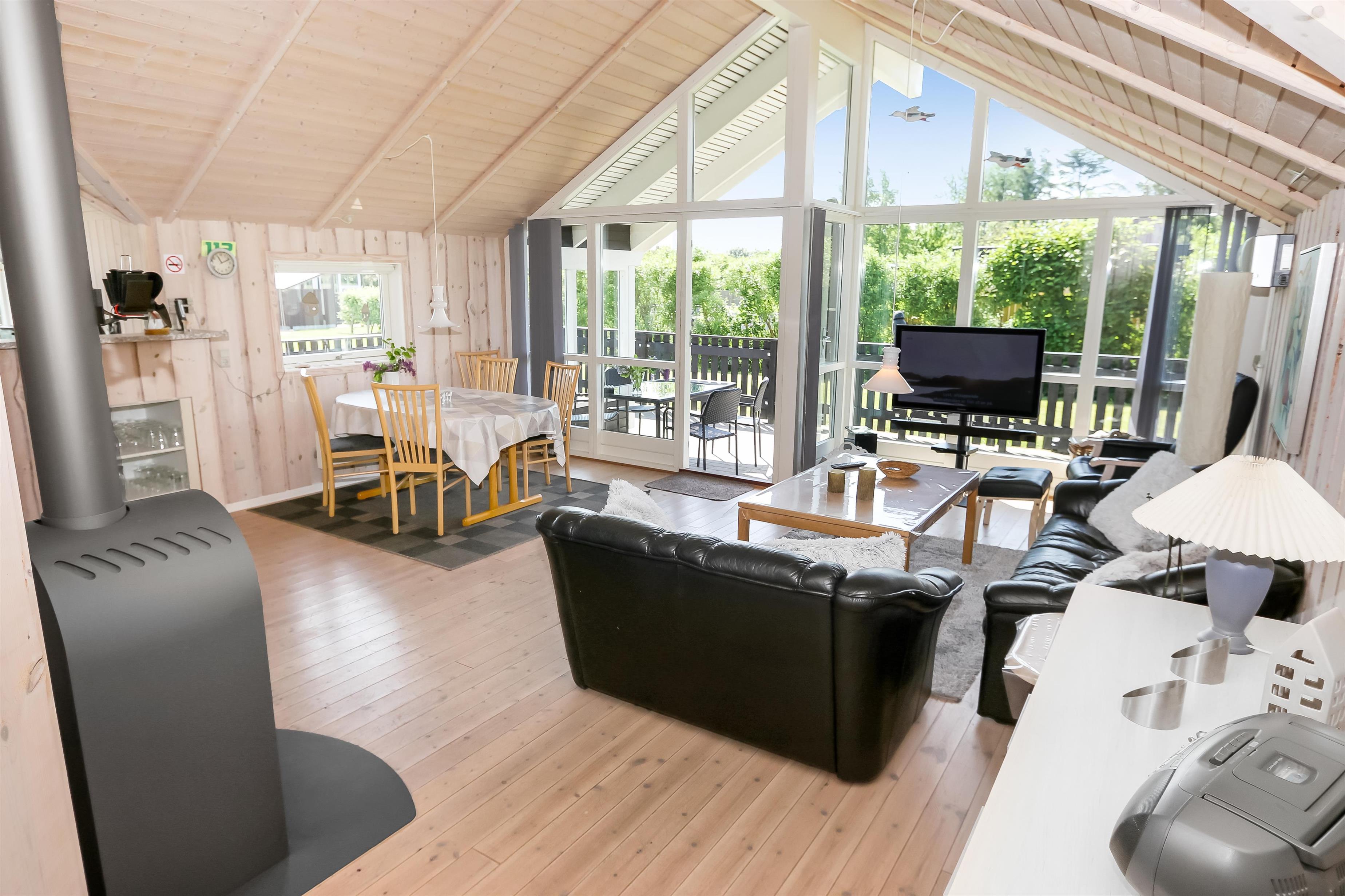Særdeles flot og velplejet feriehus på 87 m2 med 3 gode soverum (1DS, 1DS, 1KS). En dejlig entré med afliggeplads, vaskemaskine og tørretumbler byder velkommen. Kombineret opholdsstue og køkkenhjørne i kip og med store vinduespartier som gør huset lyst og venligt. Opholdsstuen med gode lædermøbler, spisebord, TV med danske og tyske programmer, CD / DVD / Radio. Slap af foran den knitrende brændeovn som sammen med varmepumpen hjælper med at reducere udgiften til varmeregningen. Køkkenhjørnet er lyst og venligt og har alt i hårde hvidevarer: Komfur med glaskeramiske kogeplader, emhætte, køleskab med fryseboks, opvaskemaskine og alt i service / køkkengrej. Praktiske hårde gulve i opholdsstue, køkkenhjørne og i soveværelserne. Stort flot badeværelse med bruser, toilet, håndvask, klinkegulv med gulvvarme, spabad og direkte adgang til sauna. Ekstra badeværelse med toilet, håndvask og gulvvarme. Barneseng og højstol til børnene. Gratis adgang til Lemvig Idræts & kulturcenter hvor der er svømmehal mm. Se venligst : www.lemvig-idraets-og-kulturcenter.dk. Husdyr ikke tilladt. Ikke-ryger hus.