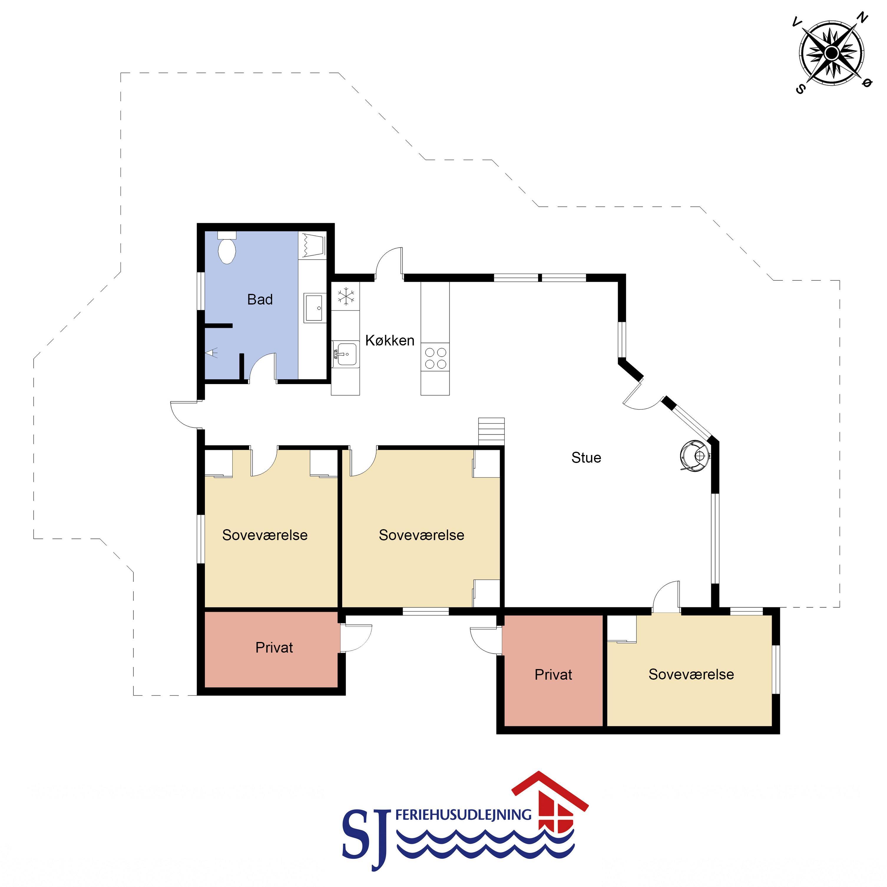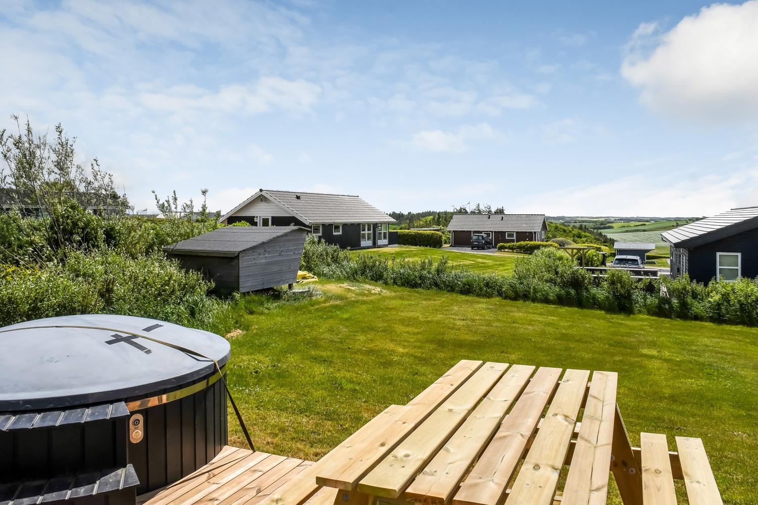 Flot, delvist overdækket terrasseanlæg med havemøbler, liggestole og grill som kan flyttes rundt på terrassen alt efter vejr og vind og efter hvor der findes en plads i solen. Ved terrassen er der også et lækkert vildmarksbad som opvarmes med træ - en unik oplevelse i al slags vejr. Højt, ugeneret beliggende på en stikvej på en velholdt grund på ca. 1.804 m2. Fra huset findes der er dejligt stisystem, som på få minutter fører direkte ned til vandet. Ca. 300 m fra huset ligger den nye flotte naturlegeplads i træ med fodboldbane og rutsjebane og der er heller ikke langt til indkøb eller til stranden ved Gjellerodde.