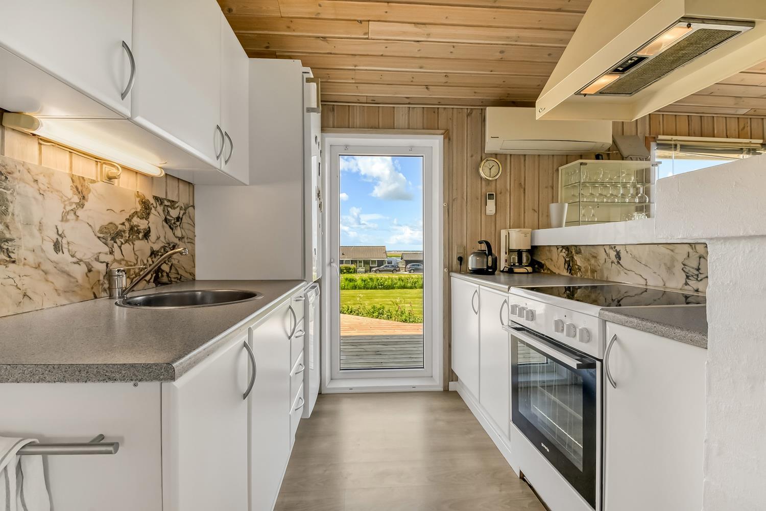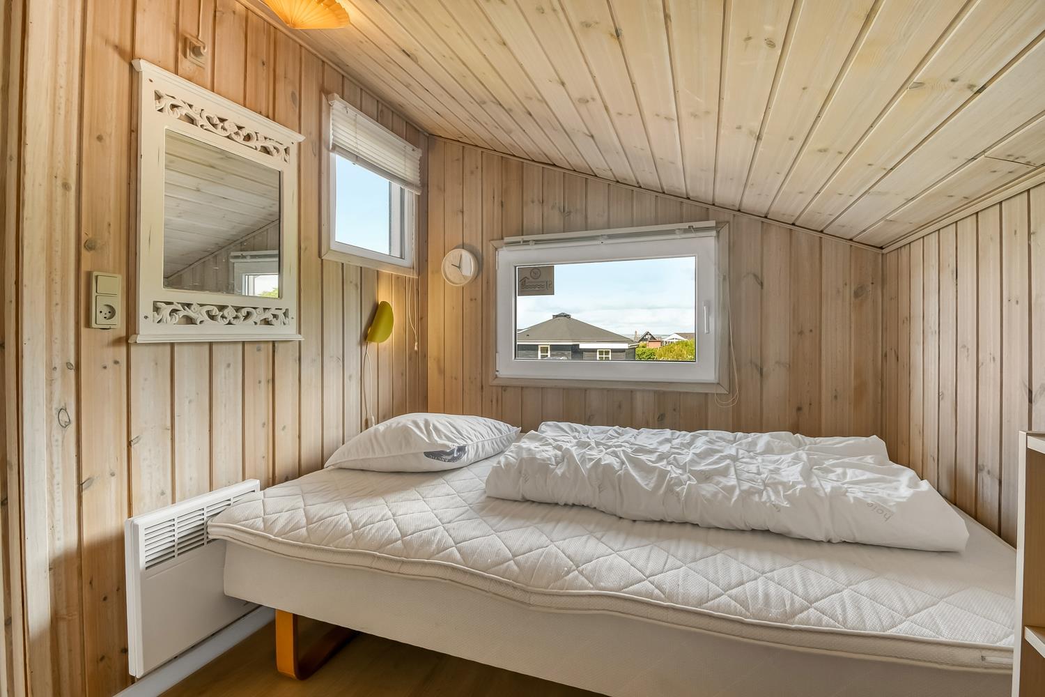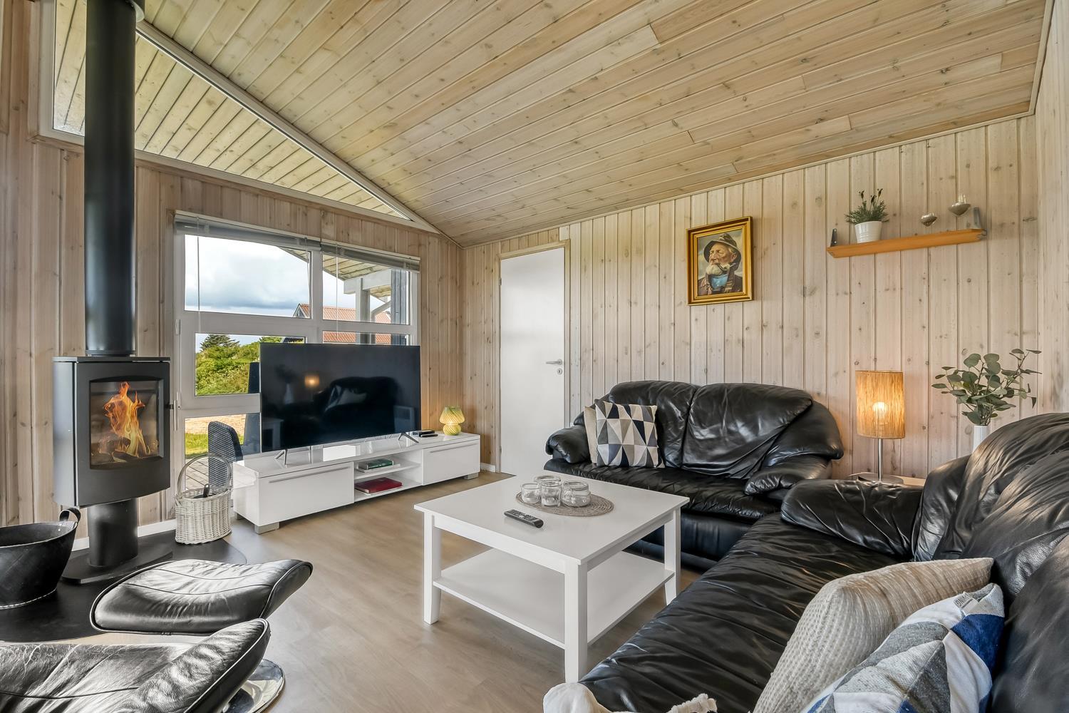 Træferiehus på ca. 74 m2. En entre byder jer velkommen til. Opholdsstuen er hyggeligt indrettet med lædermøbler, radio og TV med danske og tyske programmer og spisebord samt fantastisk udsigt. Slap af foran den knitrende brændeovn som sammen med varmepumpen hjælper med at reducere udgiften til varmeregningen. 3 soveværelser (1DS, 1DS, 2ES). Køkkenhjørne har elektrisk komfur med glaskeramiske kogeplader, emhætte, opvaskemaskine, køleskab med lille fryseboks. Dejligt badeværelser med toilet, håndvask, bruser og klinkegulv med gulvvarme. Rygning er ikke tilladt i huset. Max 1 husdyr tilladt. Det er den oplagte feriebolig med flot udsigt.