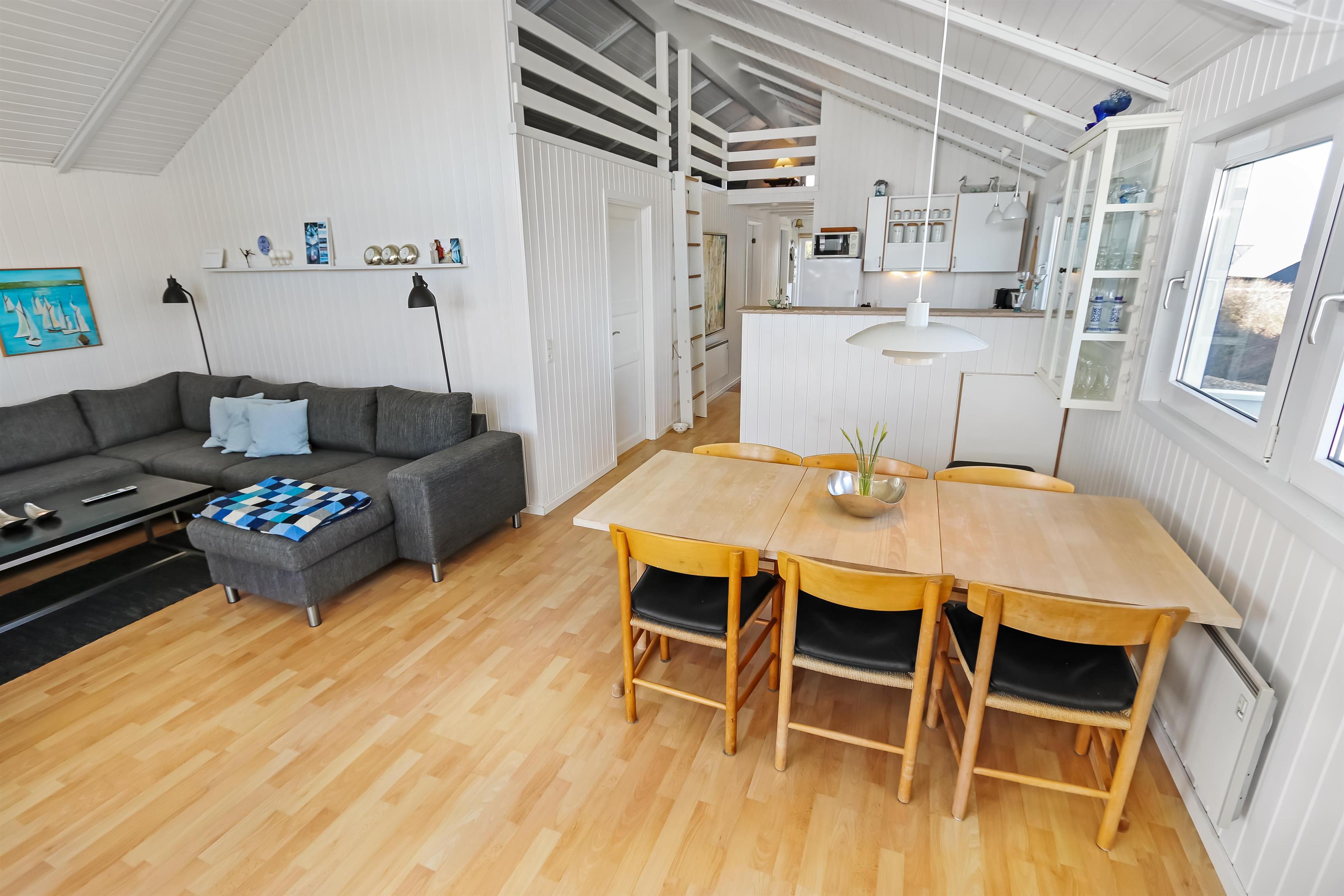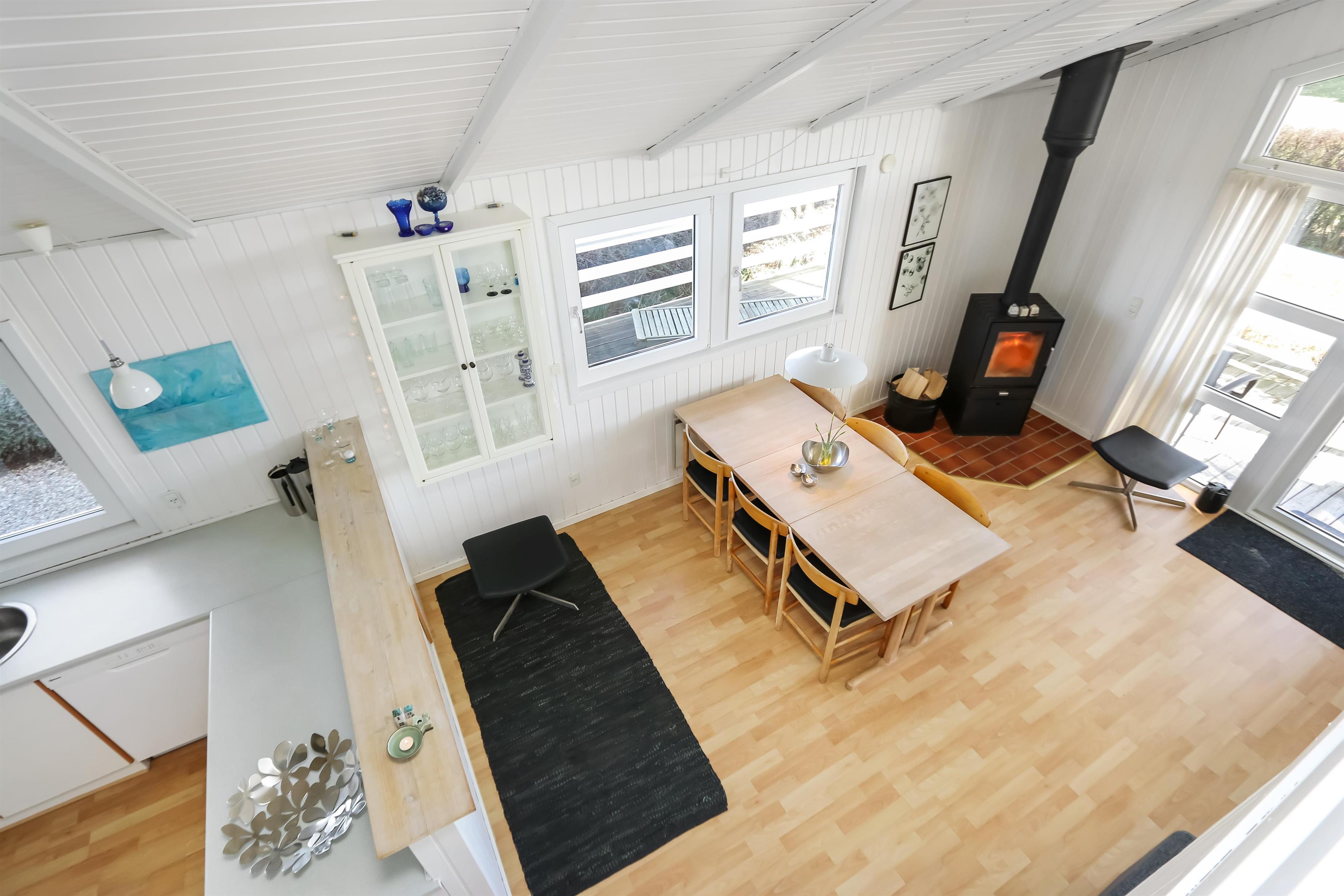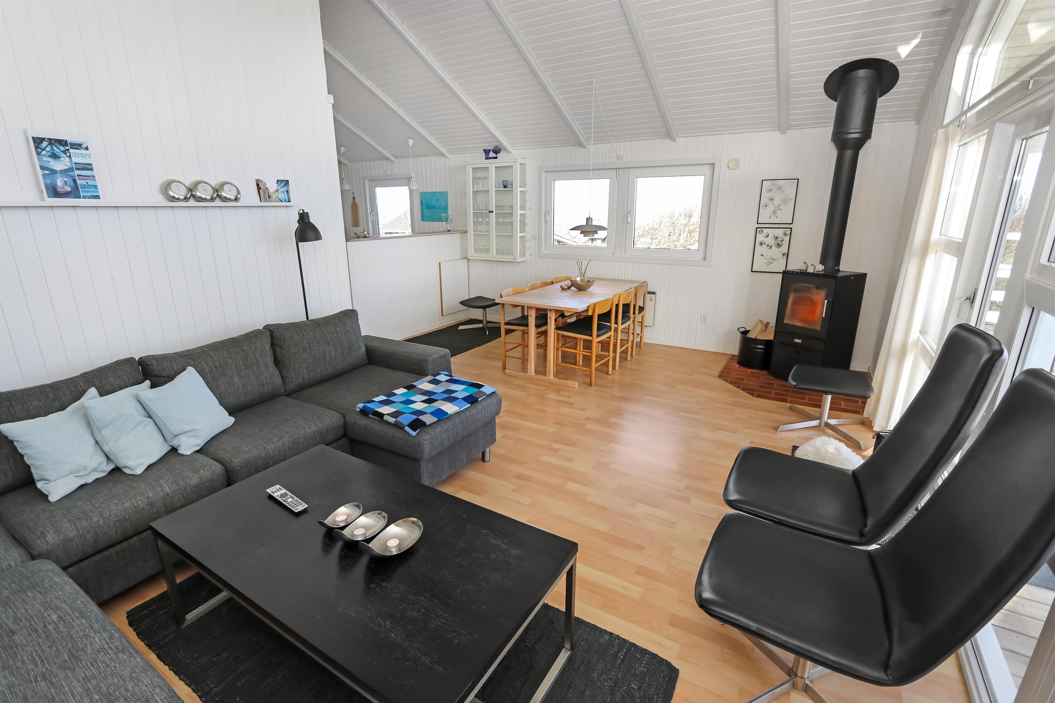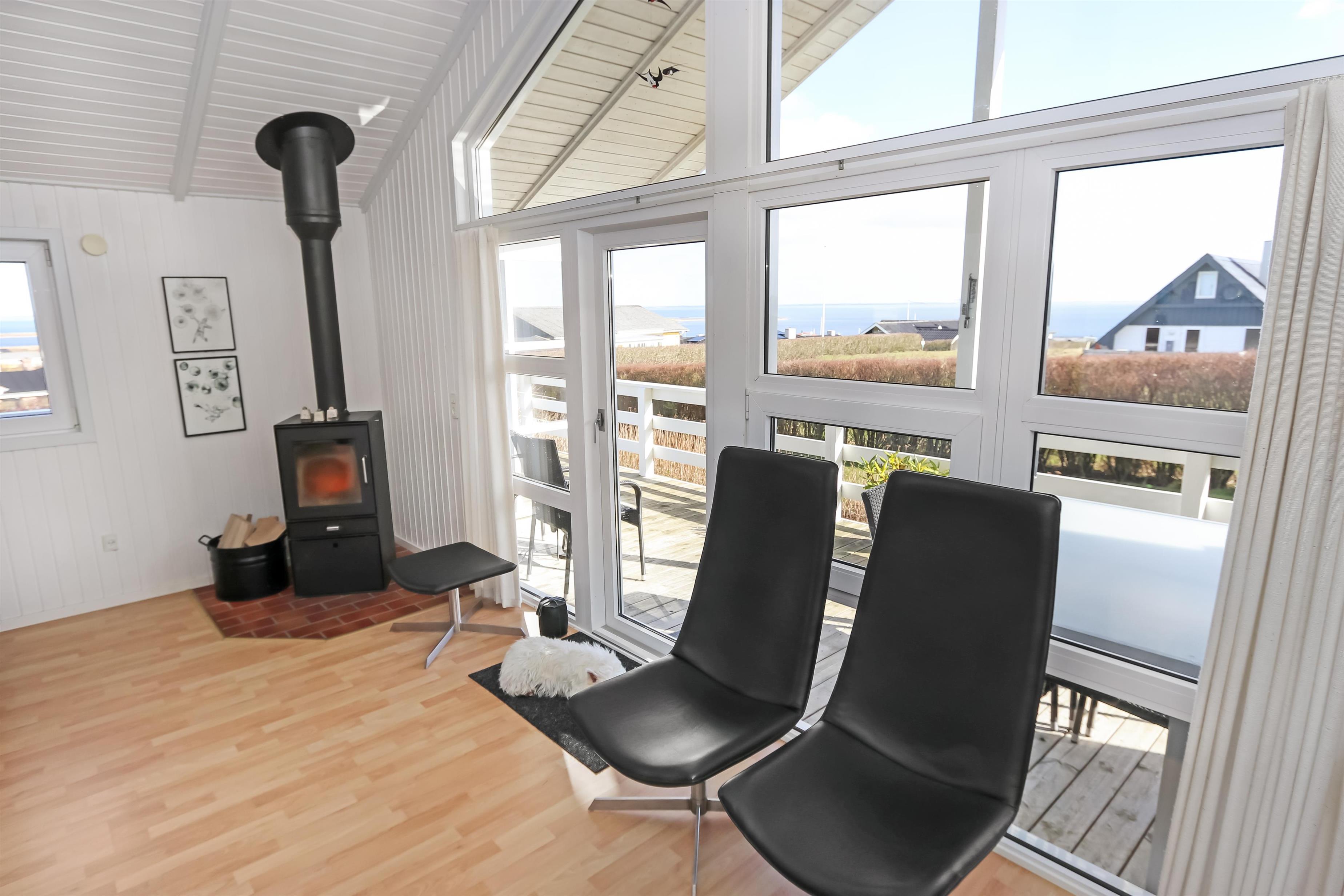 Allerede fra når i har parkeret bilen kan i se den flotte udsigt fra grunden. Stue og køkkenet er kombineret og der er åben til kip, de lyse farver i rummet og det store vinduesparti får hele rummet til at virke meget lys og hyggeligt. Stuen er med trægulv og flotte moderne lædermøbler, bærbar bluetooth højtaler, Smart-TV med danske programmer samt mulighed for streaming af TV / radio / Apps, så har du en mobiltelefon eller et andet device med kan du streame hvad du nu har abonnement. Spiseafdeling tæt ved køkkenet. Slap af foran den knitrende brændeovn som sammen med varmepumpen hjælper med at reducere udgiften til varmeregningen. Flot køkkenafdeling med alle tænkelige hjælpemidler så som El-komfur, køleskab med 30 l frostboks, opvaskemaskine og mikroovn. 3 gode soverum: 1DS + 1DS + 1 3/4 seng. Fra stuen er der opgang til hems med 3 sovepladser. Flot badeværelse: Toilet, håndvask, bruser, gulvvarme og spa. Gæstetoilet: Toilet og håndvask. Desuden er der en vaskemaskine i huset. Dette hus er et ikke rygerhus.