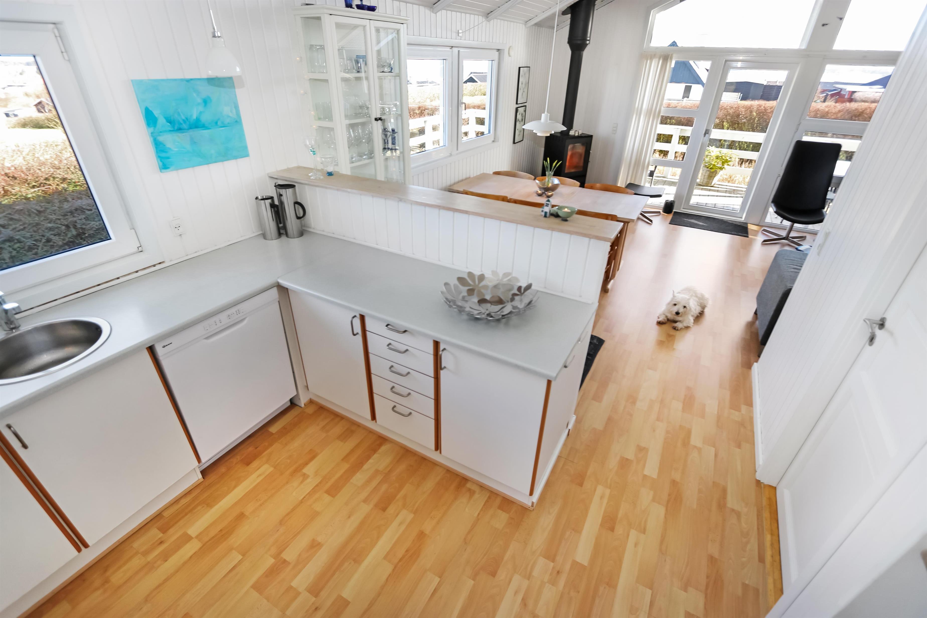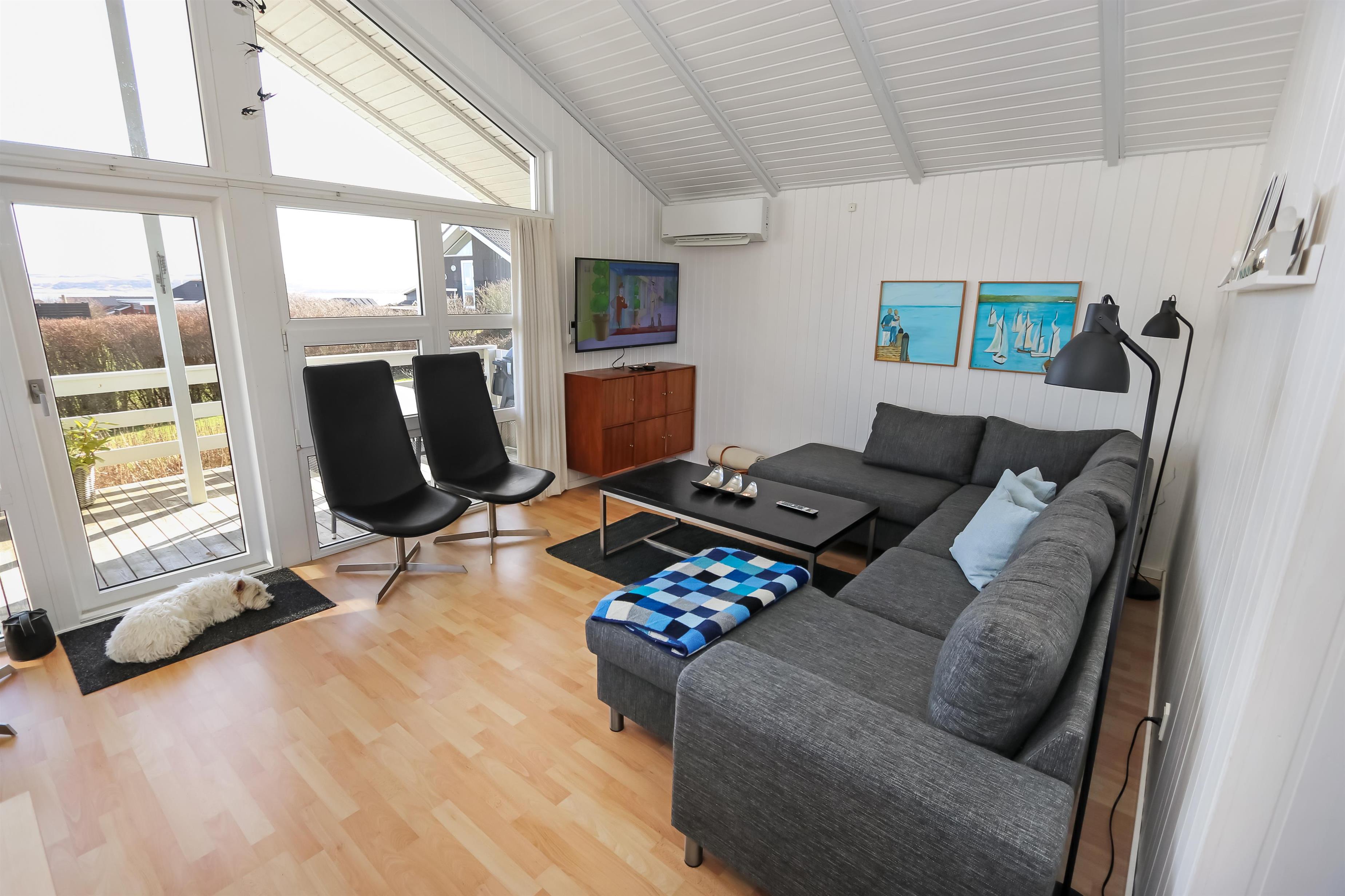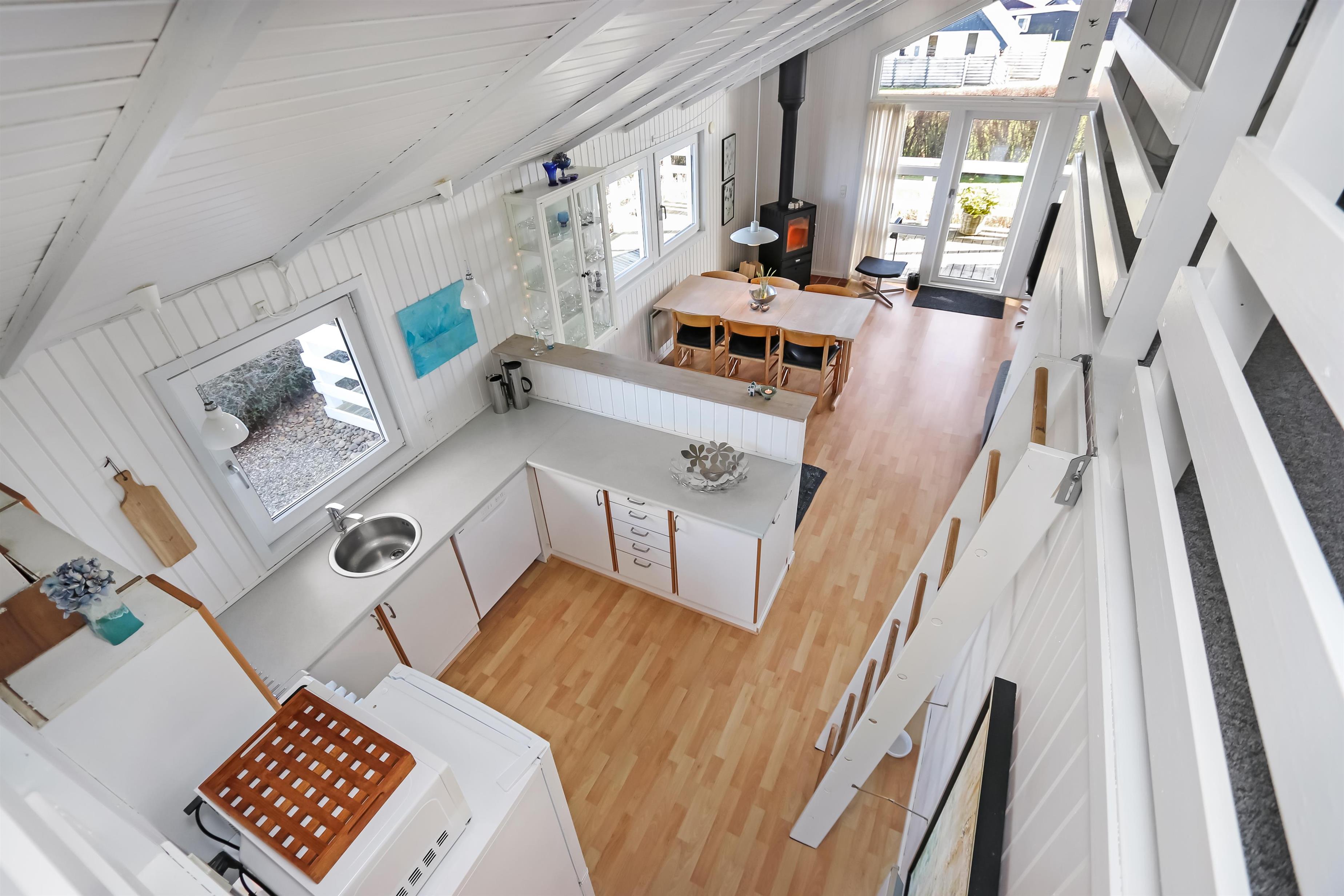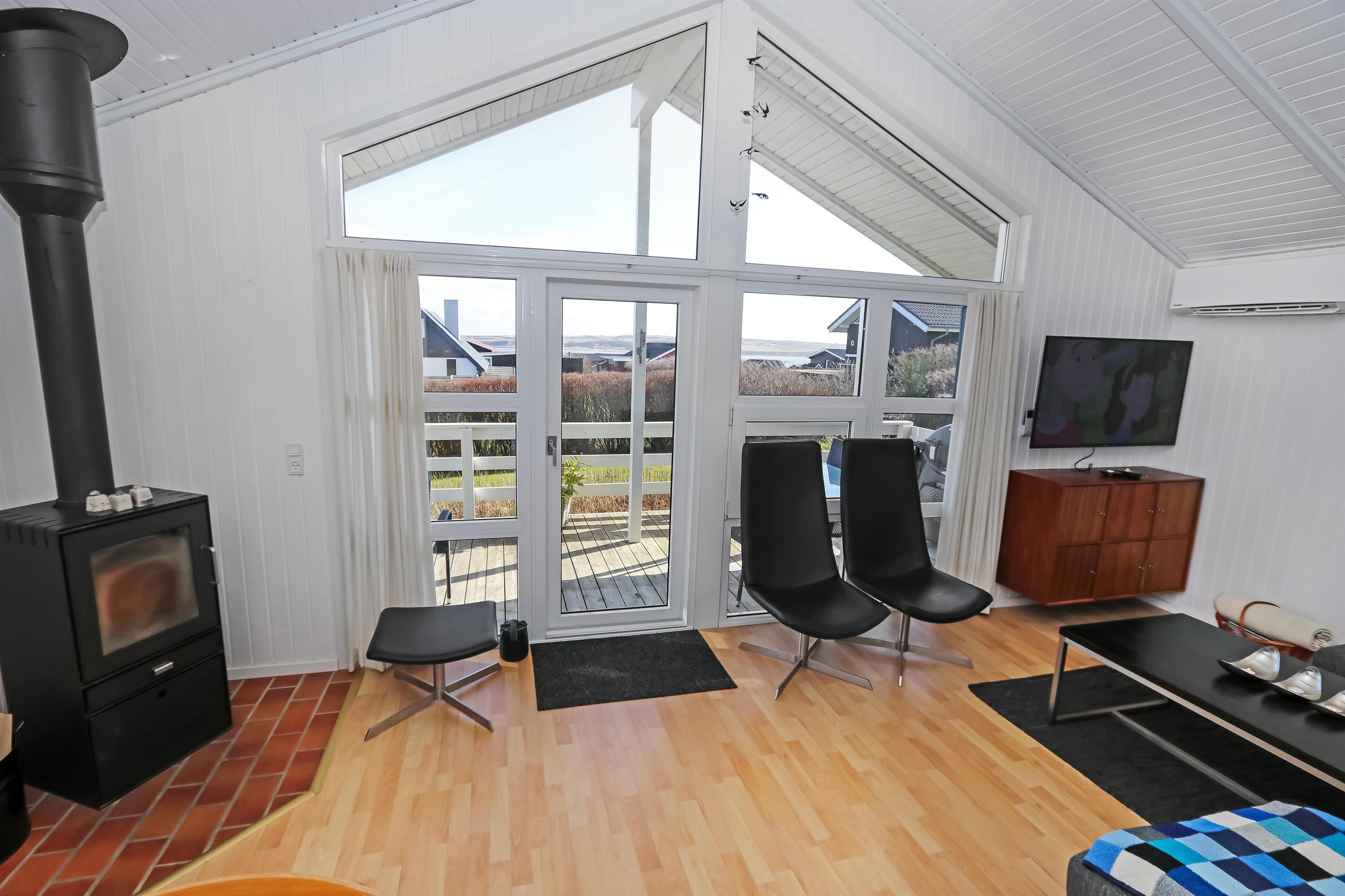 Allerede fra når i har parkeret bilen kan i se den flotte udsigt fra grunden. Stue og køkkenet er kombineret og der er åben til kip, de lyse farver i rummet og det store vinduesparti får hele rummet til at virke meget lys og hyggeligt. Stuen er med trægulv og flotte moderne lædermøbler, bærbar bluetooth højtaler, Smart-TV med danske programmer samt mulighed for streaming af TV / radio / Apps, så har du en mobiltelefon eller et andet device med kan du streame hvad du nu har abonnement. Spiseafdeling tæt ved køkkenet. Slap af foran den knitrende brændeovn som sammen med varmepumpen hjælper med at reducere udgiften til varmeregningen. Flot køkkenafdeling med alle tænkelige hjælpemidler så som El-komfur, køleskab med 30 l frostboks, opvaskemaskine og mikroovn. 3 gode soverum: 1DS + 1DS + 1 3/4 seng. Fra stuen er der opgang til hems med 3 sovepladser. Flot badeværelse: Toilet, håndvask, bruser, gulvvarme og spa. Gæstetoilet: Toilet og håndvask. Desuden er der en vaskemaskine i huset. Dette hus er et ikke rygerhus.