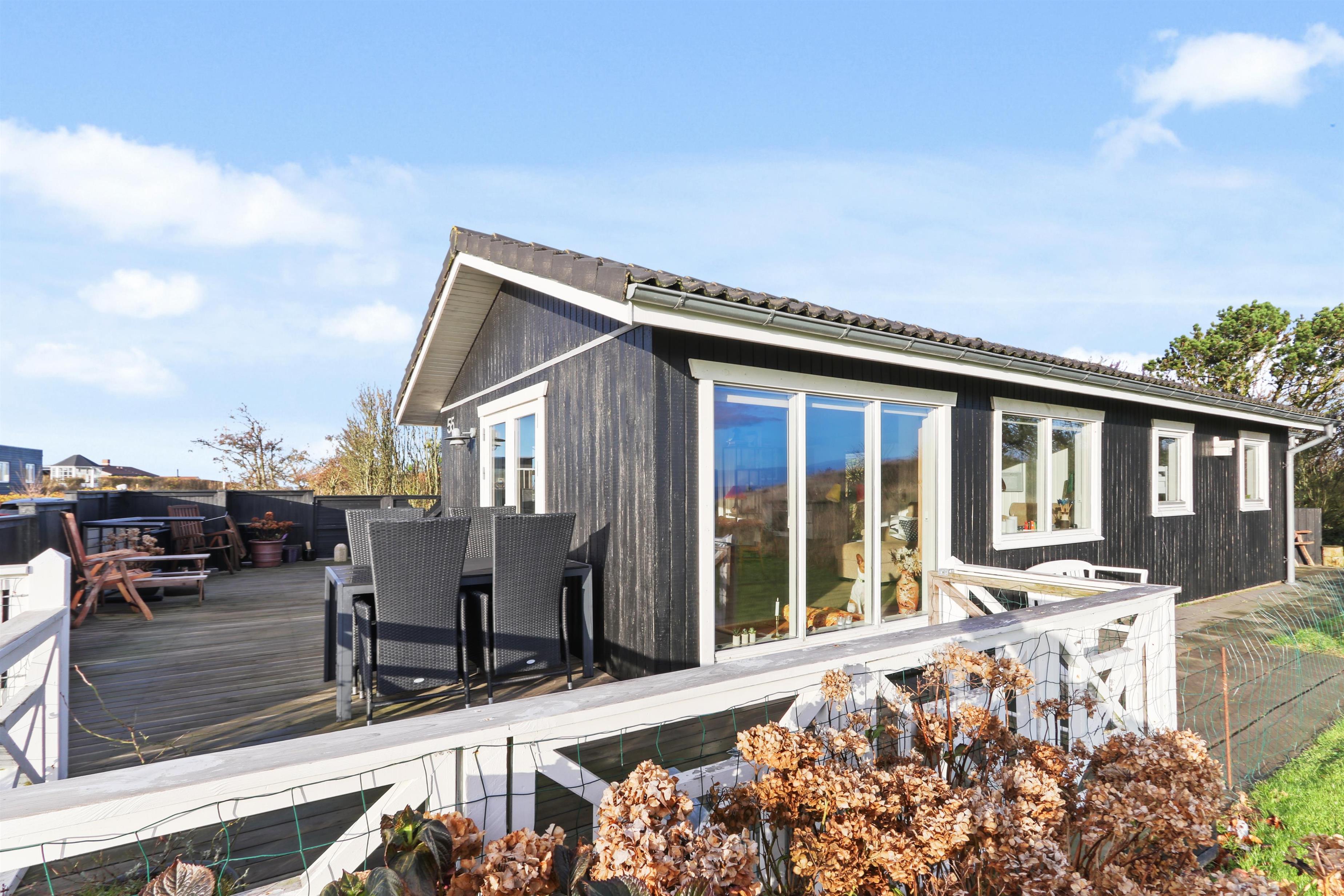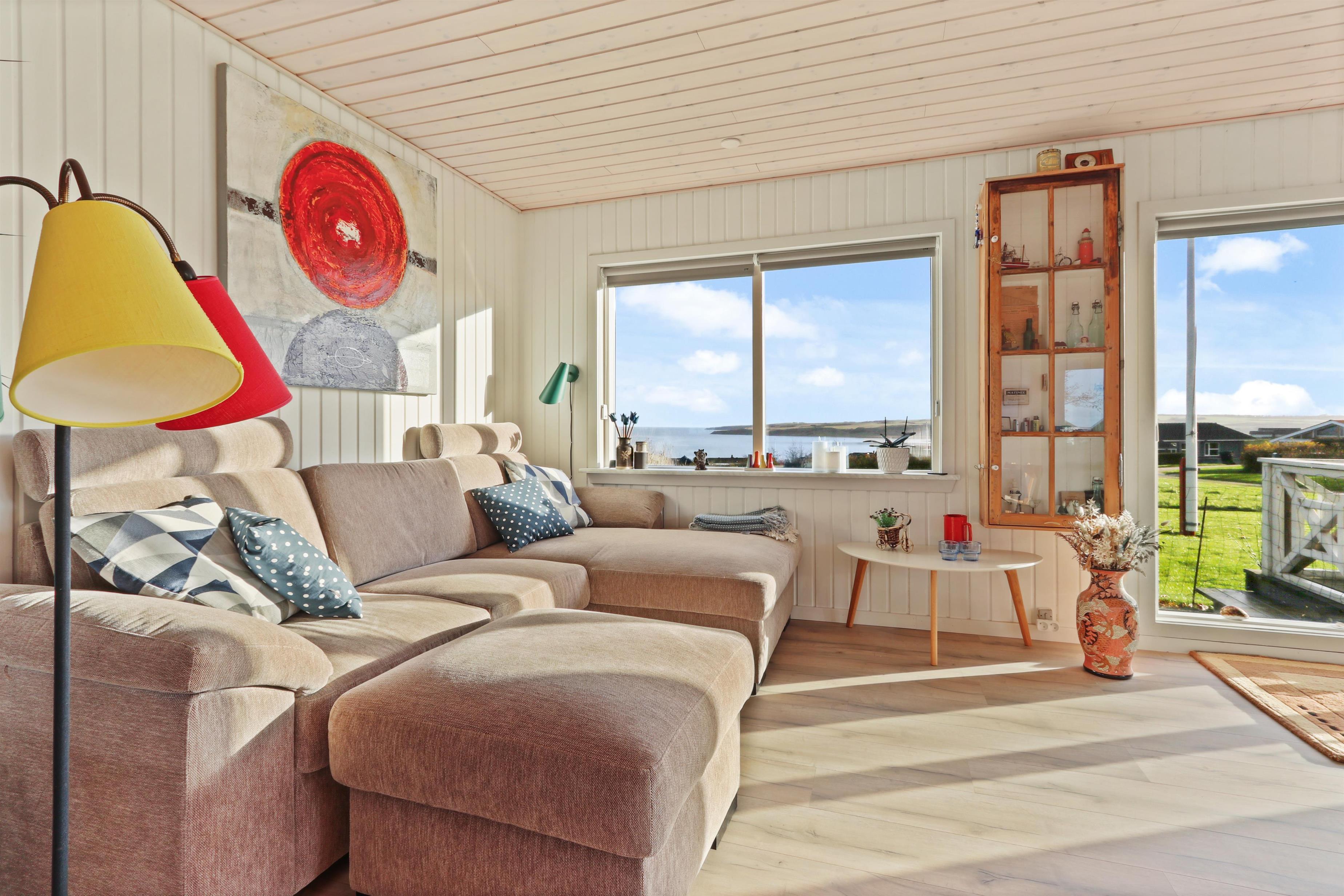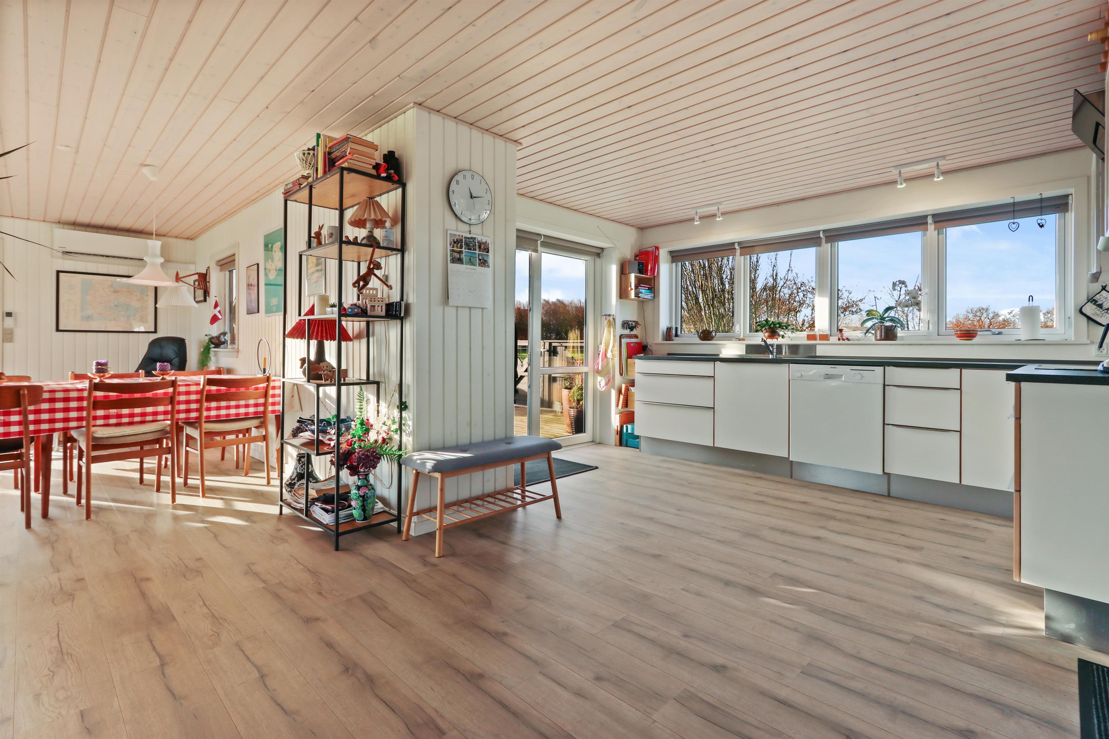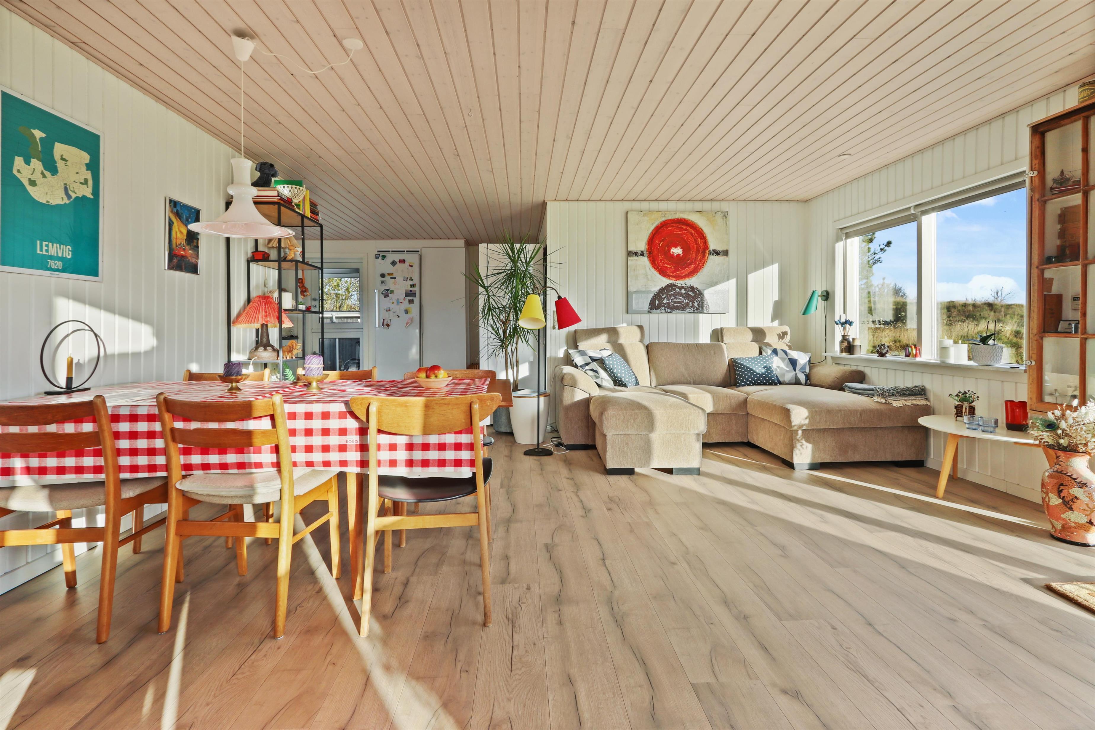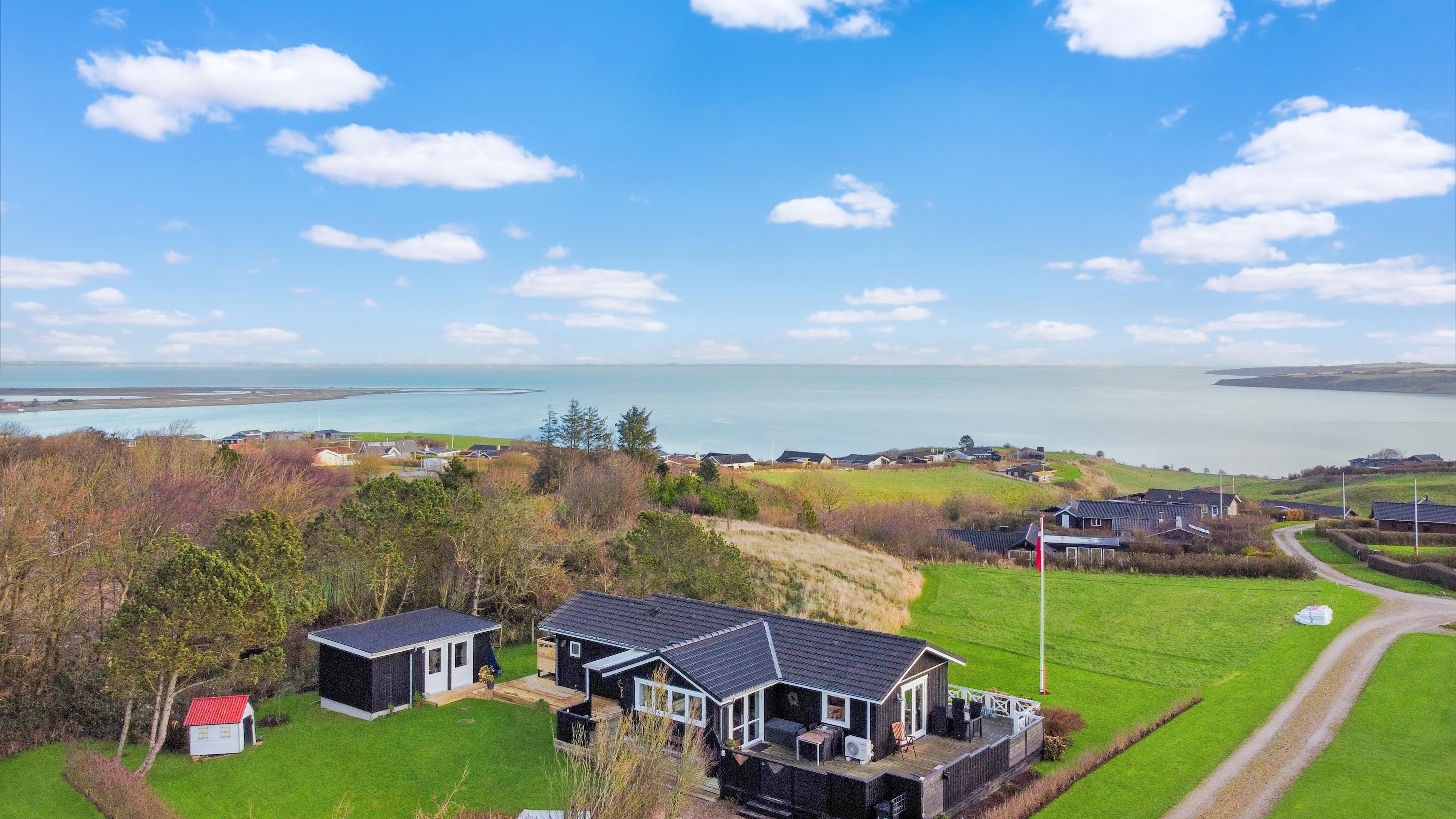 Feriehuset har en størrelse på 85 m2 og er flot istandsat i 2020 og løbende. Når man træder ind i huset, står man i husets dejlige lyse og indbydende hjerterum, som består af kombineret køkken og stue. Fra stuen og køkkenet er der udgang til husets store terrasse, hvorfra udsigten er et levende maleri. Husets køkken er udstyret med induktionskogeplader, indbygningsovn, emhætte, mikroovn, opvaskemaskine og køle-/fryseskab. Køkkenet har et stort vinduesparti, der giver et flot lysindfald og Vesterhavet kan anes i horisonten. Går man videre fra køkkenet bliver man mødt af stuen der er hyggelig og personlig indrettet. Stort vinduesparti giver dejligt lys til hele rummet, som også er med til at gøre stuen mere rummelig og herfra kan udsigten mod Limfjorden nydes. Stuen er udstyret med polstermøbler, fjernsyn hvorfra man kan streame egne apps via Chromecast og der er en DAB-radio. I stuen er der opsat en varmepumpe, der er med til at holde strømforbruget nede. Stuen giver plads til hele familien og er indbydende at tilbringe film- og spille-aftener. Fra stue og køkken kommer man ud i gangen, hvorfra man kommer til badeværelset og soveværelserne. Badeværelset er optimalt udnyttet og her forefindes toilet, håndvask og bruser. Desuden er der en vaskemaskine, hvis tøjet skulle trænge til en vask i løbet af ferien. Huset har 3 soveværelser, hvor det største er med 1 dobbeltseng og der er adgang til et eget toilet. Desuden har det store soveværelse også egen udgang til terrassen. Det andet soveværelse er med 1 dobbeltseng og i det sidste soveværelse er der 2 køjesenge. Til de mindste gæster er der 1 barnestol til rådighed.