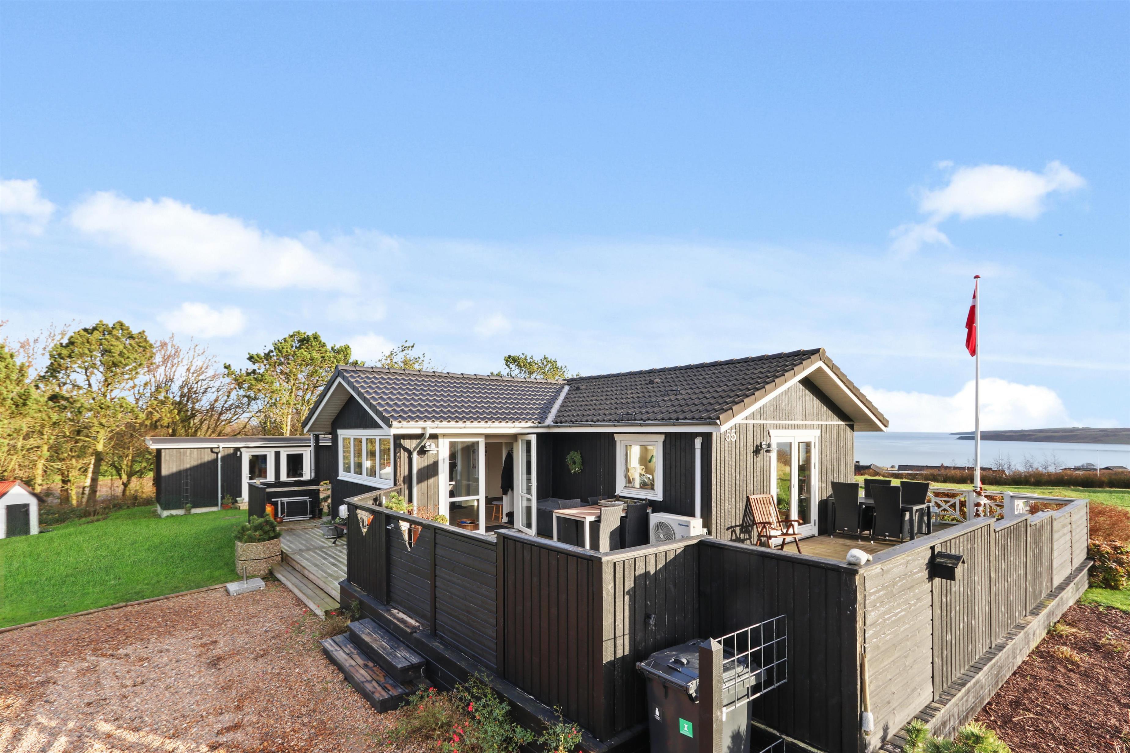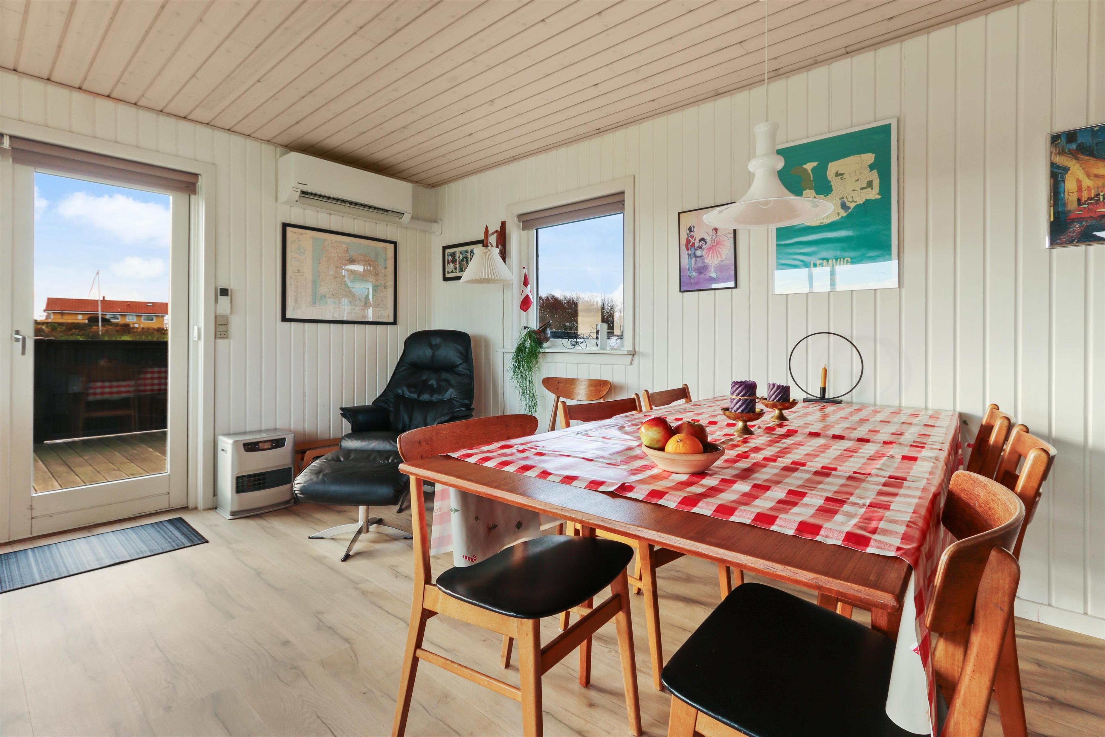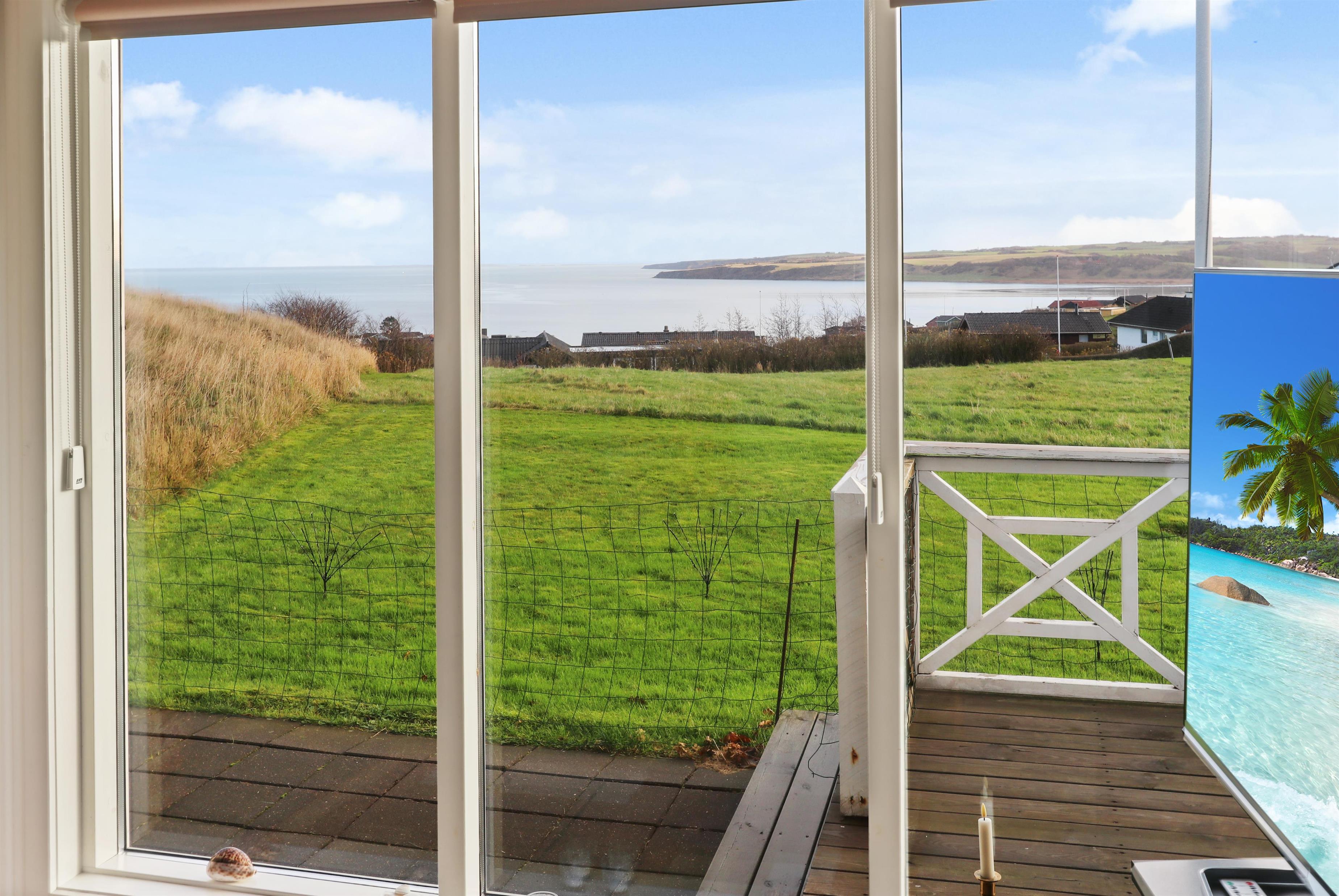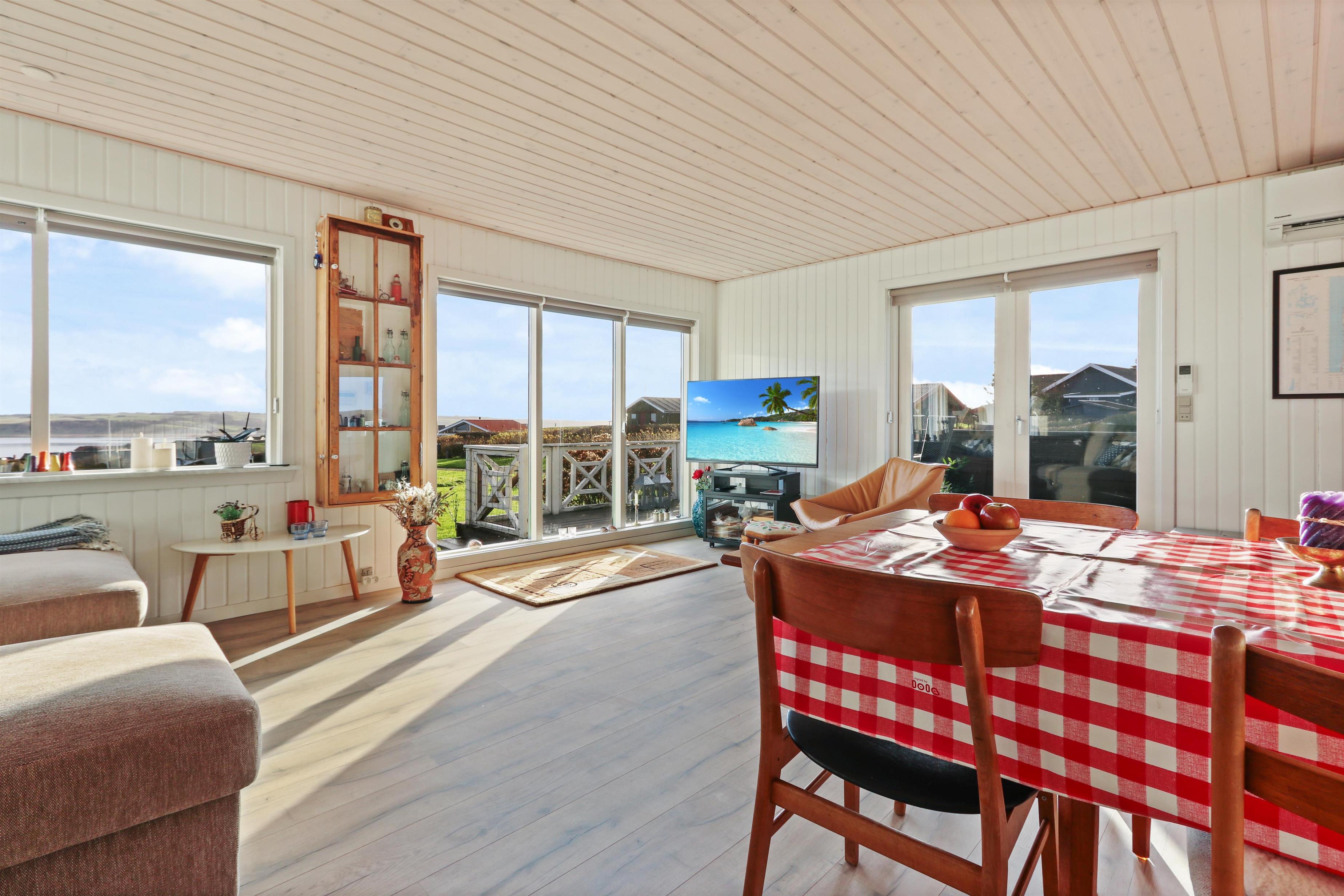 Feriehuset har en størrelse på 85 m2 og er flot istandsat i 2020 og løbende. Når man træder ind i huset, står man i husets dejlige lyse og indbydende hjerterum, som består af kombineret køkken og stue. Fra stuen og køkkenet er der udgang til husets store terrasse, hvorfra udsigten er et levende maleri. Husets køkken er udstyret med induktionskogeplader, indbygningsovn, emhætte, mikroovn, opvaskemaskine og køle-/fryseskab. Køkkenet har et stort vinduesparti, der giver et flot lysindfald og Vesterhavet kan anes i horisonten. Går man videre fra køkkenet bliver man mødt af stuen der er hyggelig og personlig indrettet. Stort vinduesparti giver dejligt lys til hele rummet, som også er med til at gøre stuen mere rummelig og herfra kan udsigten mod Limfjorden nydes. Stuen er udstyret med polstermøbler, fjernsyn hvorfra man kan streame egne apps via Chromecast og der er en DAB-radio. I stuen er der opsat en varmepumpe, der er med til at holde strømforbruget nede. Stuen giver plads til hele familien og er indbydende at tilbringe film- og spille-aftener. Fra stue og køkken kommer man ud i gangen, hvorfra man kommer til badeværelset og soveværelserne. Badeværelset er optimalt udnyttet og her forefindes toilet, håndvask og bruser. Desuden er der en vaskemaskine, hvis tøjet skulle trænge til en vask i løbet af ferien. Huset har 3 soveværelser, hvor det største er med 1 dobbeltseng og der er adgang til et eget toilet. Desuden har det store soveværelse også egen udgang til terrassen. Det andet soveværelse er med 1 dobbeltseng og i det sidste soveværelse er der 2 køjesenge. Til de mindste gæster er der 1 barnestol til rådighed.