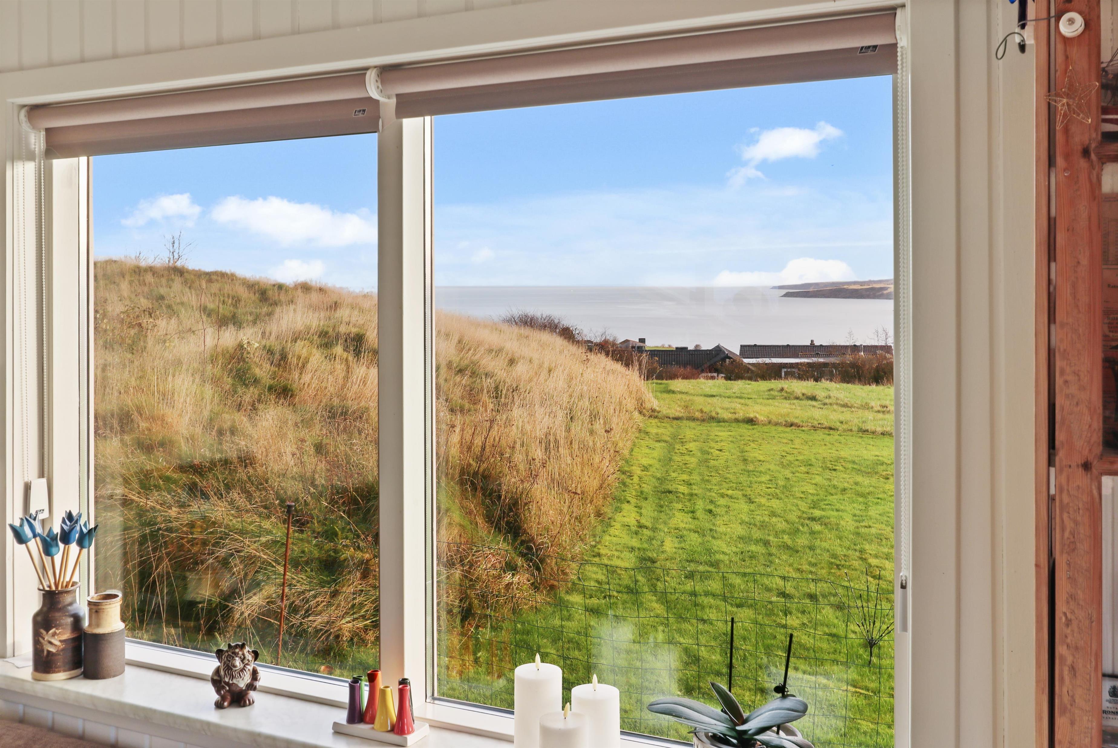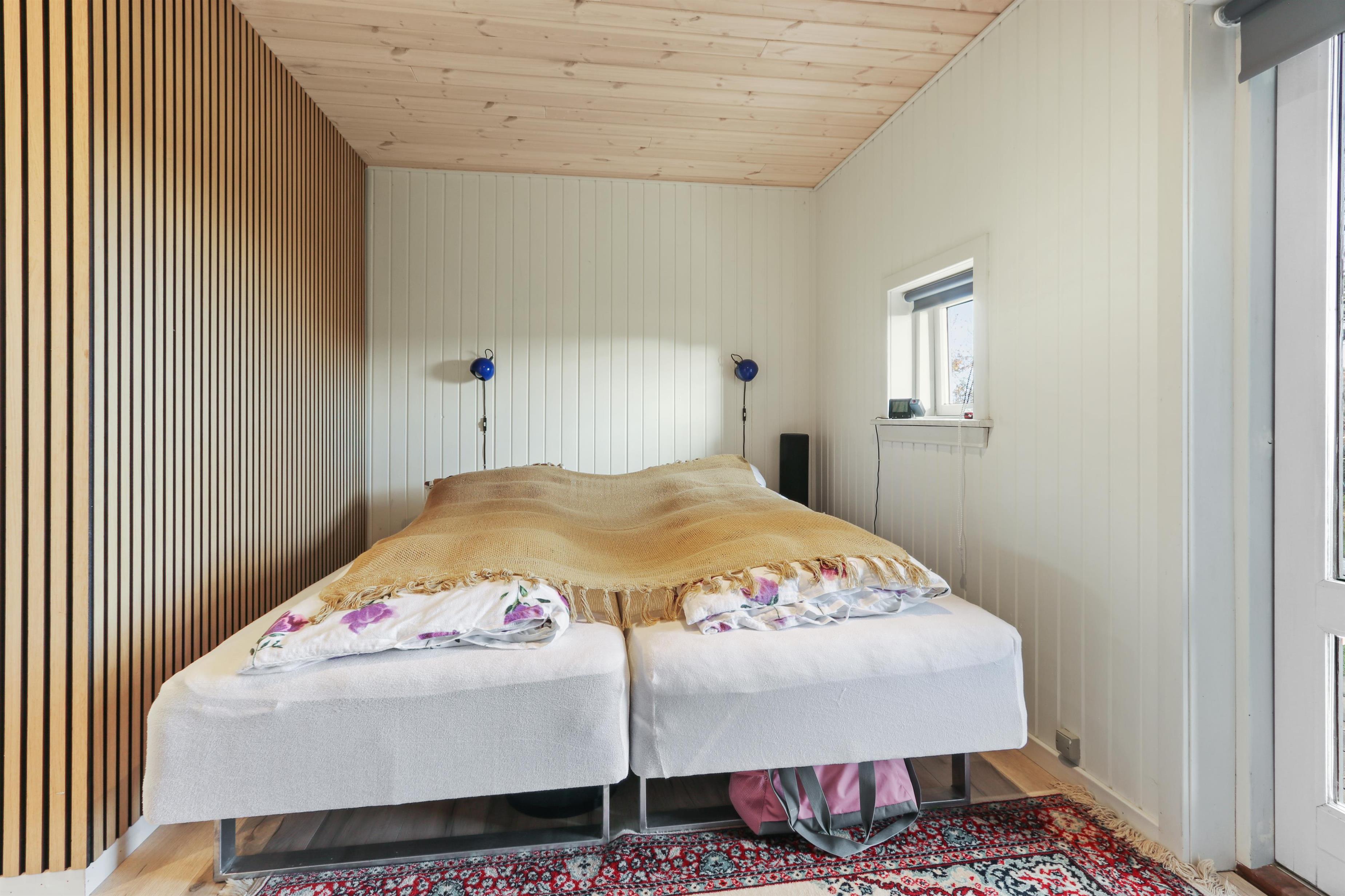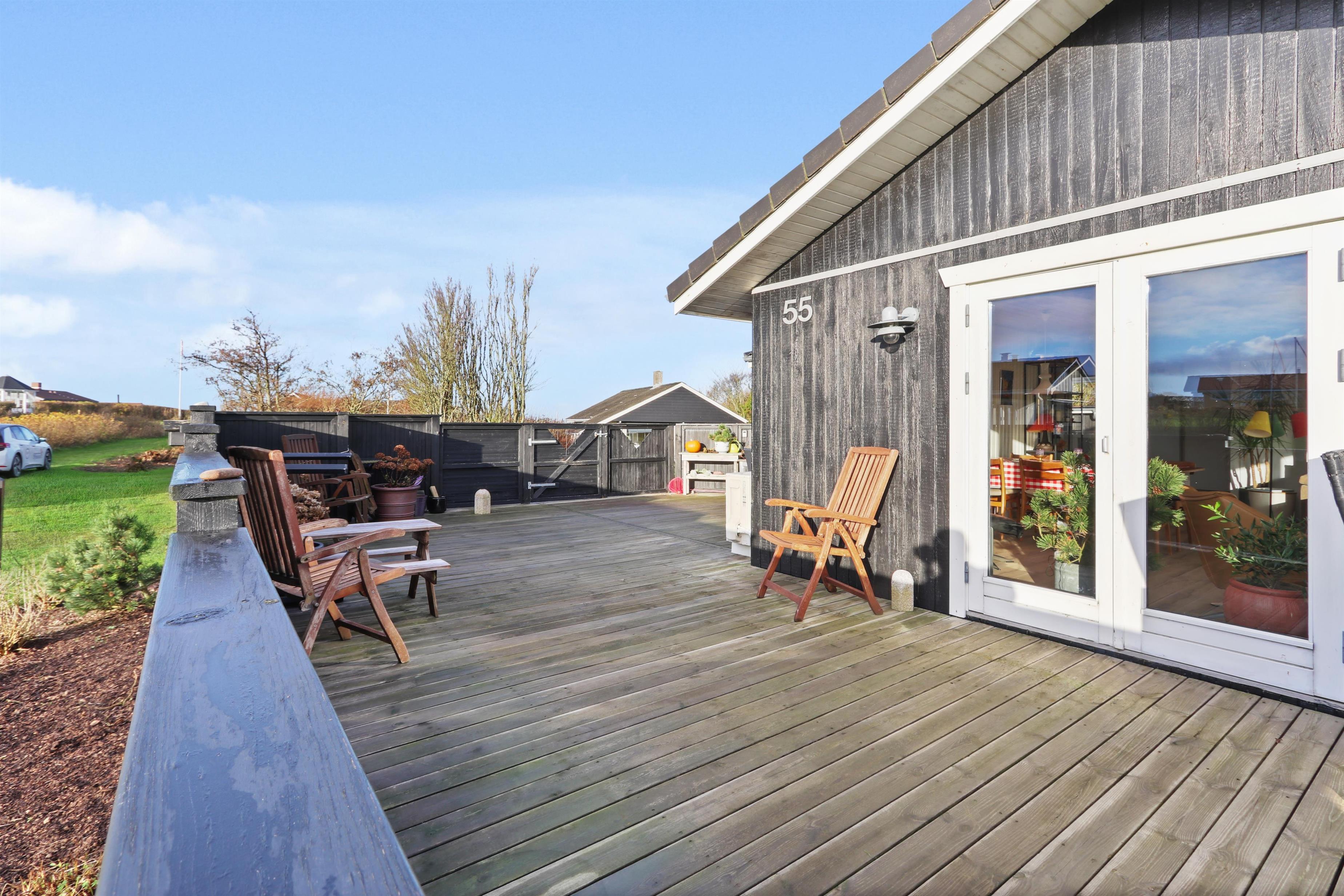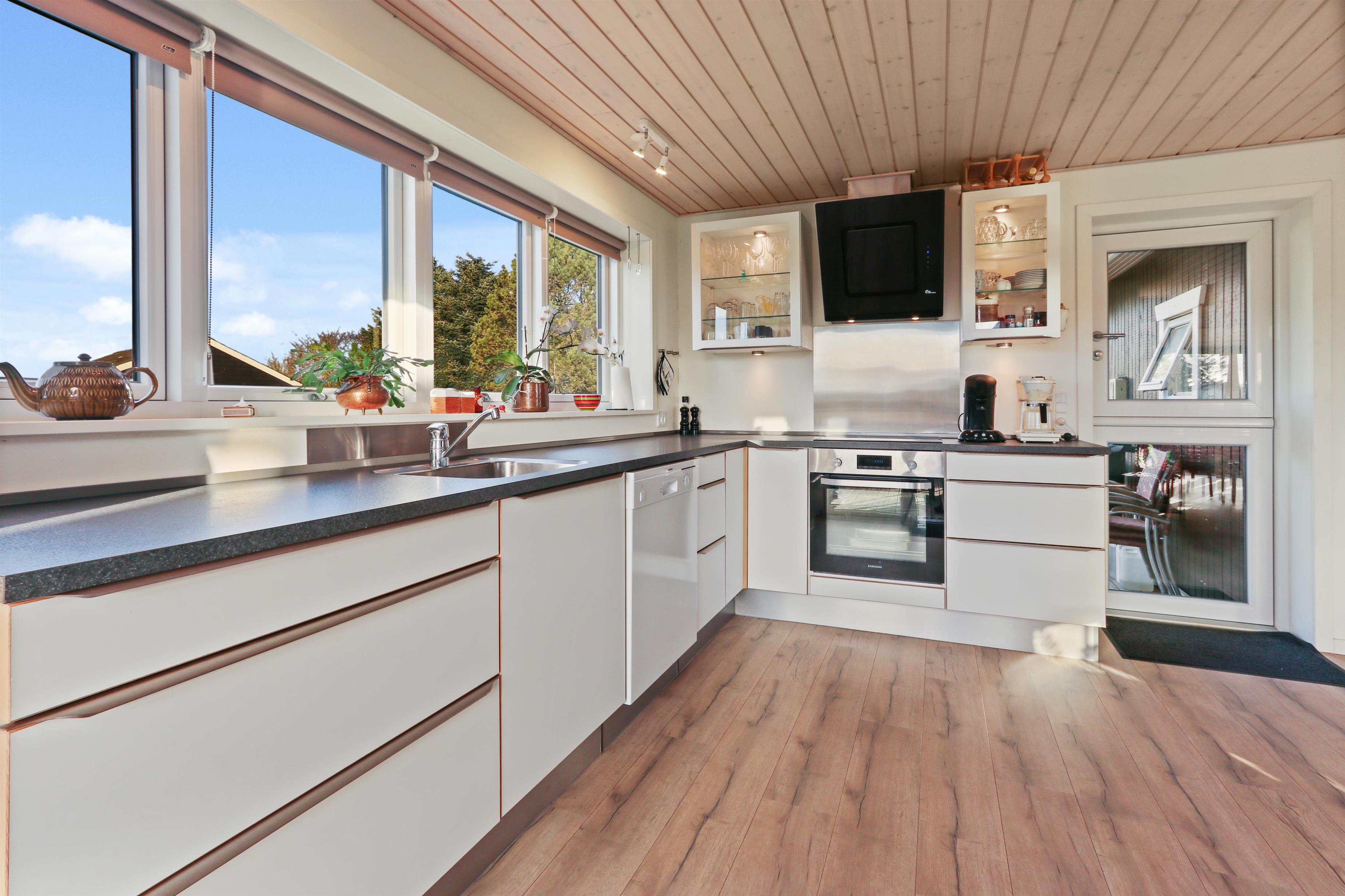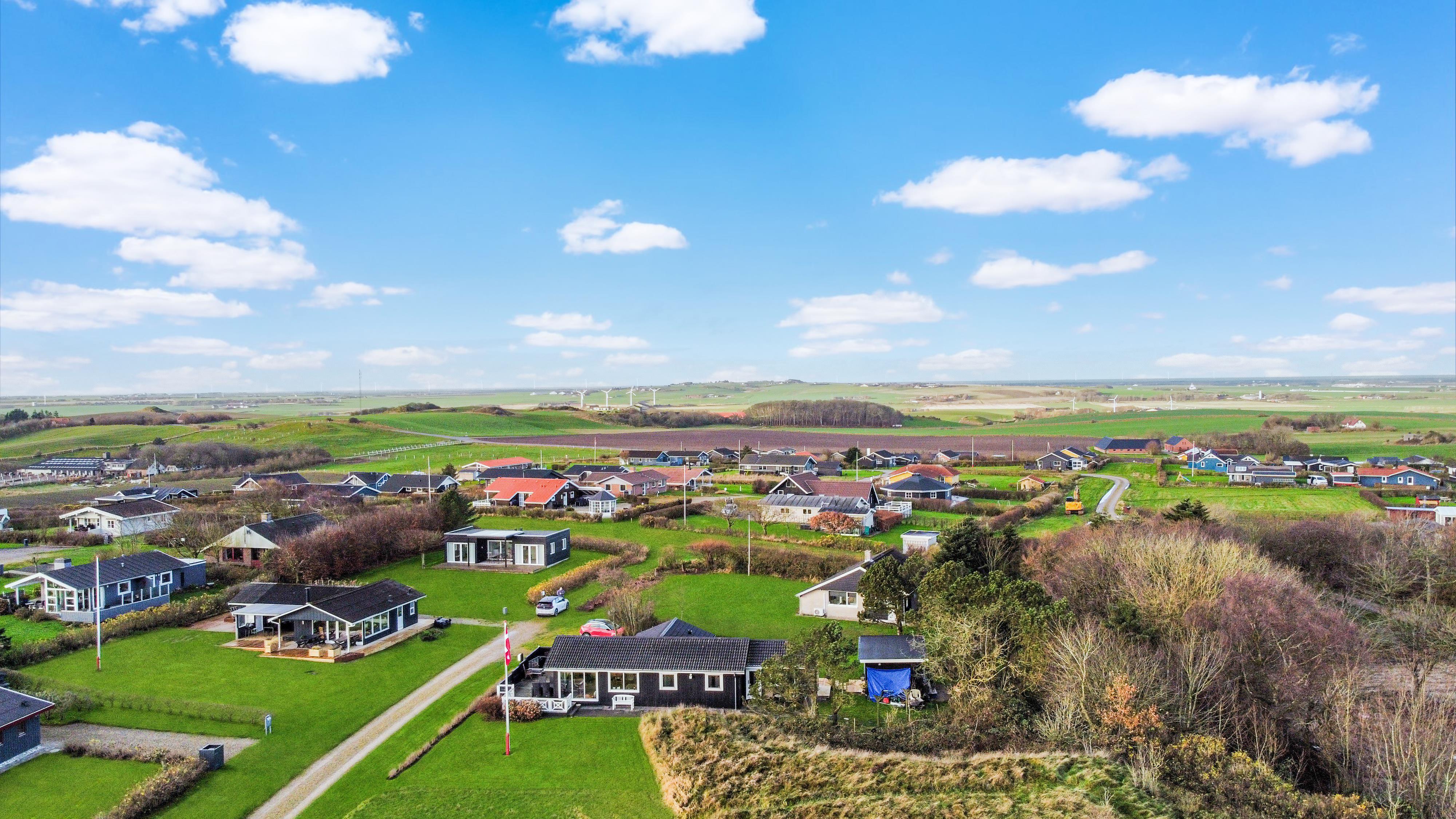 Feriehuset har en størrelse på 85 m2 og er flot istandsat i 2020 og løbende. Når man træder ind i huset, står man i husets dejlige lyse og indbydende hjerterum, som består af kombineret køkken og stue. Fra stuen og køkkenet er der udgang til husets store terrasse, hvorfra udsigten er et levende maleri. Husets køkken er udstyret med induktionskogeplader, indbygningsovn, emhætte, mikroovn, opvaskemaskine og køle-/fryseskab. Køkkenet har et stort vinduesparti, der giver et flot lysindfald og Vesterhavet kan anes i horisonten. Går man videre fra køkkenet bliver man mødt af stuen der er hyggelig og personlig indrettet. Stort vinduesparti giver dejligt lys til hele rummet, som også er med til at gøre stuen mere rummelig og herfra kan udsigten mod Limfjorden nydes. Stuen er udstyret med polstermøbler, fjernsyn hvorfra man kan streame egne apps via Chromecast og der er en DAB-radio. I stuen er der opsat en varmepumpe, der er med til at holde strømforbruget nede. Stuen giver plads til hele familien og er indbydende at tilbringe film- og spille-aftener. Fra stue og køkken kommer man ud i gangen, hvorfra man kommer til badeværelset og soveværelserne. Badeværelset er optimalt udnyttet og her forefindes toilet, håndvask og bruser. Desuden er der en vaskemaskine, hvis tøjet skulle trænge til en vask i løbet af ferien. Huset har 3 soveværelser, hvor det største er med 1 dobbeltseng og der er adgang til et eget toilet. Desuden har det store soveværelse også egen udgang til terrassen. Det andet soveværelse er med 1 dobbeltseng og i det sidste soveværelse er der 2 køjesenge. Til de mindste gæster er der 1 barnestol til rådighed.