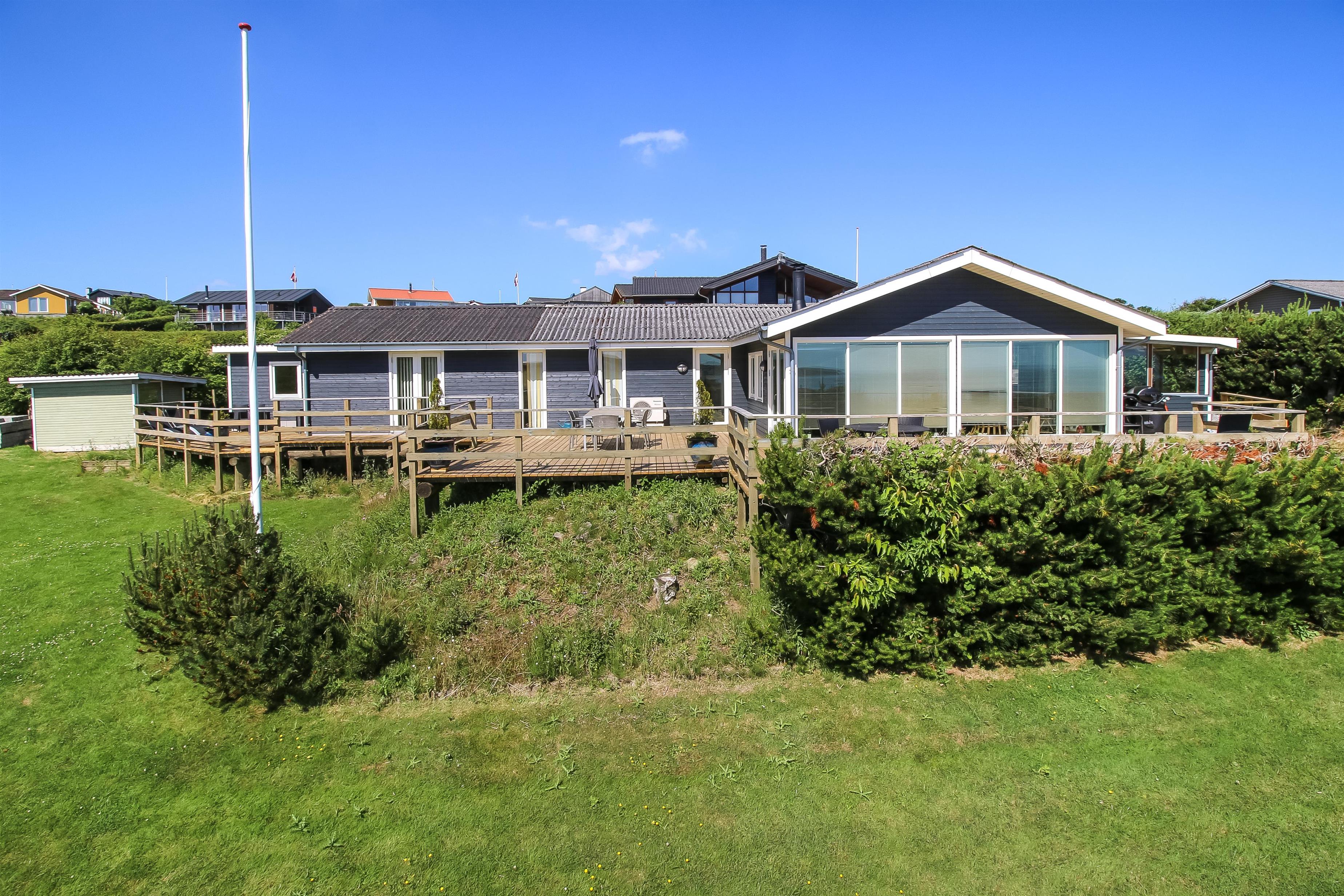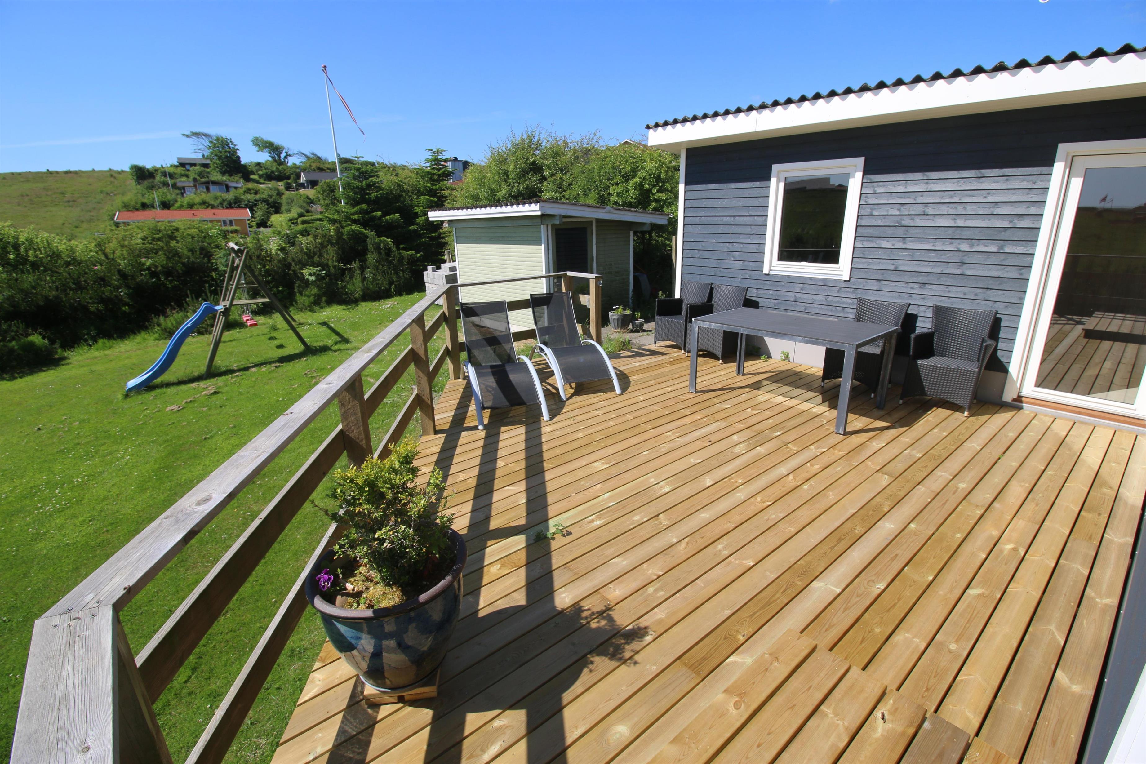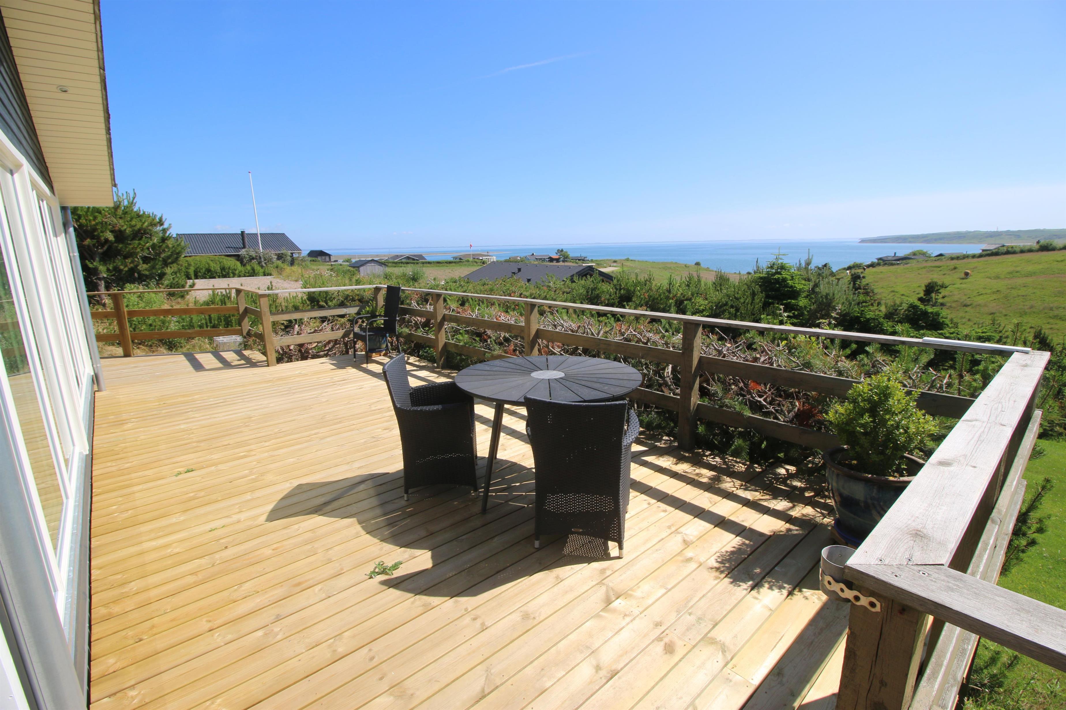 Fra køkkenet er der udgang til en stor udestue med spiseplads og fra opholdsstuen er der udgang til flere terrasser alle med panoramaudsigt over Limfjorden. Herudover findes der mange lækroge hvor man kan sidde ugeneret og nyde udsigten. På terrasserne er der liggestole, gasgrill og massere af havemøbler. Højt beliggende for enden af en blind vej, på en fantastisk velholdt, skrånende grund med mange god læ- og solkroge samt mange udsigtspunkter. Fra huset findes der et dejligt stisysten som fører direkte ned til vandet. kun ca 500m til indkøb. Der er gynger til de mindste gæster