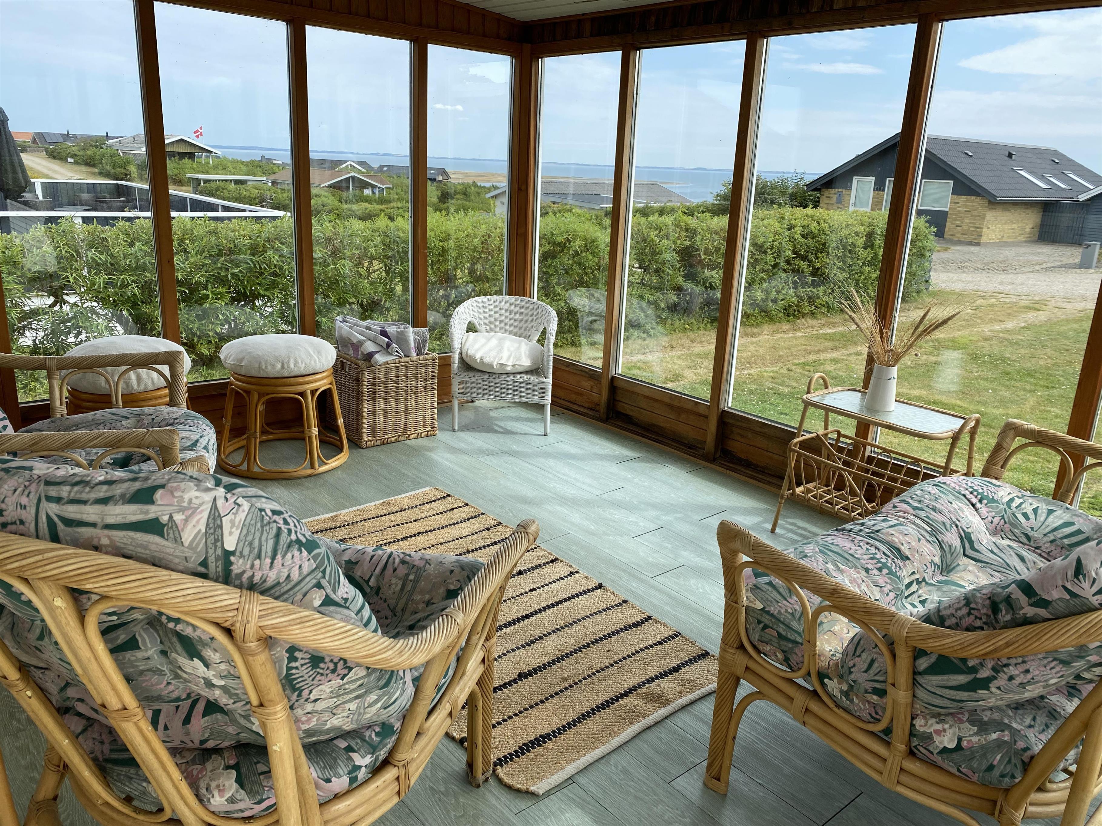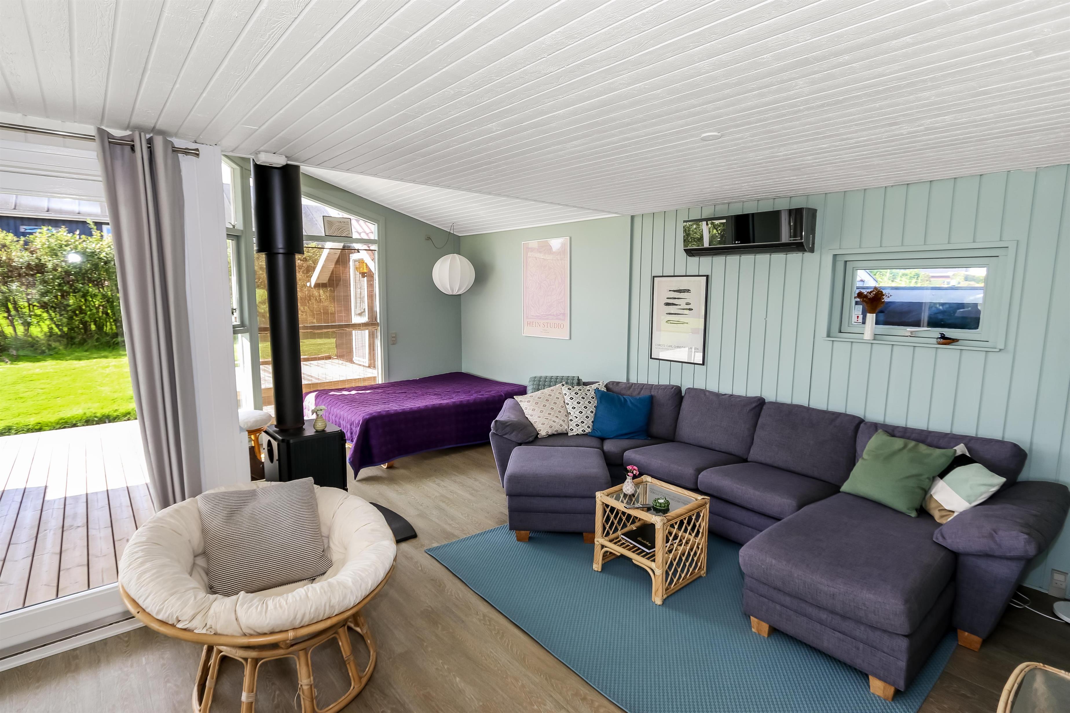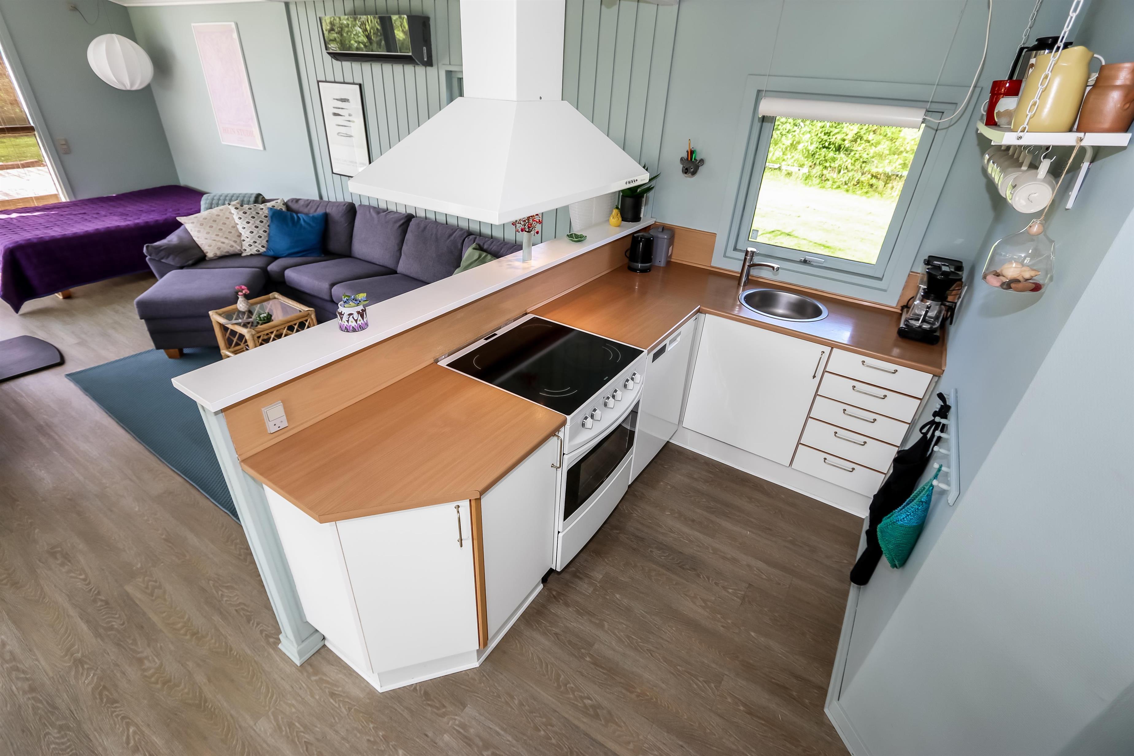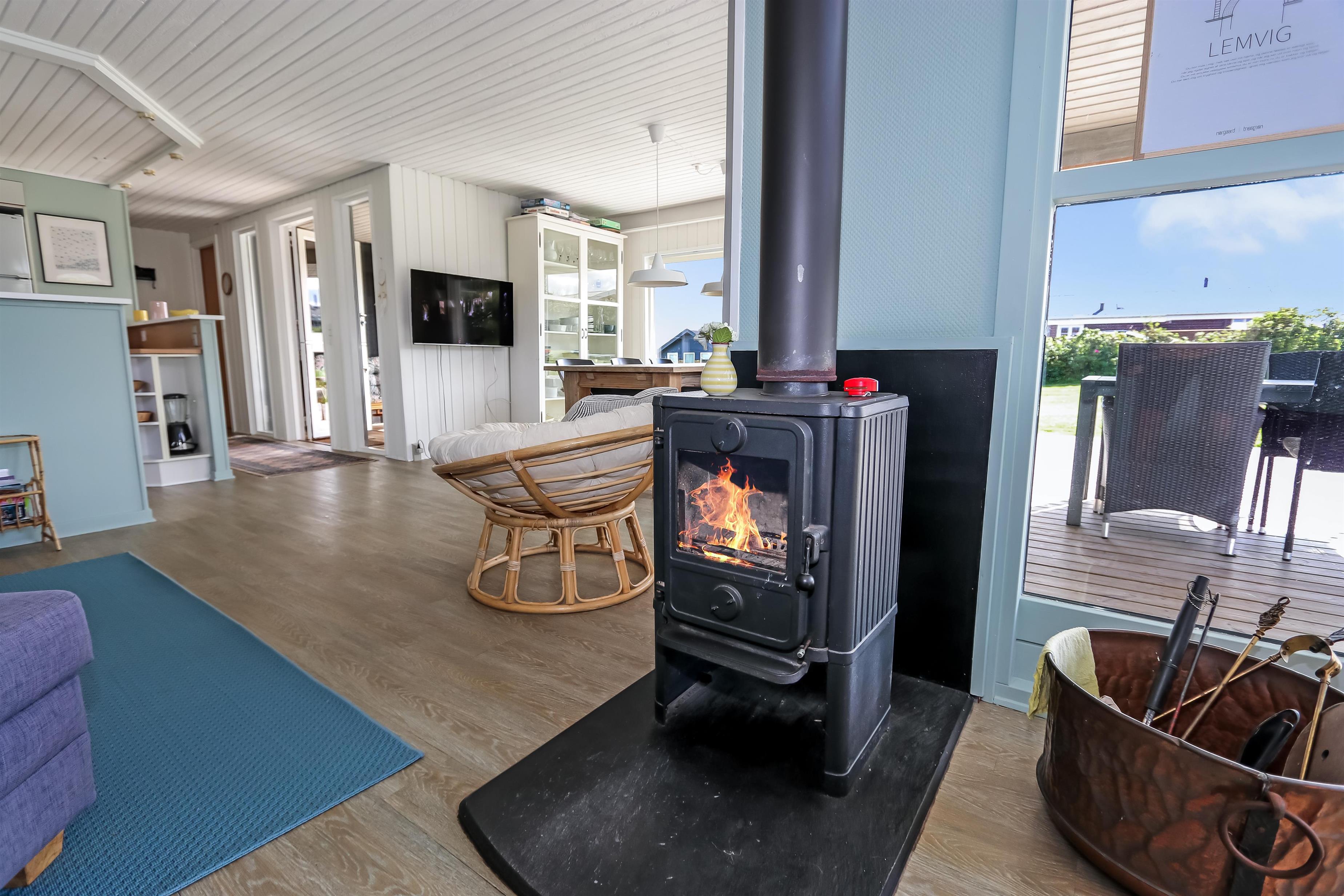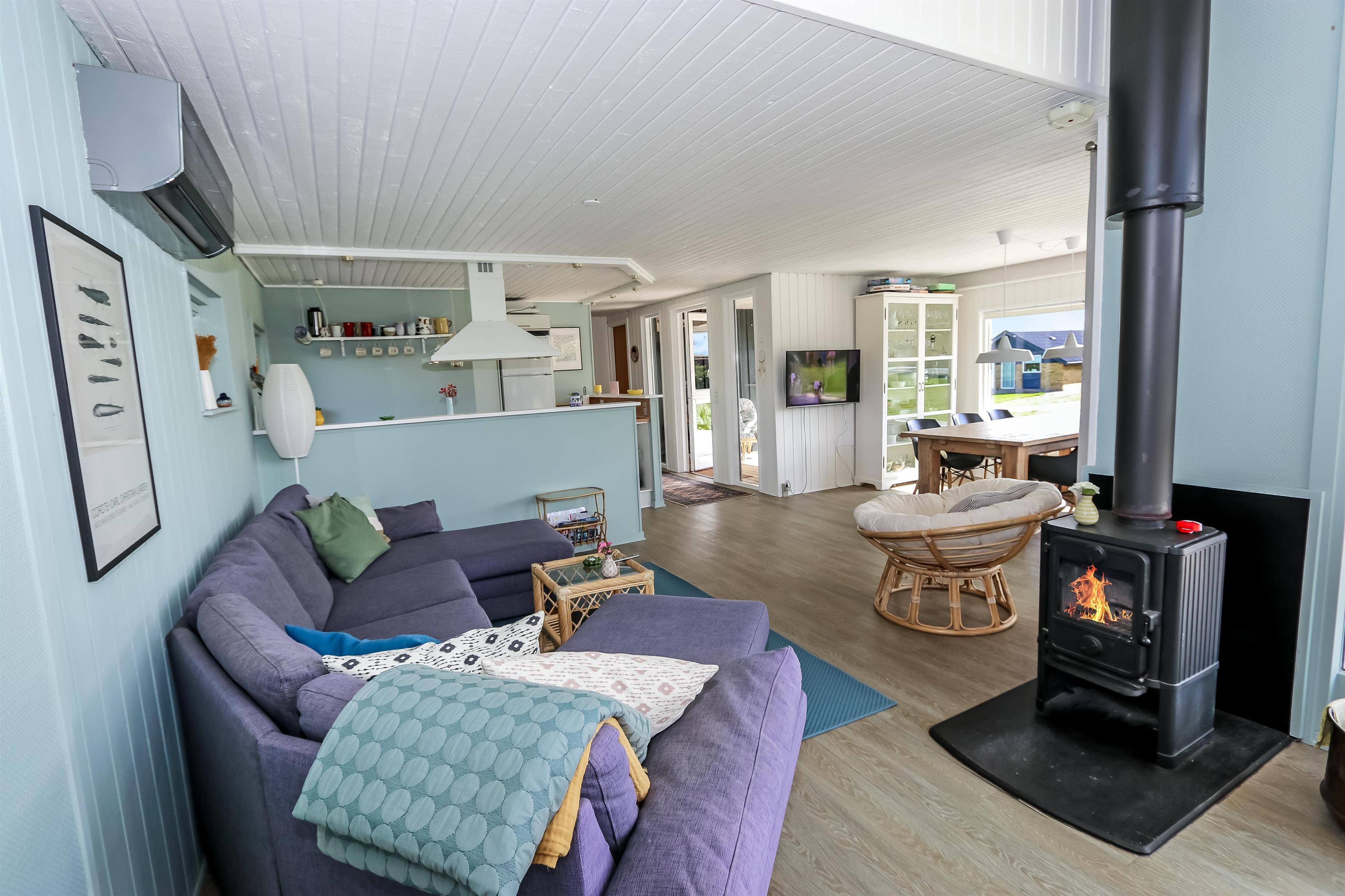 Feriehus på ca. 82 m2 fra 1982 og renoveret i 2010. Kombineret opholdsstue og køkkenhjørne. Opholdsstuen er pænt møbleret med polstermøbler, boksseng med sengetæppe, som er ideel til børn og barnlige sjæle, TV med størstedelen af de danske streamingstjenester og tyske kanaler samt DVD / CD og radio. Slap af foran den knitrende brændeovn, som sammen med varmepumpen hjælper med at reducere udgiften til varmeregningen eller nyd udsigten fra stuen til Limfjorden.