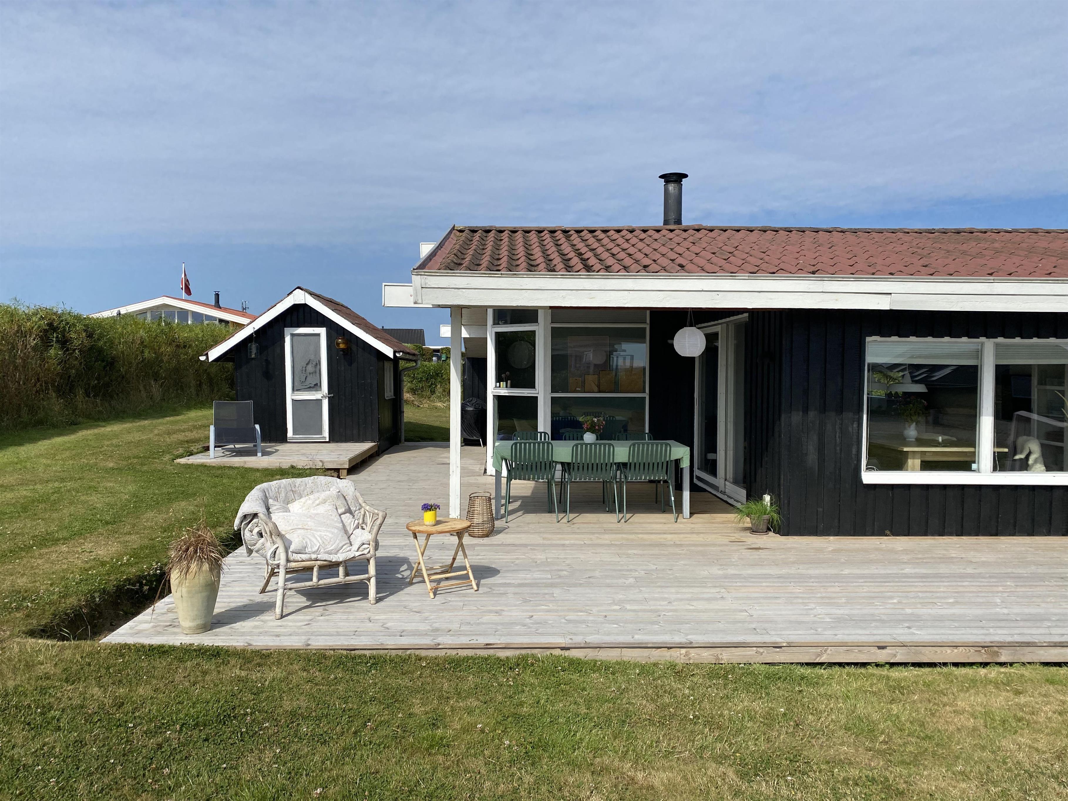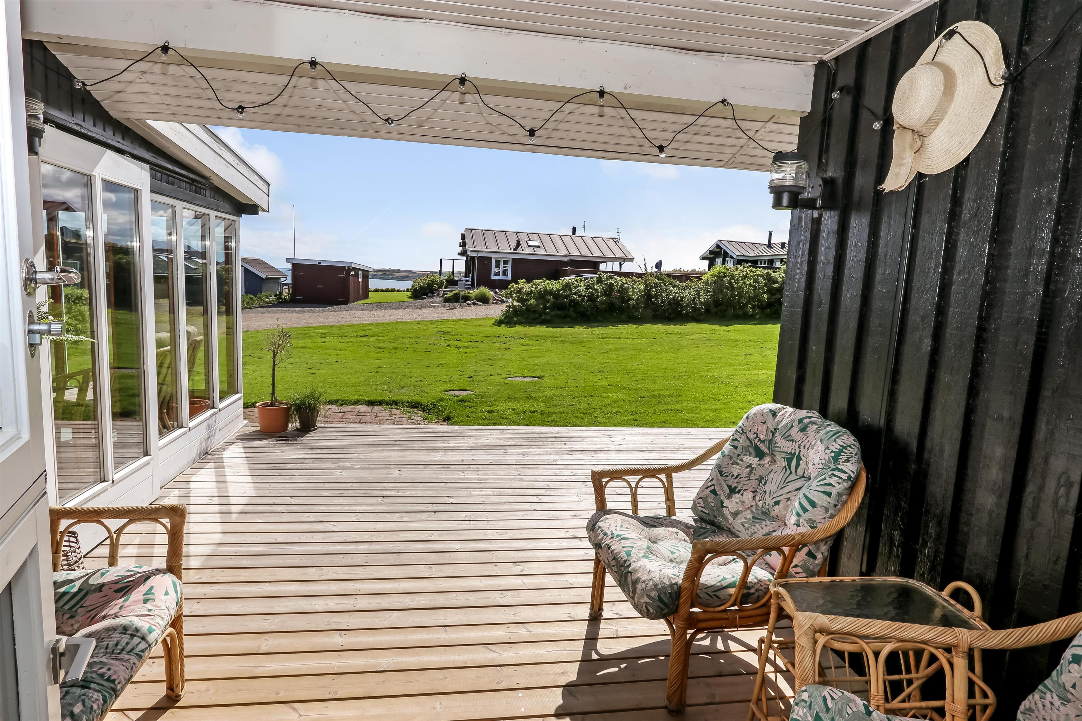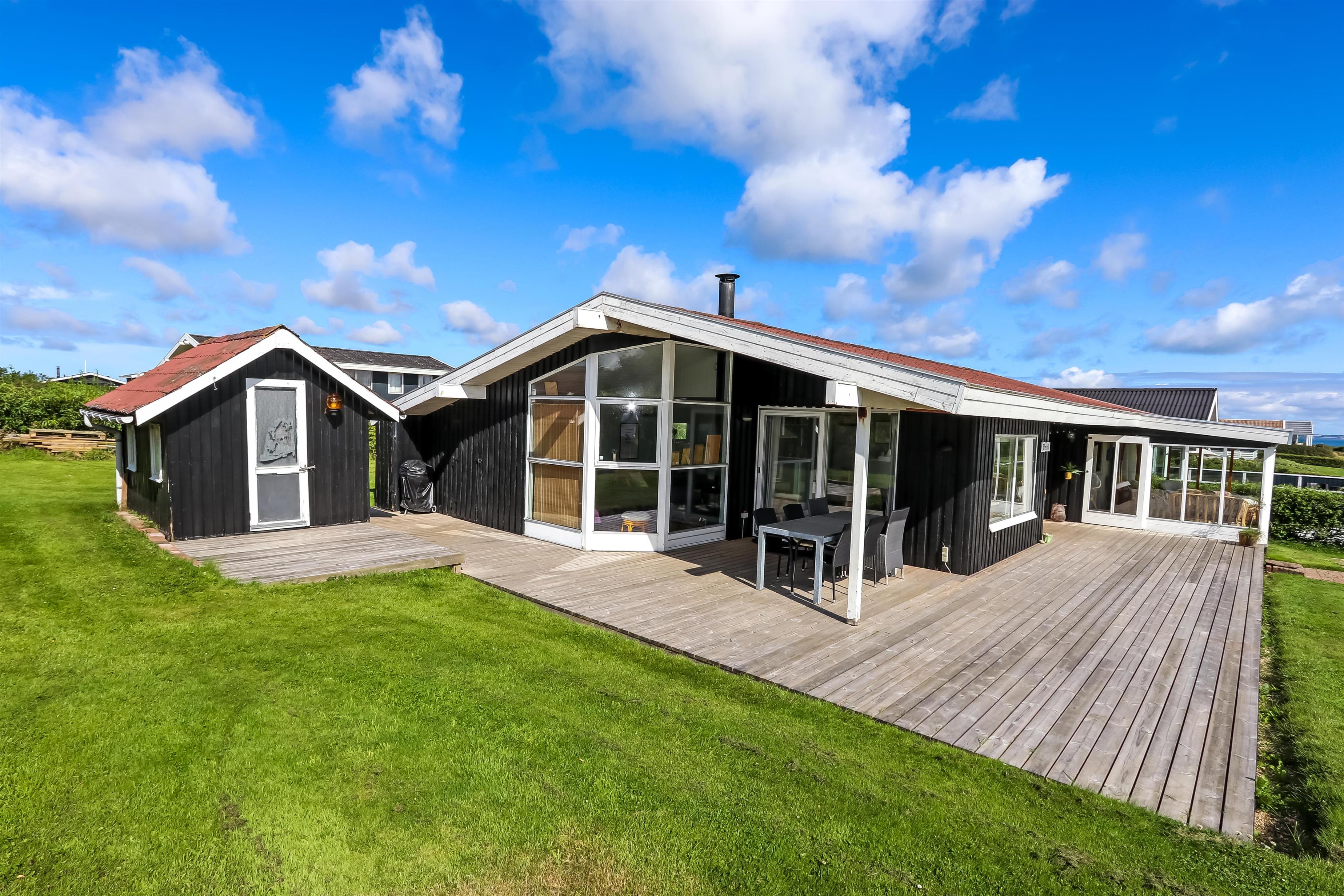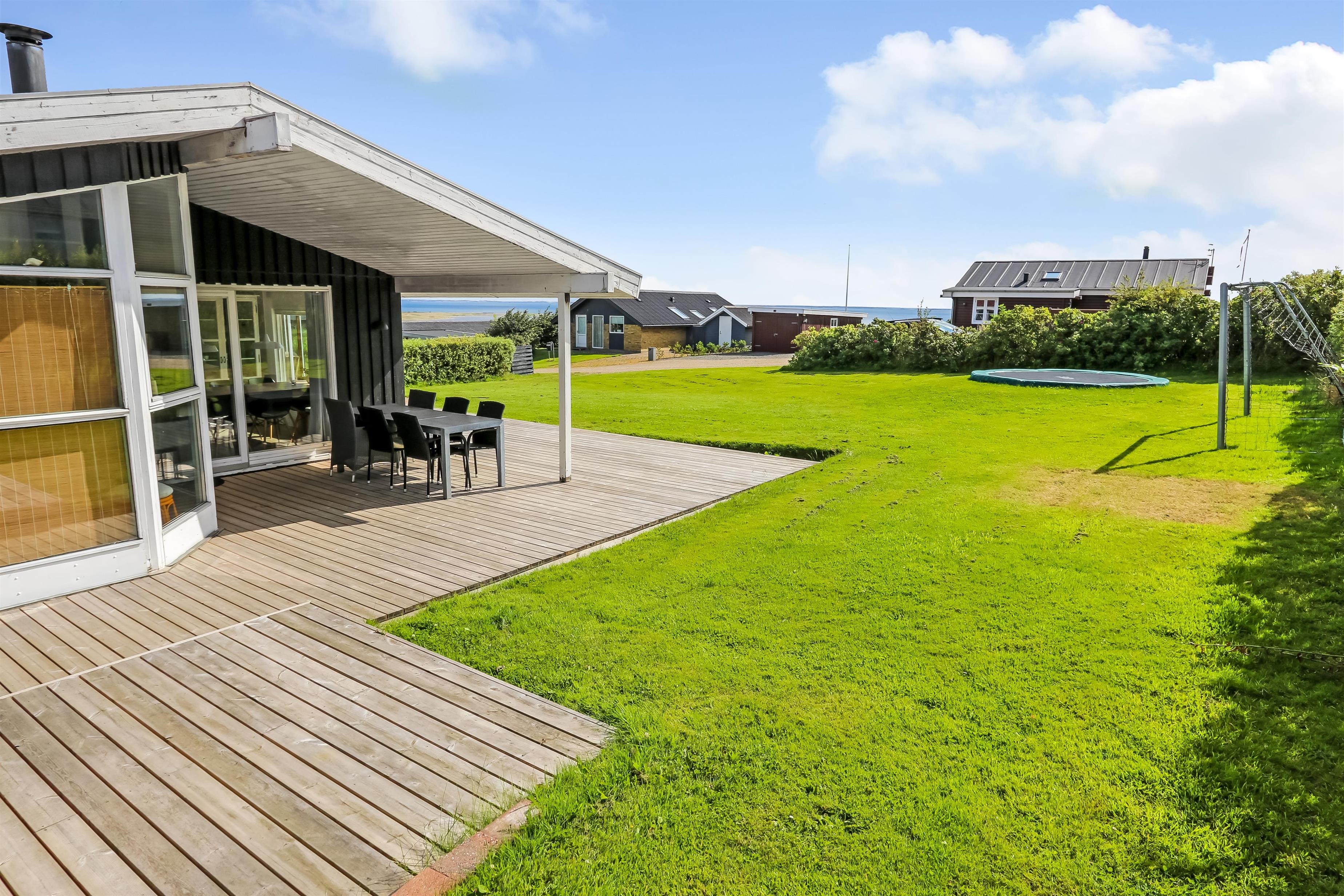 Huset ligger på en ca. 820 m2 stor grund. Fantastisk, delvist overdækket og nyanlagt terrasseanlæg med havemøbler, grill og liggestole. Her kan der altid findes en plads i solen. Havemøbler, solvogn og grill kan flyttes rundt på terrassen efter behag. Fra terrassen er der adgang til en pragtfuld udestue med kurvemøbler og kig til Limfjorden. Også på bagsiden af huset er der en dejlig, delvis overdækket træterrasse med havemøbler og udsigt over landskabet. Højt, ugeneret beliggende på en rolig stikvej. Velholdt grund med trampolin og kun 300 m fra Limfjorden. Fra huset findes der stisystemer, som på få minutter fører direkte ned til fjord, badestrand og badebroer. Nær ved huset ligger også den nye flotte naturlegeplads i træ med rutsjebaner, gynger og meget andet. Her findes også iskiosk og restaurant, som har åbnet i sæsonen. Der er i øvrigt kun ca. fire km til Lemvig by, som er en livlig handelsby med mange butikker, fiskerestaurant, biograf, skaterbane, museum mm.
