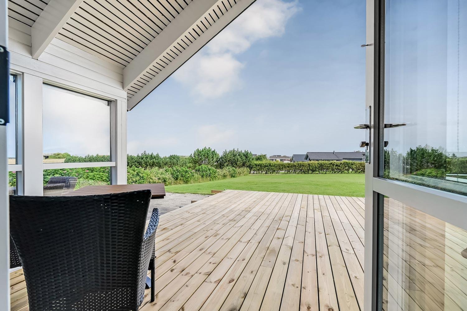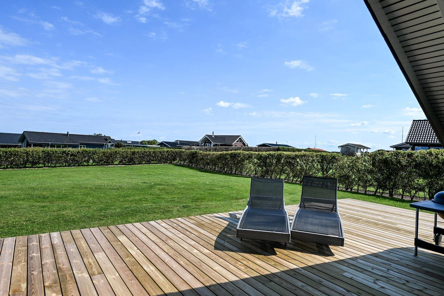 Beliggende på en ca. 1.100 m2 stor, velholdt, delvis indhegnet grund, hvorfra der er en flot udsigt over Limfjorden. Stort, delvist overdækket terrasseanlæg med havemøbler, liggestole, parasol og grill, som kan flyttes rundt på terrassen alt efter vejr og vind og efter hvor der findes en plads i solen. Terrassen går hele vejen rundt om huset.