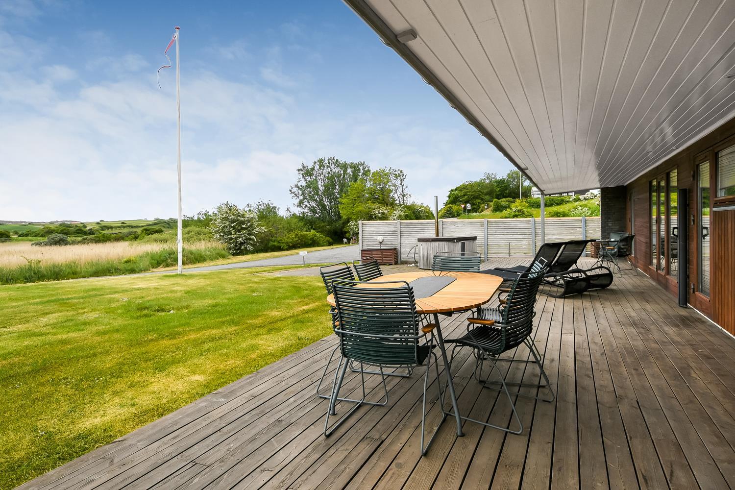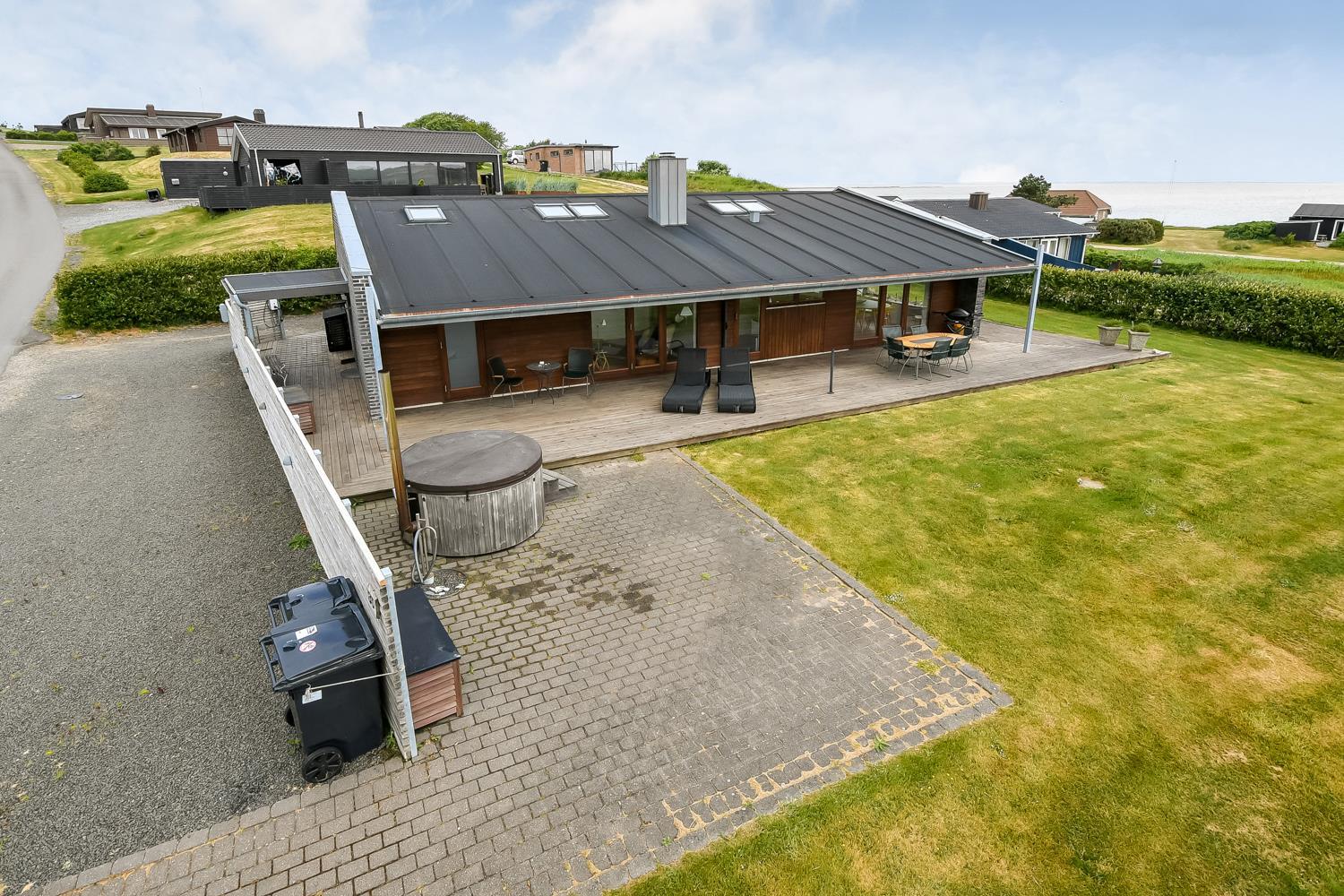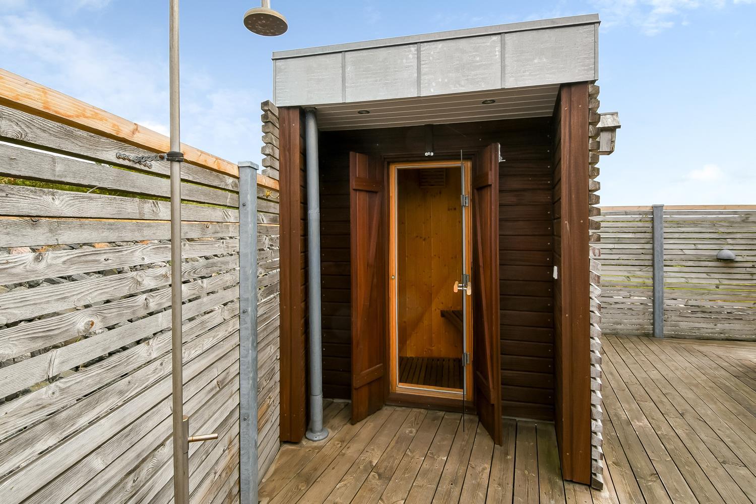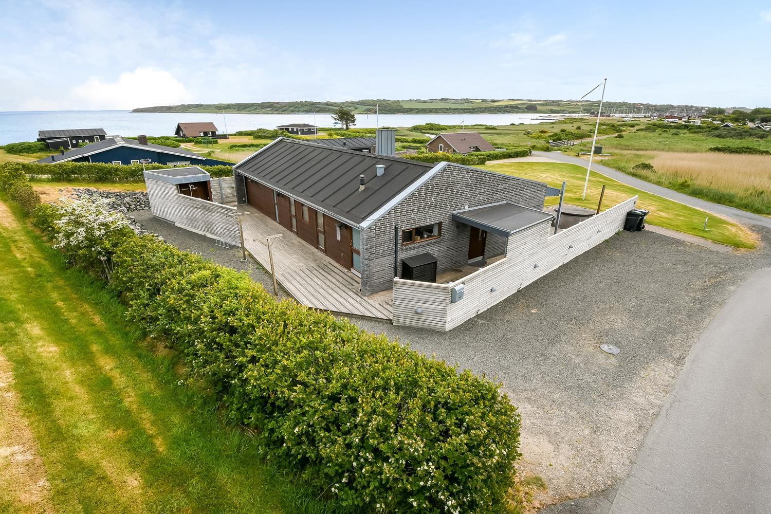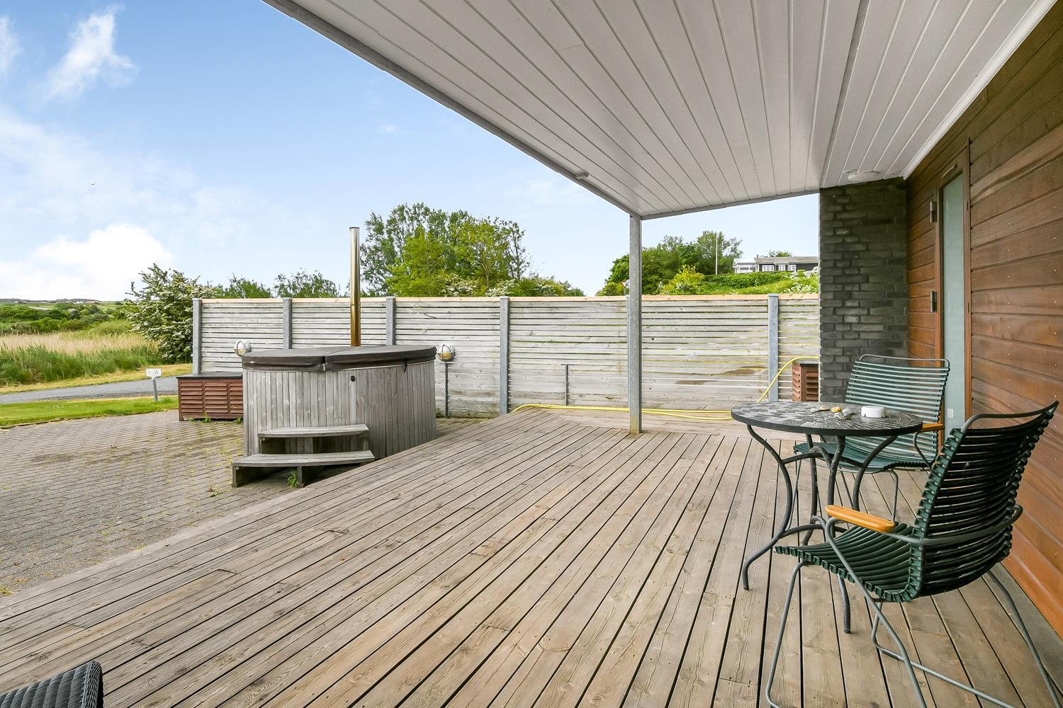 Huset er beliggende på en 1357 m2 stor grund tæt ved Limfjorden. Fra stuen er der udgang til et delvist overdækket, unikt terrasseanlæg. Lækre havemøbler, liggestole og grill som kan flyttes rundt på terrasserne alt efter vejr og vind og efter hvor der findes en plads i solen. Herudover er der også en vildmarksspa med opvarmes med brænde og udebruser samt adgang til udesauna. Helt fantastiske udearealer som er unikke og specielle. Fra huset findes der er dejligt stisystem, som på få minutter fører direkte ned til vandet. Ikke langt fra huset ligger den nye, flotte naturlegeplads i træ med fodboldbane og rutsjebane og der er heller ikke langt til indkøb eller til stranden. Unikt beliggende feriehus til den perfekte ferieoplevelse.