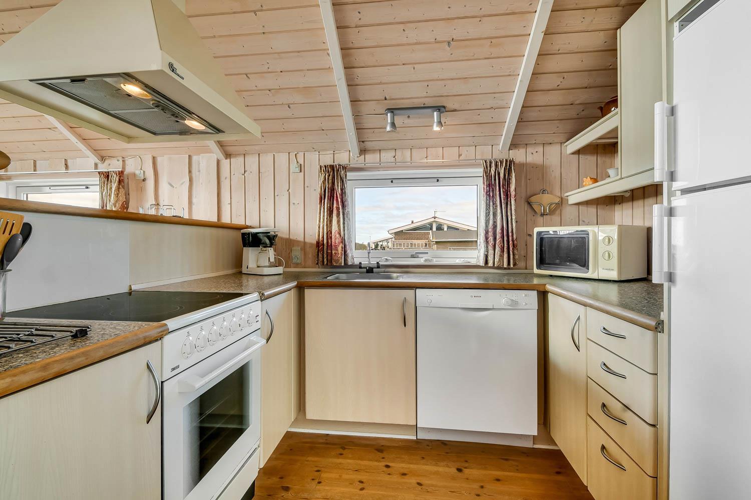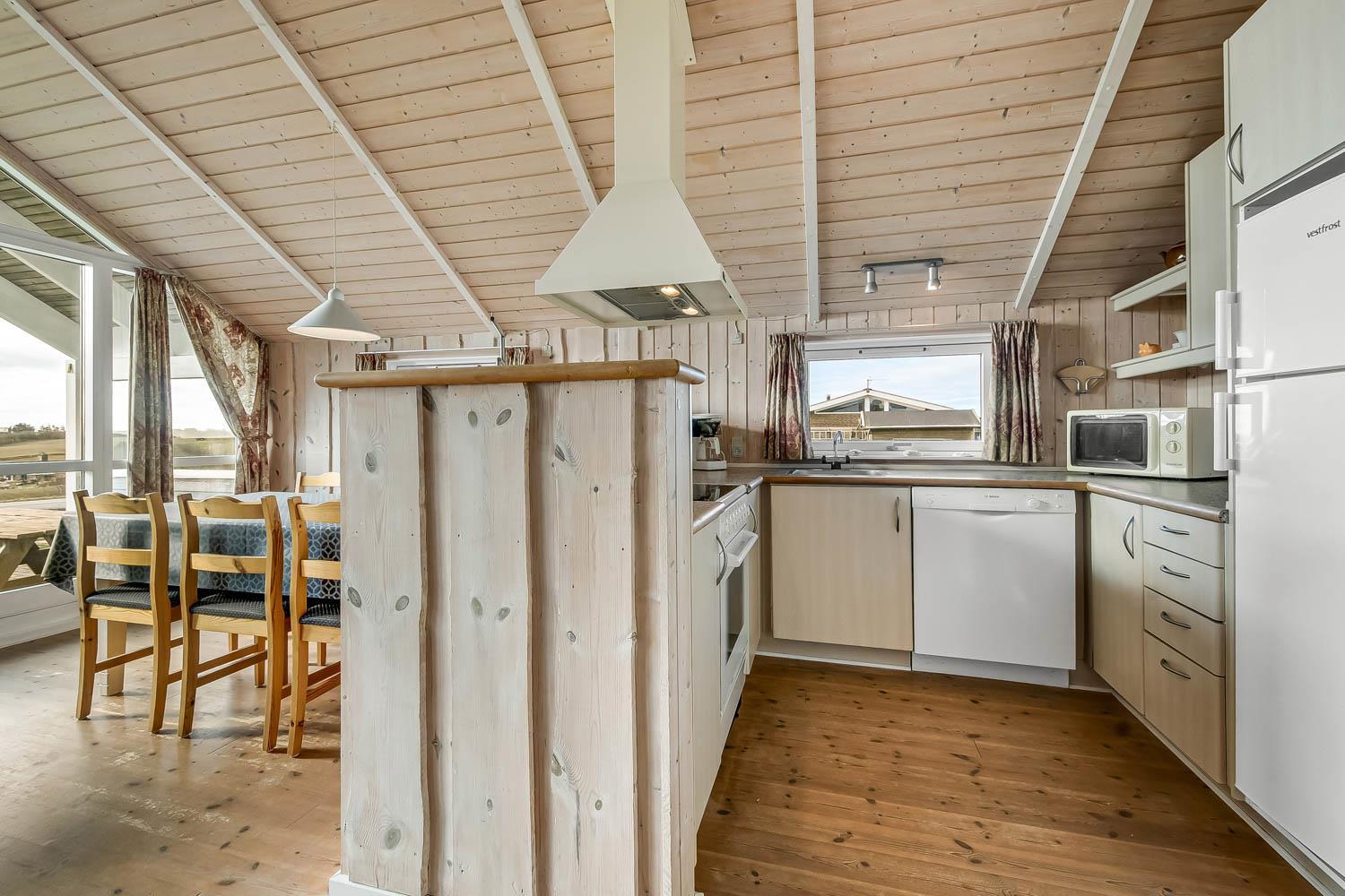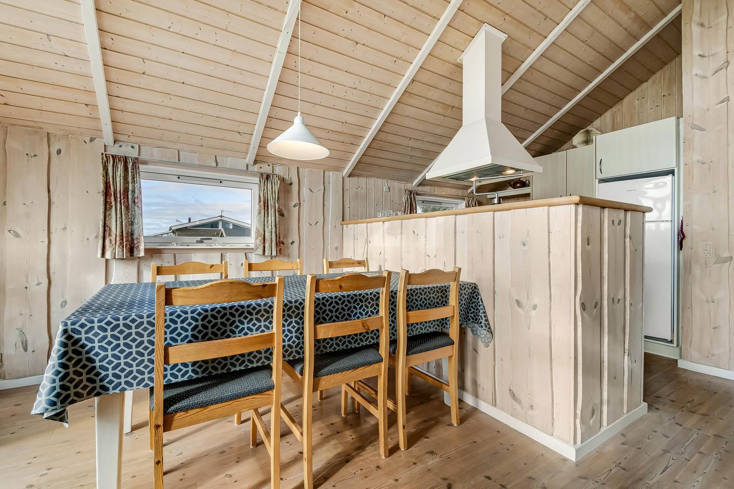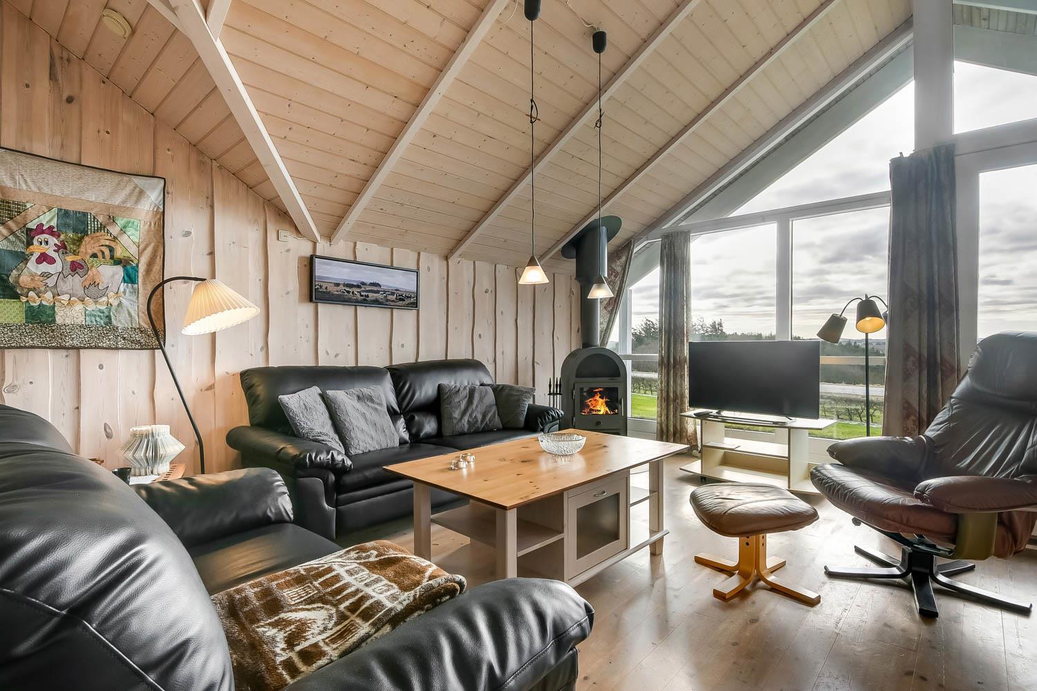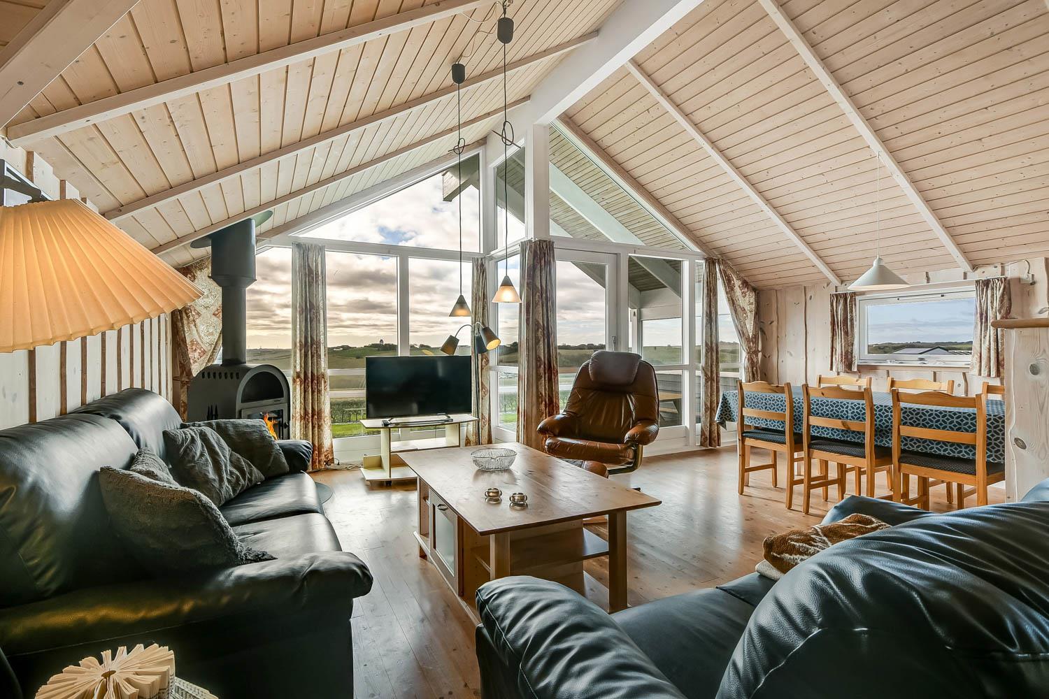 Indretningen er lys og indbydende med store vinduer, der fremhæver den imponerende udsigt. Loft til kip, moderne møbler, vægge og lofter i ludbehandlet træ samt trægulve overalt skaber en varm og hyggelig atmosfære. Køkkenafdeling med glaskeramisk komfur, køle-/fryseskab, opvaskemaskine og miniovn.