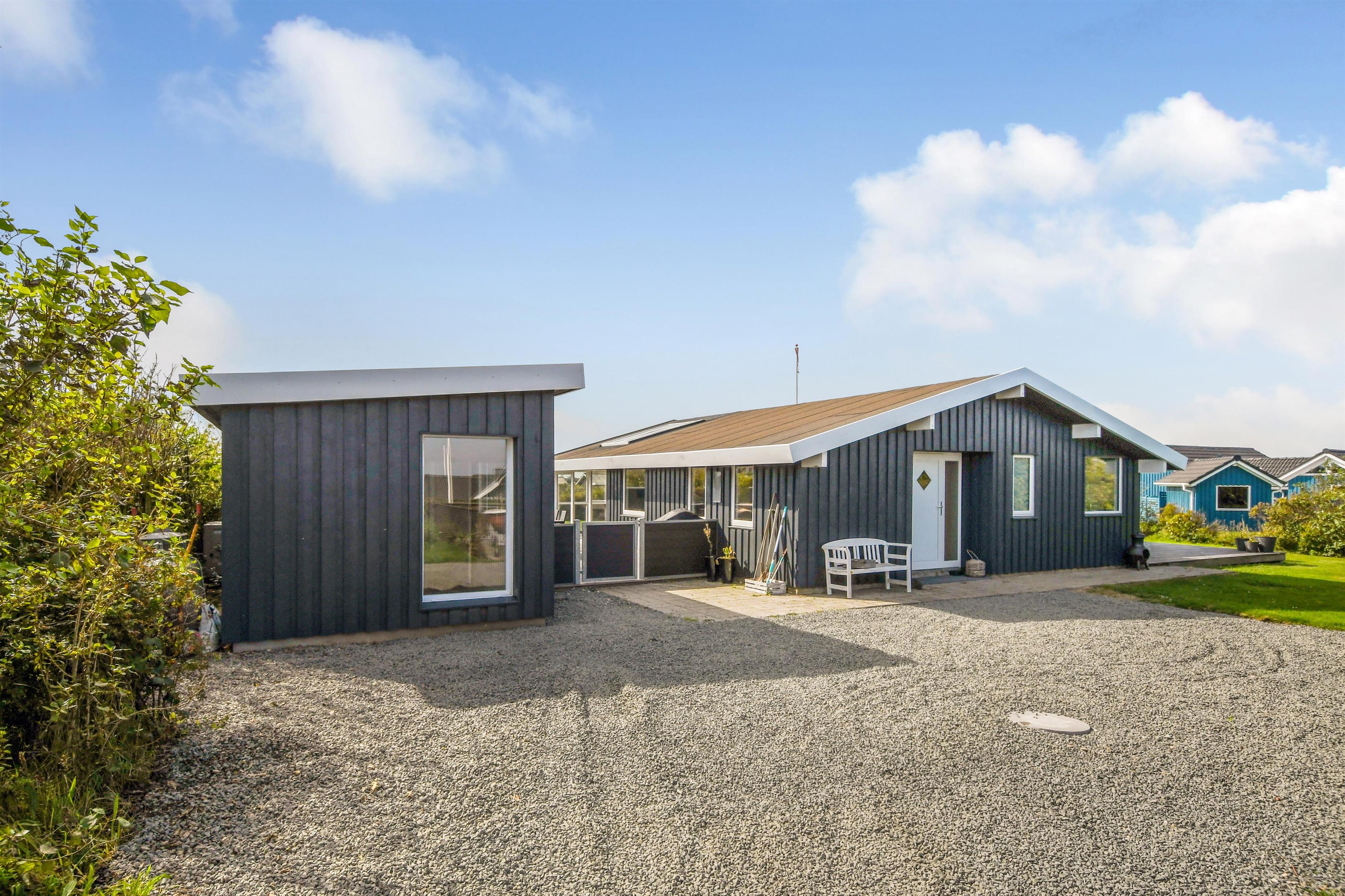 Huset ligger på en ca. 865 m² stor indhegnet grund, højt og ugeneret beliggende på en rolig stikvej. Velholdt indehegnet grund med trampolin, gynge og kun 700 meter fra stranden. Fantastisk, delvist overdækket og indhegnet terrasseanlæg med havemøbler, grill og liggestole. Her er også et skønt udendørs spabad, hvor man i al slags vejr kan sidde og nyde udsigten og om aftenen den stjerneklare himmel. Her kan der altid findes en plads i solen samt pragtfuldt kig til Limfjorden. Havemøbler, solvogn og grill kan flyttes rundt på terrassen efter behag. Også på bagsiden af huset er der en dejlig terrasse med havemøbler og udsigt over landskabet. Fra huset findes der stisystemer, som på få minutter fører direkte ned til fjord, badestrand og badebroer. Nær ved huset ligger også den nye flotte naturlegeplads, som er lavet i naturmaterialer og hvor der bl.a. er rutsjebaner, gynger og meget andet. Her findes også iskiosk og restaurant, som har åbent i sæsonen. Der er i øvrigt kun ca. fire km til Lemvig by, som er en livlig handelsby med mange butikker, fiskerestaurant, biograf, skaterbane, museum mm.